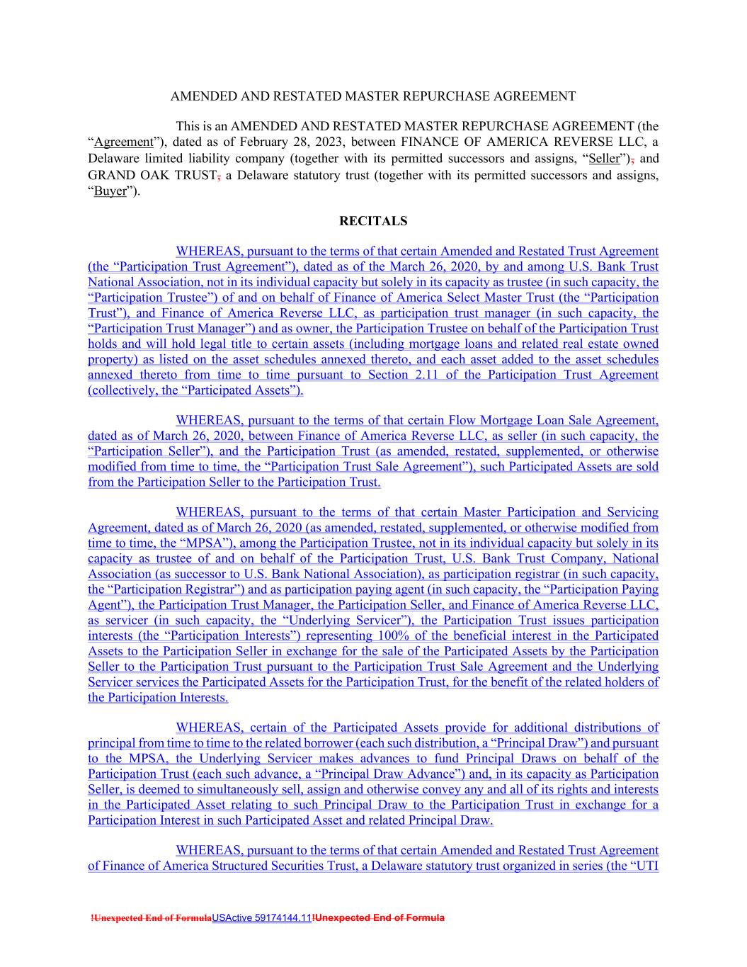 !Unexpected End of FormulaUSActive 59174144.11!Unexpected End of Formula AMENDED AND RESTATED MASTER REPURCHASE AGREEMENT This is an AMENDED AND RESTATED MASTER REPURCHASE AGREEMENT (the “Agreement”), dated as of February 28, 2023, between FINANCE OF AMERICA REVERSE LLC, a Delaware limited liability company (together with its permitted successors and assigns, “Seller”), and GRAND OAK TRUST, a Delaware statutory trust (together with its permitted successors and assigns, “Buyer”). RECITALS WHEREAS, pursuant to the terms of that certain Amended and Restated Trust Agreement (the “Participation Trust Agreement”), dated as of the March 26, 2020, by and among U.S. Bank Trust National Association, not in its individual capacity but solely in its capacity as trustee (in such capacity, the “Participation Trustee”) of and on behalf of Finance of America Select Master Trust (the “Participation Trust”), and Finance of America Reverse LLC, as participation trust manager (in such capacity, the “Participation Trust Manager”) and as owner, the Participation Trustee on behalf of the Participation Trust holds and will hold legal title to certain assets (including mortgage loans and related real estate owned property) as listed on the asset schedules annexed thereto, and each asset added to the asset schedules annexed thereto from time to time pursuant to Section 2.11 of the Participation Trust Agreement (collectively, the “Participated Assets”). WHEREAS, pursuant to the terms of that certain Flow Mortgage Loan Sale Agreement, dated as of March 26, 2020, between Finance of America Reverse LLC, as seller (in such capacity, the “Participation Seller”), and the Participation Trust (as amended, restated, supplemented, or otherwise modified from time to time, the “Participation Trust Sale Agreement”), such Participated Assets are sold from the Participation Seller to the Participation Trust. WHEREAS, pursuant to the terms of that certain Master Participation and Servicing Agreement, dated as of March 26, 2020 (as amended, restated, supplemented, or otherwise modified from time to time, the “MPSA”), among the Participation Trustee, not in its individual capacity but solely in its capacity as trustee of and on behalf of the Participation Trust, U.S. Bank Trust Company, National Association (as successor to U.S. Bank National Association), as participation registrar (in such capacity, the “Participation Registrar”) and as participation paying agent (in such capacity, the “Participation Paying Agent”), the Participation Trust Manager, the Participation Seller, and Finance of America Reverse LLC, as servicer (in such capacity, the “Underlying Servicer”), the Participation Trust issues participation interests (the “Participation Interests”) representing 100% of the beneficial interest in the Participated Assets to the Participation Seller in exchange for the sale of the Participated Assets by the Participation Seller to the Participation Trust pursuant to the Participation Trust Sale Agreement and the Underlying Servicer services the Participated Assets for the Participation Trust, for the benefit of the related holders of the Participation Interests. WHEREAS, certain of the Participated Assets provide for additional distributions of principal from time to time to the related borrower (each such distribution, a “Principal Draw”) and pursuant to the MPSA, the Underlying Servicer makes advances to fund Principal Draws on behalf of the Participation Trust (each such advance, a “Principal Draw Advance”) and, in its capacity as Participation Seller, is deemed to simultaneously sell, assign and otherwise convey any and all of its rights and interests in the Participated Asset relating to such Principal Draw to the Participation Trust in exchange for a Participation Interest in such Participated Asset and related Principal Draw. WHEREAS, pursuant to the terms of that certain Amended and Restated Trust Agreement of Finance of America Structured Securities Trust, a Delaware statutory trust organized in series (the “UTI