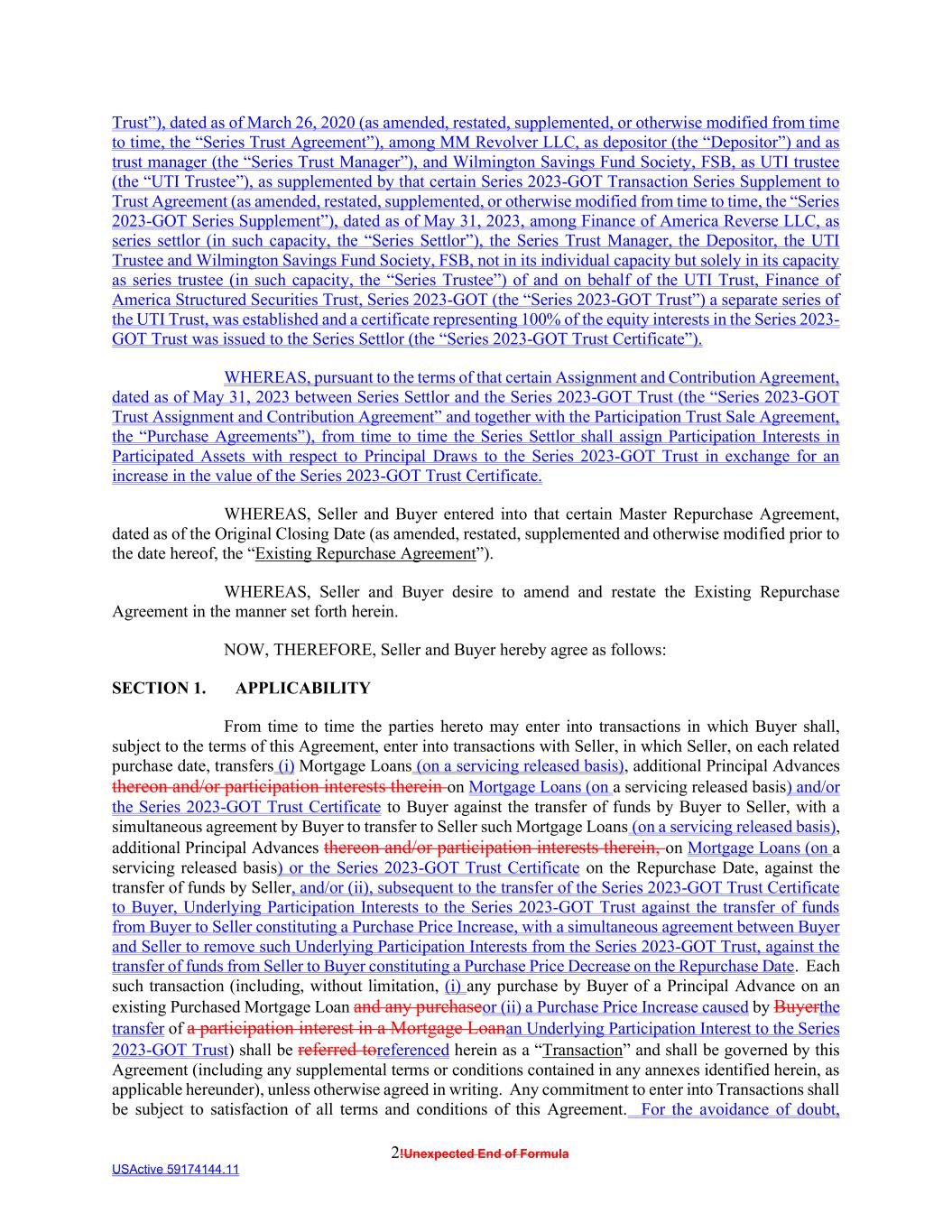 2!Unexpected End of Formula USActive 59174144.11 Trust”), dated as of March 26, 2020 (as amended, restated, supplemented, or otherwise modified from time to time, the “Series Trust Agreement”), among MM Revolver LLC, as depositor (the “Depositor”) and as trust manager (the “Series Trust Manager”), and Wilmington Savings Fund Society, FSB, as UTI trustee (the “UTI Trustee”), as supplemented by that certain Series 2023-GOT Transaction Series Supplement to Trust Agreement (as amended, restated, supplemented, or otherwise modified from time to time, the “Series 2023-GOT Series Supplement”), dated as of May 31, 2023, among Finance of America Reverse LLC, as series settlor (in such capacity, the “Series Settlor”), the Series Trust Manager, the Depositor, the UTI Trustee and Wilmington Savings Fund Society, FSB, not in its individual capacity but solely in its capacity as series trustee (in such capacity, the “Series Trustee”) of and on behalf of the UTI Trust, Finance of America Structured Securities Trust, Series 2023-GOT (the “Series 2023-GOT Trust”) a separate series of the UTI Trust, was established and a certificate representing 100% of the equity interests in the Series 2023- GOT Trust was issued to the Series Settlor (the “Series 2023-GOT Trust Certificate”). WHEREAS, pursuant to the terms of that certain Assignment and Contribution Agreement, dated as of May 31, 2023 between Series Settlor and the Series 2023-GOT Trust (the “Series 2023-GOT Trust Assignment and Contribution Agreement” and together with the Participation Trust Sale Agreement, the “Purchase Agreements”), from time to time the Series Settlor shall assign Participation Interests in Participated Assets with respect to Principal Draws to the Series 2023-GOT Trust in exchange for an increase in the value of the Series 2023-GOT Trust Certificate. WHEREAS, Seller and Buyer entered into that certain Master Repurchase Agreement, dated as of the Original Closing Date (as amended, restated, supplemented and otherwise modified prior to the date hereof, the “Existing Repurchase Agreement”). WHEREAS, Seller and Buyer desire to amend and restate the Existing Repurchase Agreement in the manner set forth herein. NOW, THEREFORE, Seller and Buyer hereby agree as follows: SECTION 1. APPLICABILITY From time to time the parties hereto may enter into transactions in which Buyer shall, subject to the terms of this Agreement, enter into transactions with Seller, in which Seller, on each related purchase date, transfers (i) Mortgage Loans (on a servicing released basis), additional Principal Advances thereon and/or participation interests therein on Mortgage Loans (on a servicing released basis) and/or the Series 2023-GOT Trust Certificate to Buyer against the transfer of funds by Buyer to Seller, with a simultaneous agreement by Buyer to transfer to Seller such Mortgage Loans (on a servicing released basis), additional Principal Advances thereon and/or participation interests therein, on Mortgage Loans (on a servicing released basis) or the Series 2023-GOT Trust Certificate on the Repurchase Date, against the transfer of funds by Seller, and/or (ii), subsequent to the transfer of the Series 2023-GOT Trust Certificate to Buyer, Underlying Participation Interests to the Series 2023-GOT Trust against the transfer of funds from Buyer to Seller constituting a Purchase Price Increase, with a simultaneous agreement between Buyer and Seller to remove such Underlying Participation Interests from the Series 2023-GOT Trust, against the transfer of funds from Seller to Buyer constituting a Purchase Price Decrease on the Repurchase Date. Each such transaction (including, without limitation, (i) any purchase by Buyer of a Principal Advance on an existing Purchased Mortgage Loan and any purchaseor (ii) a Purchase Price Increase caused by Buyerthe transfer of a participation interest in a Mortgage Loanan Underlying Participation Interest to the Series 2023-GOT Trust) shall be referred toreferenced herein as a “Transaction” and shall be governed by this Agreement (including any supplemental terms or conditions contained in any annexes identified herein, as applicable hereunder), unless otherwise agreed in writing. Any commitment to enter into Transactions shall be subject to satisfaction of all terms and conditions of this Agreement. For the avoidance of doubt,
