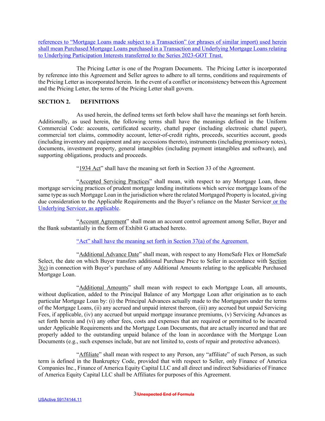 3!Unexpected End of Formula USActive 59174144.11 references to “Mortgage Loans made subject to a Transaction” (or phrases of similar import) used herein shall mean Purchased Mortgage Loans purchased in a Transaction and Underlying Mortgage Loans relating to Underlying Participation Interests transferred to the Series 2023-GOT Trust. The Pricing Letter is one of the Program Documents. The Pricing Letter is incorporated by reference into this Agreement and Seller agrees to adhere to all terms, conditions and requirements of the Pricing Letter as incorporated herein. In the event of a conflict or inconsistency between this Agreement and the Pricing Letter, the terms of the Pricing Letter shall govern. SECTION 2. DEFINITIONS As used herein, the defined terms set forth below shall have the meanings set forth herein. Additionally, as used herein, the following terms shall have the meanings defined in the Uniform Commercial Code: accounts, certificated security, chattel paper (including electronic chattel paper), commercial tort claims, commodity account, letter-of-credit rights, proceeds, securities account, goods (including inventory and equipment and any accessions thereto), instruments (including promissory notes), documents, investment property, general intangibles (including payment intangibles and software), and supporting obligations, products and proceeds. “1934 Act” shall have the meaning set forth in Section 33 of the Agreement. “Accepted Servicing Practices” shall mean, with respect to any Mortgage Loan, those mortgage servicing practices of prudent mortgage lending institutions which service mortgage loans of the same type as such Mortgage Loan in the jurisdiction where the related Mortgaged Property is located, giving due consideration to the Applicable Requirements and the Buyer’s reliance on the Master Servicer or the Underlying Servicer, as applicable. “Account Agreement” shall mean an account control agreement among Seller, Buyer and the Bank substantially in the form of Exhibit G attached hereto. “Act” shall have the meaning set forth in Section 37(a) of the Agreement. “Additional Advance Date” shall mean, with respect to any HomeSafe Flex or HomeSafe Select, the date on which Buyer transfers additional Purchase Price to Seller in accordance with Section 3(c) in connection with Buyer’s purchase of any Additional Amounts relating to the applicable Purchased Mortgage Loan. “Additional Amounts” shall mean with respect to each Mortgage Loan, all amounts, without duplication, added to the Principal Balance of any Mortgage Loan after origination as to each particular Mortgage Loan by: (i) the Principal Advances actually made to the Mortgagors under the terms of the Mortgage Loans, (ii) any accrued and unpaid interest thereon, (iii) any accrued but unpaid Servicing Fees, if applicable, (iv) any accrued but unpaid mortgage insurance premiums, (v) Servicing Advances as set forth herein and (vi) any other fees, costs and expenses that are required or permitted to be incurred under Applicable Requirements and the Mortgage Loan Documents, that are actually incurred and that are properly added to the outstanding unpaid balance of the loan in accordance with the Mortgage Loan Documents (e.g., such expenses include, but are not limited to, costs of repair and protective advances). “Affiliate” shall mean with respect to any Person, any “affiliate” of such Person, as such term is defined in the Bankruptcy Code, provided that with respect to Seller, only Finance of America Companies Inc., Finance of America Equity Capital LLC and all direct and indirect Subsidiaries of Finance of America Equity Capital LLC shall be Affiliates for purposes of this Agreement.