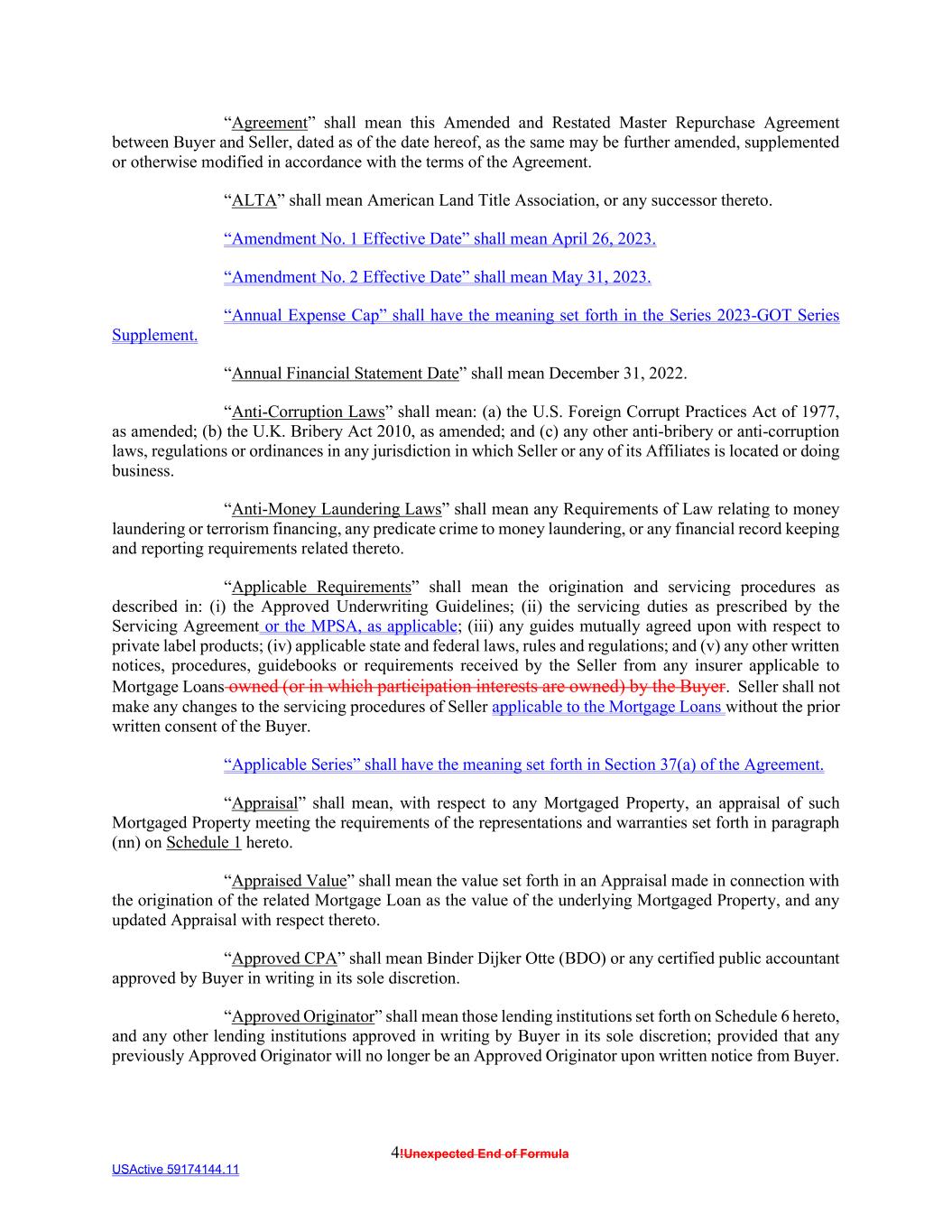 4!Unexpected End of Formula USActive 59174144.11 “Agreement” shall mean this Amended and Restated Master Repurchase Agreement between Buyer and Seller, dated as of the date hereof, as the same may be further amended, supplemented or otherwise modified in accordance with the terms of the Agreement. “ALTA” shall mean American Land Title Association, or any successor thereto. “Amendment No. 1 Effective Date” shall mean April 26, 2023. “Amendment No. 2 Effective Date” shall mean May 31, 2023. “Annual Expense Cap” shall have the meaning set forth in the Series 2023-GOT Series Supplement. “Annual Financial Statement Date” shall mean December 31, 2022. “Anti-Corruption Laws” shall mean: (a) the U.S. Foreign Corrupt Practices Act of 1977, as amended; (b) the U.K. Bribery Act 2010, as amended; and (c) any other anti-bribery or anti-corruption laws, regulations or ordinances in any jurisdiction in which Seller or any of its Affiliates is located or doing business. “Anti-Money Laundering Laws” shall mean any Requirements of Law relating to money laundering or terrorism financing, any predicate crime to money laundering, or any financial record keeping and reporting requirements related thereto. “Applicable Requirements” shall mean the origination and servicing procedures as described in: (i) the Approved Underwriting Guidelines; (ii) the servicing duties as prescribed by the Servicing Agreement or the MPSA, as applicable; (iii) any guides mutually agreed upon with respect to private label products; (iv) applicable state and federal laws, rules and regulations; and (v) any other written notices, procedures, guidebooks or requirements received by the Seller from any insurer applicable to Mortgage Loans owned (or in which participation interests are owned) by the Buyer. Seller shall not make any changes to the servicing procedures of Seller applicable to the Mortgage Loans without the prior written consent of the Buyer. “Applicable Series” shall have the meaning set forth in Section 37(a) of the Agreement. “Appraisal” shall mean, with respect to any Mortgaged Property, an appraisal of such Mortgaged Property meeting the requirements of the representations and warranties set forth in paragraph (nn) on Schedule 1 hereto. “Appraised Value” shall mean the value set forth in an Appraisal made in connection with the origination of the related Mortgage Loan as the value of the underlying Mortgaged Property, and any updated Appraisal with respect thereto. “Approved CPA” shall mean Binder Dijker Otte (BDO) or any certified public accountant approved by Buyer in writing in its sole discretion. “Approved Originator” shall mean those lending institutions set forth on Schedule 6 hereto, and any other lending institutions approved in writing by Buyer in its sole discretion; provided that any previously Approved Originator will no longer be an Approved Originator upon written notice from Buyer.