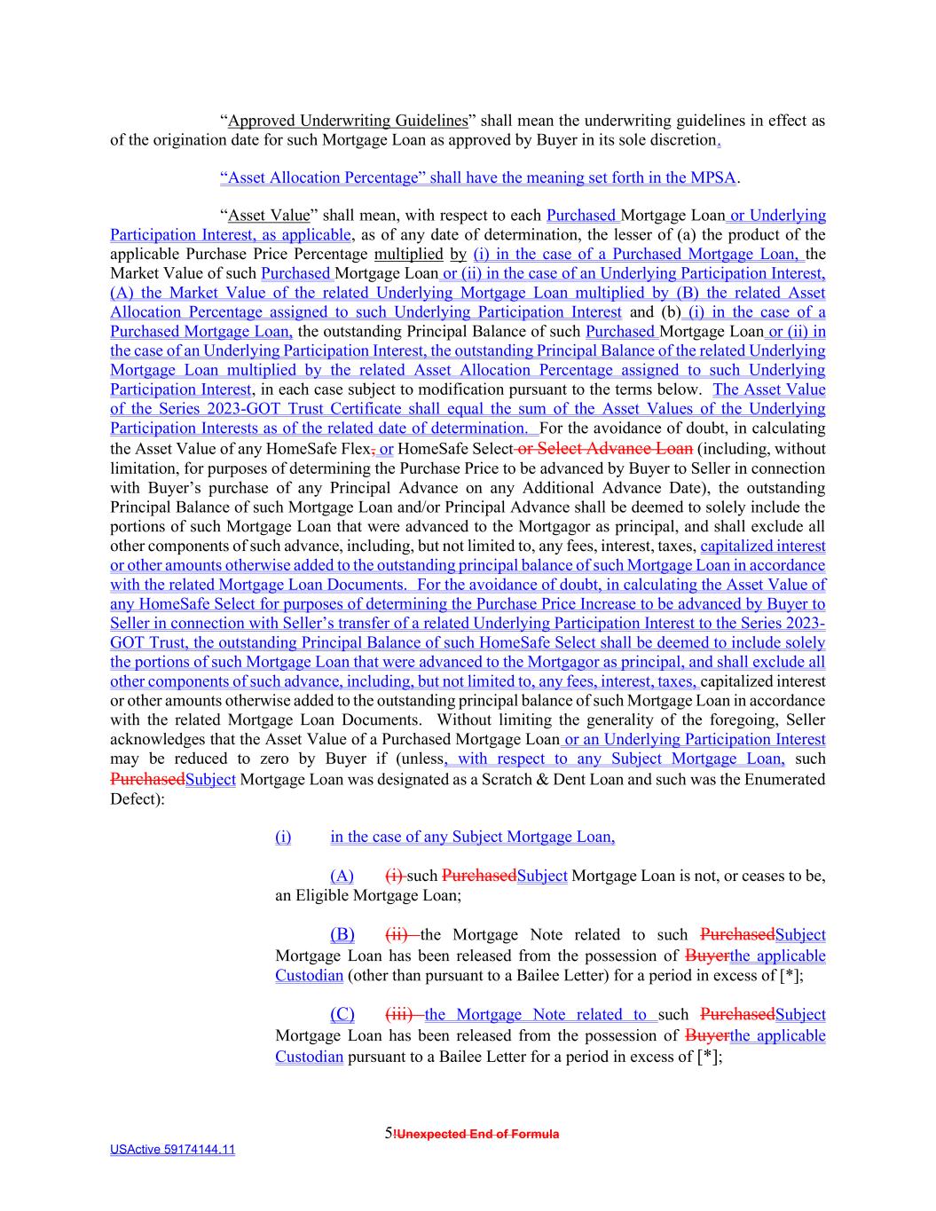 5!Unexpected End of Formula USActive 59174144.11 “Approved Underwriting Guidelines” shall mean the underwriting guidelines in effect as of the origination date for such Mortgage Loan as approved by Buyer in its sole discretion. “Asset Allocation Percentage” shall have the meaning set forth in the MPSA. “Asset Value” shall mean, with respect to each Purchased Mortgage Loan or Underlying Participation Interest, as applicable, as of any date of determination, the lesser of (a) the product of the applicable Purchase Price Percentage multiplied by (i) in the case of a Purchased Mortgage Loan, the Market Value of such Purchased Mortgage Loan or (ii) in the case of an Underlying Participation Interest, (A) the Market Value of the related Underlying Mortgage Loan multiplied by (B) the related Asset Allocation Percentage assigned to such Underlying Participation Interest and (b) (i) in the case of a Purchased Mortgage Loan, the outstanding Principal Balance of such Purchased Mortgage Loan or (ii) in the case of an Underlying Participation Interest, the outstanding Principal Balance of the related Underlying Mortgage Loan multiplied by the related Asset Allocation Percentage assigned to such Underlying Participation Interest, in each case subject to modification pursuant to the terms below. The Asset Value of the Series 2023-GOT Trust Certificate shall equal the sum of the Asset Values of the Underlying Participation Interests as of the related date of determination. For the avoidance of doubt, in calculating the Asset Value of any HomeSafe Flex, or HomeSafe Select or Select Advance Loan (including, without limitation, for purposes of determining the Purchase Price to be advanced by Buyer to Seller in connection with Buyer’s purchase of any Principal Advance on any Additional Advance Date), the outstanding Principal Balance of such Mortgage Loan and/or Principal Advance shall be deemed to solely include the portions of such Mortgage Loan that were advanced to the Mortgagor as principal, and shall exclude all other components of such advance, including, but not limited to, any fees, interest, taxes, capitalized interest or other amounts otherwise added to the outstanding principal balance of such Mortgage Loan in accordance with the related Mortgage Loan Documents. For the avoidance of doubt, in calculating the Asset Value of any HomeSafe Select for purposes of determining the Purchase Price Increase to be advanced by Buyer to Seller in connection with Seller’s transfer of a related Underlying Participation Interest to the Series 2023- GOT Trust, the outstanding Principal Balance of such HomeSafe Select shall be deemed to include solely the portions of such Mortgage Loan that were advanced to the Mortgagor as principal, and shall exclude all other components of such advance, including, but not limited to, any fees, interest, taxes, capitalized interest or other amounts otherwise added to the outstanding principal balance of such Mortgage Loan in accordance with the related Mortgage Loan Documents. Without limiting the generality of the foregoing, Seller acknowledges that the Asset Value of a Purchased Mortgage Loan or an Underlying Participation Interest may be reduced to zero by Buyer if (unless, with respect to any Subject Mortgage Loan, such PurchasedSubject Mortgage Loan was designated as a Scratch & Dent Loan and such was the Enumerated Defect): (i) in the case of any Subject Mortgage Loan, (A) (i) such PurchasedSubject Mortgage Loan is not, or ceases to be, an Eligible Mortgage Loan; (B) (ii) the Mortgage Note related to such PurchasedSubject Mortgage Loan has been released from the possession of Buyerthe applicable Custodian (other than pursuant to a Bailee Letter) for a period in excess of [*]; (C) (iii) the Mortgage Note related to such PurchasedSubject Mortgage Loan has been released from the possession of Buyerthe applicable Custodian pursuant to a Bailee Letter for a period in excess of [*];