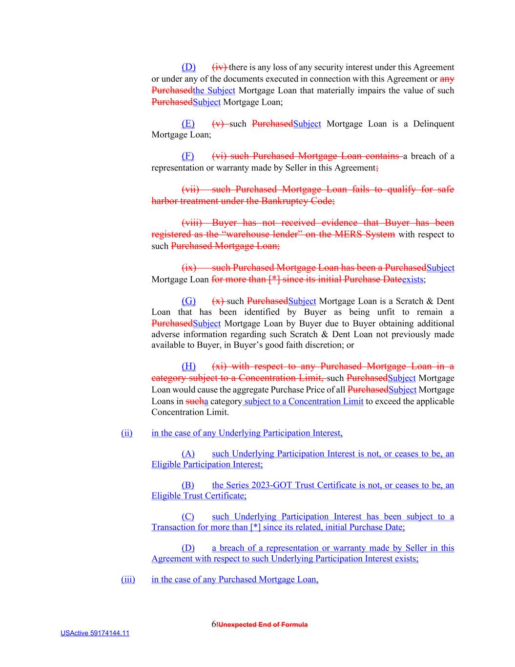 6!Unexpected End of Formula USActive 59174144.11 (D) (iv) there is any loss of any security interest under this Agreement or under any of the documents executed in connection with this Agreement or any Purchasedthe Subject Mortgage Loan that materially impairs the value of such PurchasedSubject Mortgage Loan; (E) (v) such PurchasedSubject Mortgage Loan is a Delinquent Mortgage Loan; (F) (vi) such Purchased Mortgage Loan contains a breach of a representation or warranty made by Seller in this Agreement; (vii) such Purchased Mortgage Loan fails to qualify for safe harbor treatment under the Bankruptcy Code; (viii) Buyer has not received evidence that Buyer has been registered as the “warehouse lender” on the MERS System with respect to such Purchased Mortgage Loan; (ix) such Purchased Mortgage Loan has been a PurchasedSubject Mortgage Loan for more than [*] since its initial Purchase Dateexists; (G) (x) such PurchasedSubject Mortgage Loan is a Scratch & Dent Loan that has been identified by Buyer as being unfit to remain a PurchasedSubject Mortgage Loan by Buyer due to Buyer obtaining additional adverse information regarding such Scratch & Dent Loan not previously made available to Buyer, in Buyer’s good faith discretion; or (H) (xi) with respect to any Purchased Mortgage Loan in a category subject to a Concentration Limit, such PurchasedSubject Mortgage Loan would cause the aggregate Purchase Price of all PurchasedSubject Mortgage Loans in sucha category subject to a Concentration Limit to exceed the applicable Concentration Limit. (ii) in the case of any Underlying Participation Interest, (A) such Underlying Participation Interest is not, or ceases to be, an Eligible Participation Interest; (B) the Series 2023-GOT Trust Certificate is not, or ceases to be, an Eligible Trust Certificate; (C) such Underlying Participation Interest has been subject to a Transaction for more than [*] since its related, initial Purchase Date; (D) a breach of a representation or warranty made by Seller in this Agreement with respect to such Underlying Participation Interest exists; (iii) in the case of any Purchased Mortgage Loan,