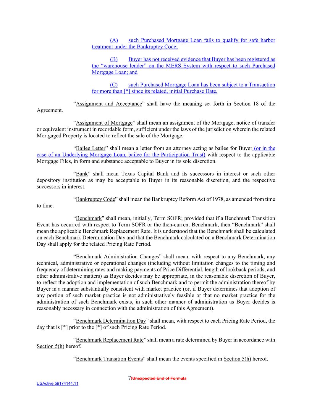 7!Unexpected End of Formula USActive 59174144.11 (A) such Purchased Mortgage Loan fails to qualify for safe harbor treatment under the Bankruptcy Code; (B) Buyer has not received evidence that Buyer has been registered as the “warehouse lender” on the MERS System with respect to such Purchased Mortgage Loan; and (C) such Purchased Mortgage Loan has been subject to a Transaction for more than [*] since its related, initial Purchase Date. “Assignment and Acceptance” shall have the meaning set forth in Section 18 of the Agreement. “Assignment of Mortgage” shall mean an assignment of the Mortgage, notice of transfer or equivalent instrument in recordable form, sufficient under the laws of the jurisdiction wherein the related Mortgaged Property is located to reflect the sale of the Mortgage. “Bailee Letter” shall mean a letter from an attorney acting as bailee for Buyer (or in the case of an Underlying Mortgage Loan, bailee for the Participation Trust) with respect to the applicable Mortgage Files, in form and substance acceptable to Buyer in its sole discretion. “Bank” shall mean Texas Capital Bank and its successors in interest or such other depository institution as may be acceptable to Buyer in its reasonable discretion, and the respective successors in interest. “Bankruptcy Code” shall mean the Bankruptcy Reform Act of 1978, as amended from time to time. “Benchmark” shall mean, initially, Term SOFR; provided that if a Benchmark Transition Event has occurred with respect to Term SOFR or the then-current Benchmark, then “Benchmark” shall mean the applicable Benchmark Replacement Rate. It is understood that the Benchmark shall be calculated on each Benchmark Determination Day and that the Benchmark calculated on a Benchmark Determination Day shall apply for the related Pricing Rate Period. “Benchmark Administration Changes” shall mean, with respect to any Benchmark, any technical, administrative or operational changes (including without limitation changes to the timing and frequency of determining rates and making payments of Price Differential, length of lookback periods, and other administrative matters) as Buyer decides may be appropriate, in the reasonable discretion of Buyer, to reflect the adoption and implementation of such Benchmark and to permit the administration thereof by Buyer in a manner substantially consistent with market practice (or, if Buyer determines that adoption of any portion of such market practice is not administratively feasible or that no market practice for the administration of such Benchmark exists, in such other manner of administration as Buyer decides is reasonably necessary in connection with the administration of this Agreement). “Benchmark Determination Day” shall mean, with respect to each Pricing Rate Period, the day that is [*] prior to the [*] of such Pricing Rate Period. “Benchmark Replacement Rate” shall mean a rate determined by Buyer in accordance with Section 5(h) hereof. “Benchmark Transition Events” shall mean the events specified in Section 5(h) hereof.