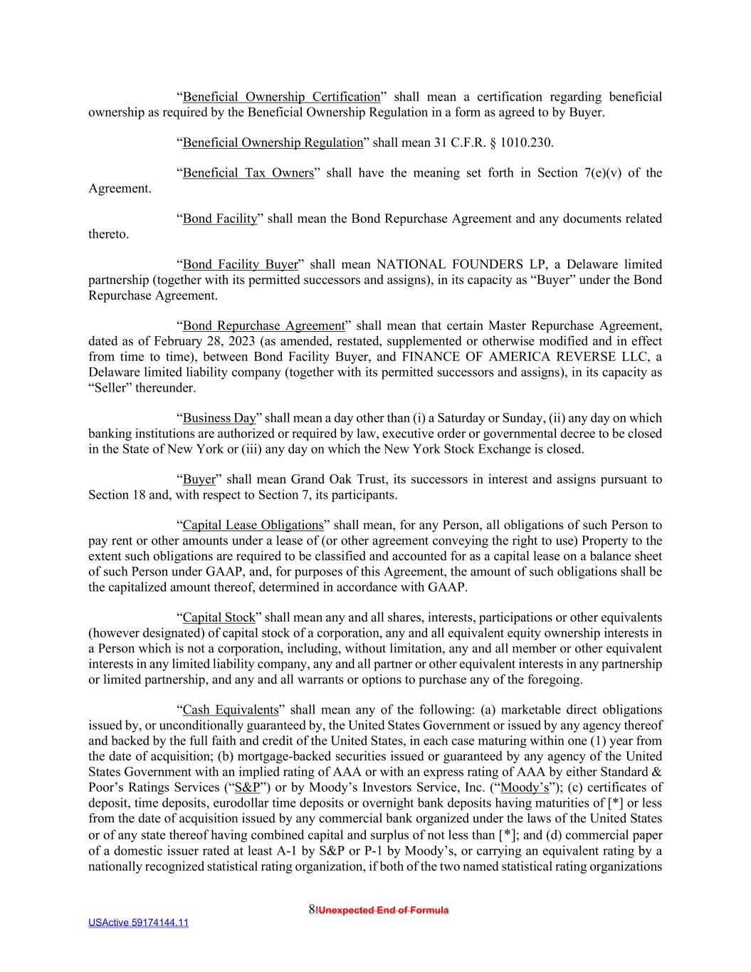 8!Unexpected End of Formula USActive 59174144.11 “Beneficial Ownership Certification” shall mean a certification regarding beneficial ownership as required by the Beneficial Ownership Regulation in a form as agreed to by Buyer. “Beneficial Ownership Regulation” shall mean 31 C.F.R. § 1010.230. “Beneficial Tax Owners” shall have the meaning set forth in Section 7(e)(v) of the Agreement. “Bond Facility” shall mean the Bond Repurchase Agreement and any documents related thereto. “Bond Facility Buyer” shall mean NATIONAL FOUNDERS LP, a Delaware limited partnership (together with its permitted successors and assigns), in its capacity as “Buyer” under the Bond Repurchase Agreement. “Bond Repurchase Agreement” shall mean that certain Master Repurchase Agreement, dated as of February 28, 2023 (as amended, restated, supplemented or otherwise modified and in effect from time to time), between Bond Facility Buyer, and FINANCE OF AMERICA REVERSE LLC, a Delaware limited liability company (together with its permitted successors and assigns), in its capacity as “Seller” thereunder. “Business Day” shall mean a day other than (i) a Saturday or Sunday, (ii) any day on which banking institutions are authorized or required by law, executive order or governmental decree to be closed in the State of New York or (iii) any day on which the New York Stock Exchange is closed. “Buyer” shall mean Grand Oak Trust, its successors in interest and assigns pursuant to Section 18 and, with respect to Section 7, its participants. “Capital Lease Obligations” shall mean, for any Person, all obligations of such Person to pay rent or other amounts under a lease of (or other agreement conveying the right to use) Property to the extent such obligations are required to be classified and accounted for as a capital lease on a balance sheet of such Person under GAAP, and, for purposes of this Agreement, the amount of such obligations shall be the capitalized amount thereof, determined in accordance with GAAP. “Capital Stock” shall mean any and all shares, interests, participations or other equivalents (however designated) of capital stock of a corporation, any and all equivalent equity ownership interests in a Person which is not a corporation, including, without limitation, any and all member or other equivalent interests in any limited liability company, any and all partner or other equivalent interests in any partnership or limited partnership, and any and all warrants or options to purchase any of the foregoing. “Cash Equivalents” shall mean any of the following: (a) marketable direct obligations issued by, or unconditionally guaranteed by, the United States Government or issued by any agency thereof and backed by the full faith and credit of the United States, in each case maturing within one (1) year from the date of acquisition; (b) mortgage-backed securities issued or guaranteed by any agency of the United States Government with an implied rating of AAA or with an express rating of AAA by either Standard & Poor’s Ratings Services (“S&P”) or by Moody’s Investors Service, Inc. (“Moody’s”); (c) certificates of deposit, time deposits, eurodollar time deposits or overnight bank deposits having maturities of [*] or less from the date of acquisition issued by any commercial bank organized under the laws of the United States or of any state thereof having combined capital and surplus of not less than [*]; and (d) commercial paper of a domestic issuer rated at least A-1 by S&P or P-1 by Moody’s, or carrying an equivalent rating by a nationally recognized statistical rating organization, if both of the two named statistical rating organizations