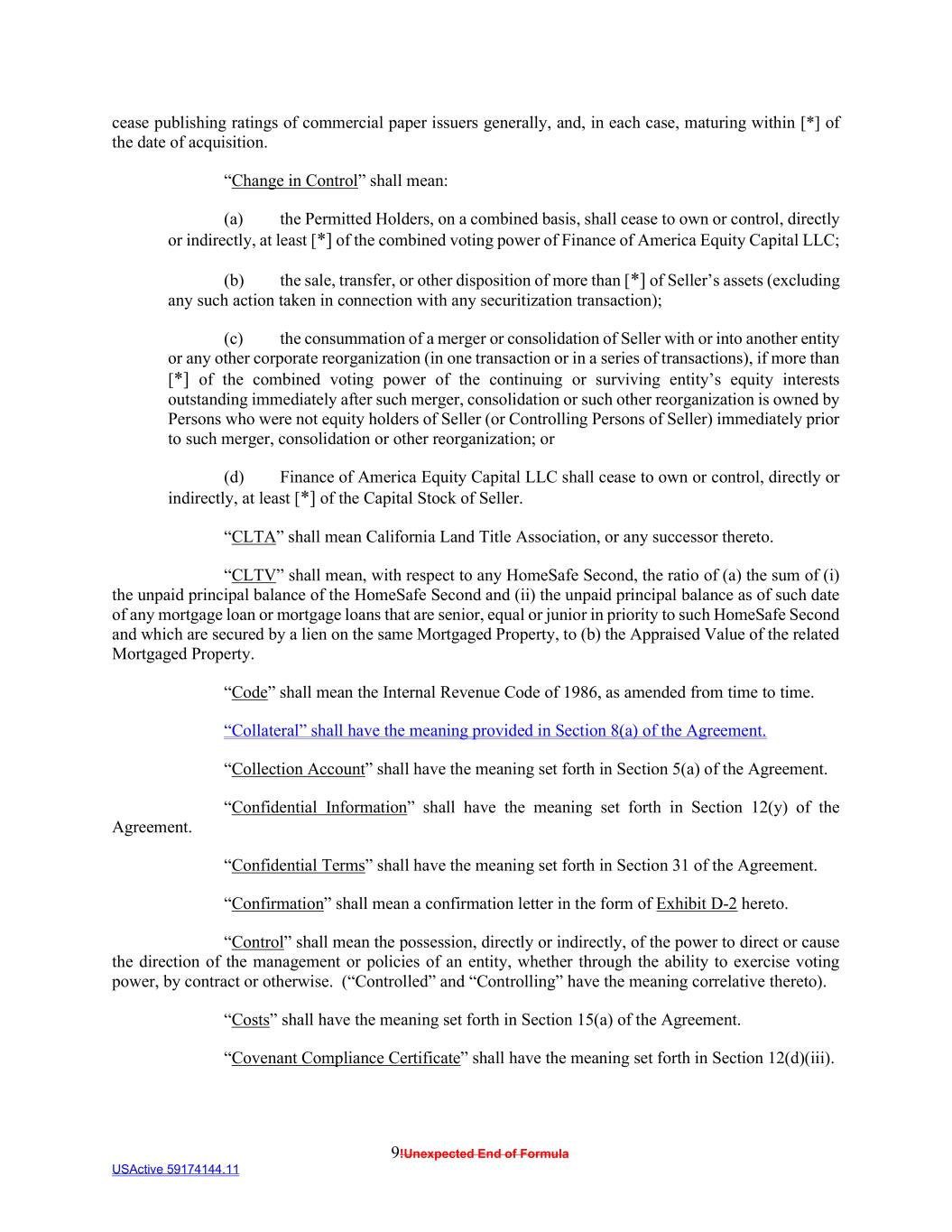 9!Unexpected End of Formula USActive 59174144.11 cease publishing ratings of commercial paper issuers generally, and, in each case, maturing within [*] of the date of acquisition. “Change in Control” shall mean: (a) the Permitted Holders, on a combined basis, shall cease to own or control, directly or indirectly, at least [*] of the combined voting power of Finance of America Equity Capital LLC; (b) the sale, transfer, or other disposition of more than [*] of Seller’s assets (excluding any such action taken in connection with any securitization transaction); (c) the consummation of a merger or consolidation of Seller with or into another entity or any other corporate reorganization (in one transaction or in a series of transactions), if more than [*] of the combined voting power of the continuing or surviving entity’s equity interests outstanding immediately after such merger, consolidation or such other reorganization is owned by Persons who were not equity holders of Seller (or Controlling Persons of Seller) immediately prior to such merger, consolidation or other reorganization; or (d) Finance of America Equity Capital LLC shall cease to own or control, directly or indirectly, at least [*] of the Capital Stock of Seller. “CLTA” shall mean California Land Title Association, or any successor thereto. “CLTV” shall mean, with respect to any HomeSafe Second, the ratio of (a) the sum of (i) the unpaid principal balance of the HomeSafe Second and (ii) the unpaid principal balance as of such date of any mortgage loan or mortgage loans that are senior, equal or junior in priority to such HomeSafe Second and which are secured by a lien on the same Mortgaged Property, to (b) the Appraised Value of the related Mortgaged Property. “Code” shall mean the Internal Revenue Code of 1986, as amended from time to time. “Collateral” shall have the meaning provided in Section 8(a) of the Agreement. “Collection Account” shall have the meaning set forth in Section 5(a) of the Agreement. “Confidential Information” shall have the meaning set forth in Section 12(y) of the Agreement. “Confidential Terms” shall have the meaning set forth in Section 31 of the Agreement. “Confirmation” shall mean a confirmation letter in the form of Exhibit D-2 hereto. “Control” shall mean the possession, directly or indirectly, of the power to direct or cause the direction of the management or policies of an entity, whether through the ability to exercise voting power, by contract or otherwise. (“Controlled” and “Controlling” have the meaning correlative thereto). “Costs” shall have the meaning set forth in Section 15(a) of the Agreement. “Covenant Compliance Certificate” shall have the meaning set forth in Section 12(d)(iii).