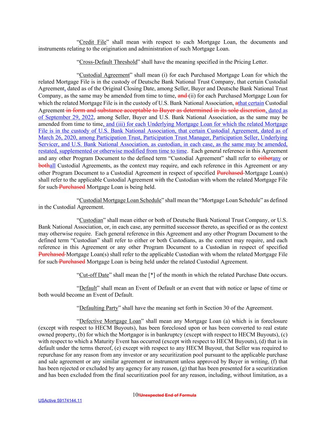 10!Unexpected End of Formula USActive 59174144.11 “Credit File” shall mean with respect to each Mortgage Loan, the documents and instruments relating to the origination and administration of such Mortgage Loan. “Cross-Default Threshold” shall have the meaning specified in the Pricing Letter. “Custodial Agreement” shall mean (i) for each Purchased Mortgage Loan for which the related Mortgage File is in the custody of Deutsche Bank National Trust Company, that certain Custodial Agreement, dated as of the Original Closing Date, among Seller, Buyer and Deutsche Bank National Trust Company, as the same may be amended from time to time, and (ii) for each Purchased Mortgage Loan for which the related Mortgage File is in the custody of U.S. Bank National Association, athat certain Custodial Agreement in form and substance acceptable to Buyer as determined in its sole discretion, dated as of September 29, 2022, among Seller, Buyer and U.S. Bank National Association, as the same may be amended from time to time, and (iii) for each Underlying Mortgage Loan for which the related Mortgage File is in the custody of U.S. Bank National Association, that certain Custodial Agreement, dated as of March 26, 2020, among Participation Trust, Participation Trust Manager, Participation Seller, Underlying Servicer, and U.S. Bank National Association, as custodian, in each case, as the same may be amended, restated, supplemented or otherwise modified from time to time. Each general reference in this Agreement and any other Program Document to the defined term “Custodial Agreement” shall refer to eitherany or bothall Custodial Agreements, as the context may require, and each reference in this Agreement or any other Program Document to a Custodial Agreement in respect of specified Purchased Mortgage Loan(s) shall refer to the applicable Custodial Agreement with the Custodian with whom the related Mortgage File for such Purchased Mortgage Loan is being held. “Custodial Mortgage Loan Schedule” shall mean the “Mortgage Loan Schedule” as defined in the Custodial Agreement. “Custodian” shall mean either or both of Deutsche Bank National Trust Company, or U.S. Bank National Association, or, in each case, any permitted successor thereto, as specified or as the context may otherwise require. Each general reference in this Agreement and any other Program Document to the defined term “Custodian” shall refer to either or both Custodians, as the context may require, and each reference in this Agreement or any other Program Document to a Custodian in respect of specified Purchased Mortgage Loan(s) shall refer to the applicable Custodian with whom the related Mortgage File for such Purchased Mortgage Loan is being held under the related Custodial Agreement. “Cut-off Date” shall mean the [*] of the month in which the related Purchase Date occurs. “Default” shall mean an Event of Default or an event that with notice or lapse of time or both would become an Event of Default. “Defaulting Party” shall have the meaning set forth in Section 30 of the Agreement. “Defective Mortgage Loan” shall mean any Mortgage Loan (a) which is in foreclosure (except with respect to HECM Buyouts), has been foreclosed upon or has been converted to real estate owned property, (b) for which the Mortgagor is in bankruptcy (except with respect to HECM Buyouts), (c) with respect to which a Maturity Event has occurred (except with respect to HECM Buyouts), (d) that is in default under the terms thereof, (e) except with respect to any HECM Buyout, that Seller was required to repurchase for any reason from any investor or any securitization pool pursuant to the applicable purchase and sale agreement or any similar agreement or instrument unless approved by Buyer in writing, (f) that has been rejected or excluded by any agency for any reason, (g) that has been presented for a securitization and has been excluded from the final securitization pool for any reason, including, without limitation, as a