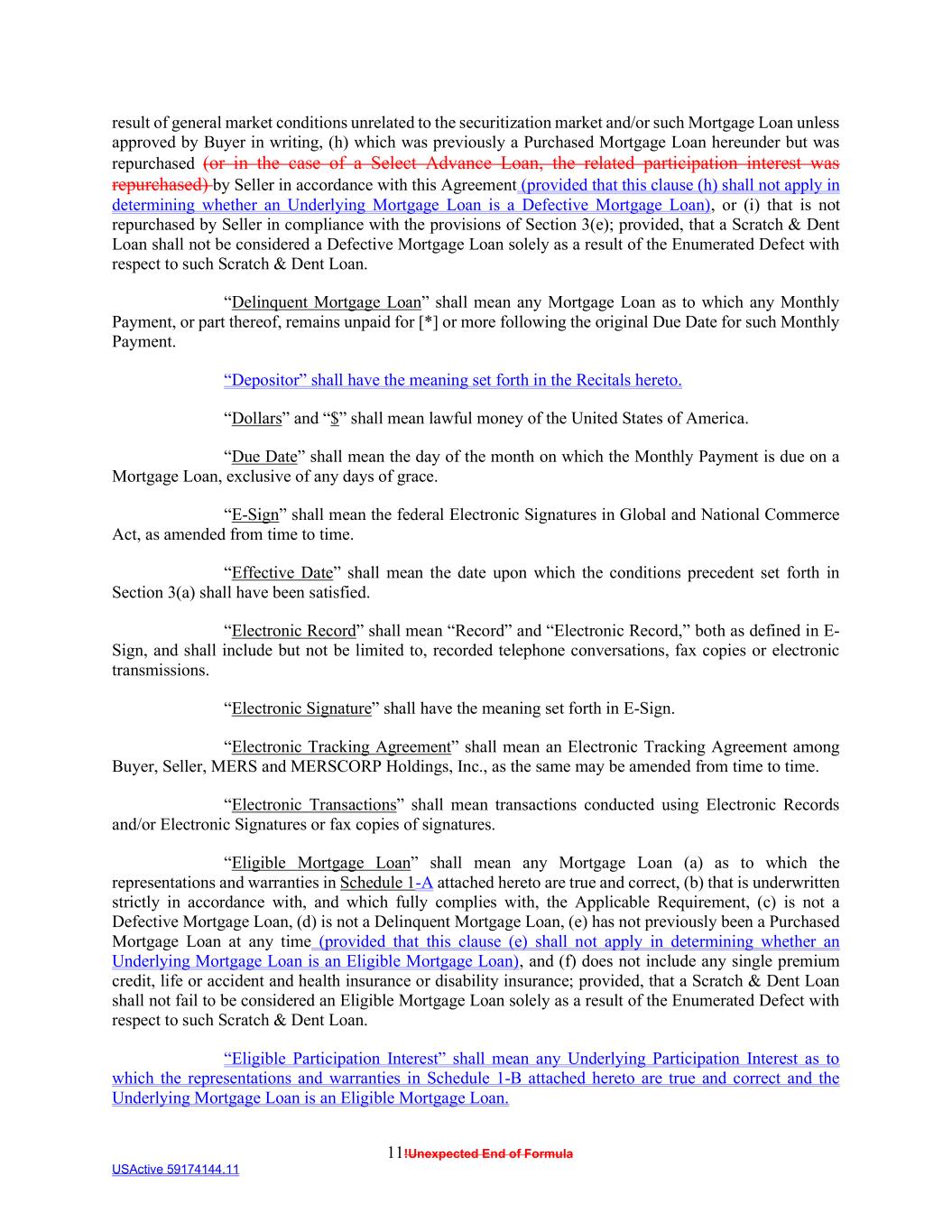 11!Unexpected End of Formula USActive 59174144.11 result of general market conditions unrelated to the securitization market and/or such Mortgage Loan unless approved by Buyer in writing, (h) which was previously a Purchased Mortgage Loan hereunder but was repurchased (or in the case of a Select Advance Loan, the related participation interest was repurchased) by Seller in accordance with this Agreement (provided that this clause (h) shall not apply in determining whether an Underlying Mortgage Loan is a Defective Mortgage Loan), or (i) that is not repurchased by Seller in compliance with the provisions of Section 3(e); provided, that a Scratch & Dent Loan shall not be considered a Defective Mortgage Loan solely as a result of the Enumerated Defect with respect to such Scratch & Dent Loan. “Delinquent Mortgage Loan” shall mean any Mortgage Loan as to which any Monthly Payment, or part thereof, remains unpaid for [*] or more following the original Due Date for such Monthly Payment. “Depositor” shall have the meaning set forth in the Recitals hereto. “Dollars” and “$” shall mean lawful money of the United States of America. “Due Date” shall mean the day of the month on which the Monthly Payment is due on a Mortgage Loan, exclusive of any days of grace. “E-Sign” shall mean the federal Electronic Signatures in Global and National Commerce Act, as amended from time to time. “Effective Date” shall mean the date upon which the conditions precedent set forth in Section 3(a) shall have been satisfied. “Electronic Record” shall mean “Record” and “Electronic Record,” both as defined in E- Sign, and shall include but not be limited to, recorded telephone conversations, fax copies or electronic transmissions. “Electronic Signature” shall have the meaning set forth in E-Sign. “Electronic Tracking Agreement” shall mean an Electronic Tracking Agreement among Buyer, Seller, MERS and MERSCORP Holdings, Inc., as the same may be amended from time to time. “Electronic Transactions” shall mean transactions conducted using Electronic Records and/or Electronic Signatures or fax copies of signatures. “Eligible Mortgage Loan” shall mean any Mortgage Loan (a) as to which the representations and warranties in Schedule 1-A attached hereto are true and correct, (b) that is underwritten strictly in accordance with, and which fully complies with, the Applicable Requirement, (c) is not a Defective Mortgage Loan, (d) is not a Delinquent Mortgage Loan, (e) has not previously been a Purchased Mortgage Loan at any time (provided that this clause (e) shall not apply in determining whether an Underlying Mortgage Loan is an Eligible Mortgage Loan), and (f) does not include any single premium credit, life or accident and health insurance or disability insurance; provided, that a Scratch & Dent Loan shall not fail to be considered an Eligible Mortgage Loan solely as a result of the Enumerated Defect with respect to such Scratch & Dent Loan. “Eligible Participation Interest” shall mean any Underlying Participation Interest as to which the representations and warranties in Schedule 1-B attached hereto are true and correct and the Underlying Mortgage Loan is an Eligible Mortgage Loan.