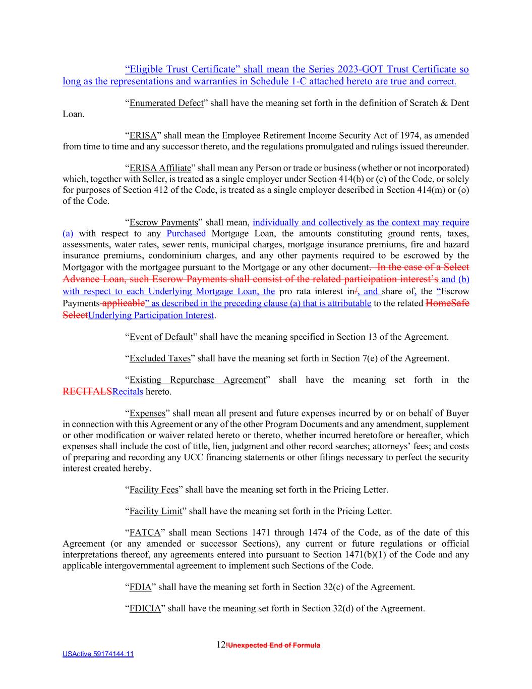 12!Unexpected End of Formula USActive 59174144.11 “Eligible Trust Certificate” shall mean the Series 2023-GOT Trust Certificate so long as the representations and warranties in Schedule 1-C attached hereto are true and correct. “Enumerated Defect” shall have the meaning set forth in the definition of Scratch & Dent Loan. “ERISA” shall mean the Employee Retirement Income Security Act of 1974, as amended from time to time and any successor thereto, and the regulations promulgated and rulings issued thereunder. “ERISA Affiliate” shall mean any Person or trade or business (whether or not incorporated) which, together with Seller, is treated as a single employer under Section 414(b) or (c) of the Code, or solely for purposes of Section 412 of the Code, is treated as a single employer described in Section 414(m) or (o) of the Code. “Escrow Payments” shall mean, individually and collectively as the context may require (a) with respect to any Purchased Mortgage Loan, the amounts constituting ground rents, taxes, assessments, water rates, sewer rents, municipal charges, mortgage insurance premiums, fire and hazard insurance premiums, condominium charges, and any other payments required to be escrowed by the Mortgagor with the mortgagee pursuant to the Mortgage or any other document. In the case of a Select Advance Loan, such Escrow Payments shall consist of the related participation interest’s and (b) with respect to each Underlying Mortgage Loan, the pro rata interest in/, and share of, the “Escrow Payments applicable” as described in the preceding clause (a) that is attributable to the related HomeSafe SelectUnderlying Participation Interest. “Event of Default” shall have the meaning specified in Section 13 of the Agreement. “Excluded Taxes” shall have the meaning set forth in Section 7(e) of the Agreement. “Existing Repurchase Agreement” shall have the meaning set forth in the RECITALSRecitals hereto. “Expenses” shall mean all present and future expenses incurred by or on behalf of Buyer in connection with this Agreement or any of the other Program Documents and any amendment, supplement or other modification or waiver related hereto or thereto, whether incurred heretofore or hereafter, which expenses shall include the cost of title, lien, judgment and other record searches; attorneys’ fees; and costs of preparing and recording any UCC financing statements or other filings necessary to perfect the security interest created hereby. “Facility Fees” shall have the meaning set forth in the Pricing Letter. “Facility Limit” shall have the meaning set forth in the Pricing Letter. “FATCA” shall mean Sections 1471 through 1474 of the Code, as of the date of this Agreement (or any amended or successor Sections), any current or future regulations or official interpretations thereof, any agreements entered into pursuant to Section 1471(b)(1) of the Code and any applicable intergovernmental agreement to implement such Sections of the Code. “FDIA” shall have the meaning set forth in Section 32(c) of the Agreement. “FDICIA” shall have the meaning set forth in Section 32(d) of the Agreement.