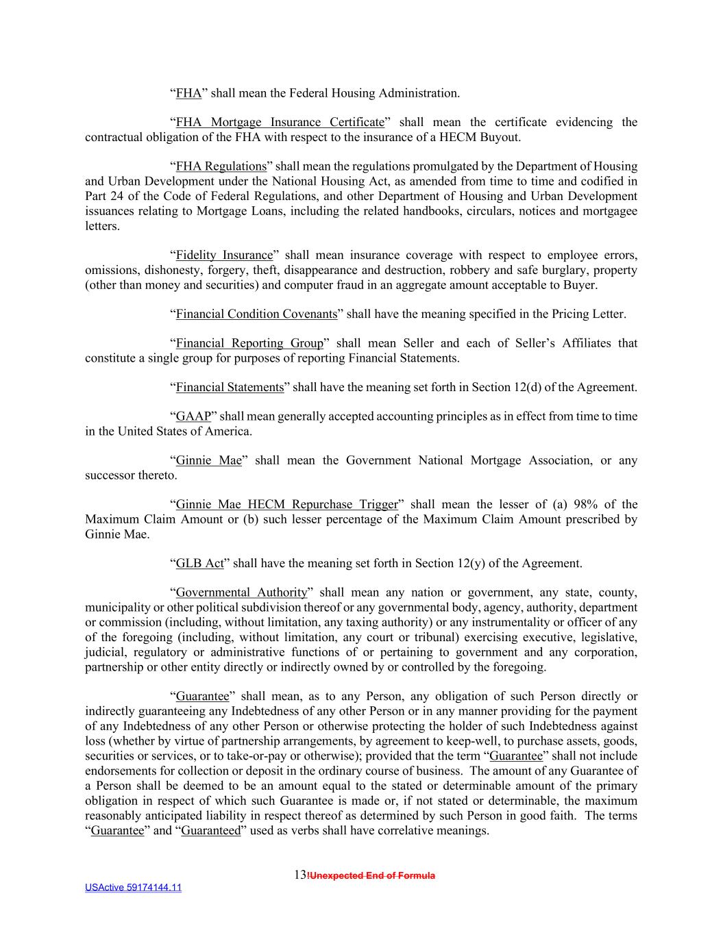 13!Unexpected End of Formula USActive 59174144.11 “FHA” shall mean the Federal Housing Administration. “FHA Mortgage Insurance Certificate” shall mean the certificate evidencing the contractual obligation of the FHA with respect to the insurance of a HECM Buyout. “FHA Regulations” shall mean the regulations promulgated by the Department of Housing and Urban Development under the National Housing Act, as amended from time to time and codified in Part 24 of the Code of Federal Regulations, and other Department of Housing and Urban Development issuances relating to Mortgage Loans, including the related handbooks, circulars, notices and mortgagee letters. “Fidelity Insurance” shall mean insurance coverage with respect to employee errors, omissions, dishonesty, forgery, theft, disappearance and destruction, robbery and safe burglary, property (other than money and securities) and computer fraud in an aggregate amount acceptable to Buyer. “Financial Condition Covenants” shall have the meaning specified in the Pricing Letter. “Financial Reporting Group” shall mean Seller and each of Seller’s Affiliates that constitute a single group for purposes of reporting Financial Statements. “Financial Statements” shall have the meaning set forth in Section 12(d) of the Agreement. “GAAP” shall mean generally accepted accounting principles as in effect from time to time in the United States of America. “Ginnie Mae” shall mean the Government National Mortgage Association, or any successor thereto. “Ginnie Mae HECM Repurchase Trigger” shall mean the lesser of (a) 98% of the Maximum Claim Amount or (b) such lesser percentage of the Maximum Claim Amount prescribed by Ginnie Mae. “GLB Act” shall have the meaning set forth in Section 12(y) of the Agreement. “Governmental Authority” shall mean any nation or government, any state, county, municipality or other political subdivision thereof or any governmental body, agency, authority, department or commission (including, without limitation, any taxing authority) or any instrumentality or officer of any of the foregoing (including, without limitation, any court or tribunal) exercising executive, legislative, judicial, regulatory or administrative functions of or pertaining to government and any corporation, partnership or other entity directly or indirectly owned by or controlled by the foregoing. “Guarantee” shall mean, as to any Person, any obligation of such Person directly or indirectly guaranteeing any Indebtedness of any other Person or in any manner providing for the payment of any Indebtedness of any other Person or otherwise protecting the holder of such Indebtedness against loss (whether by virtue of partnership arrangements, by agreement to keep-well, to purchase assets, goods, securities or services, or to take-or-pay or otherwise); provided that the term “Guarantee” shall not include endorsements for collection or deposit in the ordinary course of business. The amount of any Guarantee of a Person shall be deemed to be an amount equal to the stated or determinable amount of the primary obligation in respect of which such Guarantee is made or, if not stated or determinable, the maximum reasonably anticipated liability in respect thereof as determined by such Person in good faith. The terms “Guarantee” and “Guaranteed” used as verbs shall have correlative meanings.