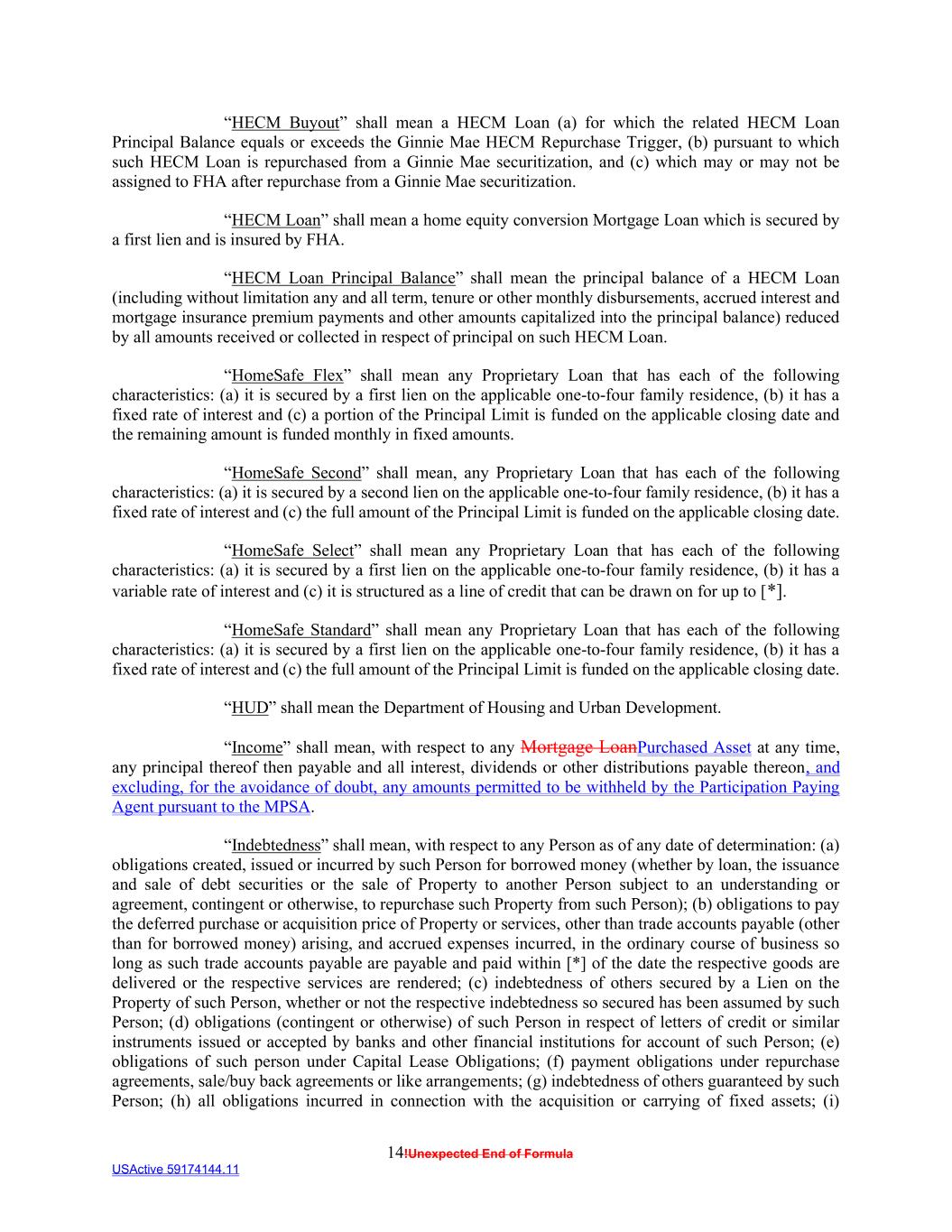 14!Unexpected End of Formula USActive 59174144.11 “HECM Buyout” shall mean a HECM Loan (a) for which the related HECM Loan Principal Balance equals or exceeds the Ginnie Mae HECM Repurchase Trigger, (b) pursuant to which such HECM Loan is repurchased from a Ginnie Mae securitization, and (c) which may or may not be assigned to FHA after repurchase from a Ginnie Mae securitization. “HECM Loan” shall mean a home equity conversion Mortgage Loan which is secured by a first lien and is insured by FHA. “HECM Loan Principal Balance” shall mean the principal balance of a HECM Loan (including without limitation any and all term, tenure or other monthly disbursements, accrued interest and mortgage insurance premium payments and other amounts capitalized into the principal balance) reduced by all amounts received or collected in respect of principal on such HECM Loan. “HomeSafe Flex” shall mean any Proprietary Loan that has each of the following characteristics: (a) it is secured by a first lien on the applicable one-to-four family residence, (b) it has a fixed rate of interest and (c) a portion of the Principal Limit is funded on the applicable closing date and the remaining amount is funded monthly in fixed amounts. “HomeSafe Second” shall mean, any Proprietary Loan that has each of the following characteristics: (a) it is secured by a second lien on the applicable one-to-four family residence, (b) it has a fixed rate of interest and (c) the full amount of the Principal Limit is funded on the applicable closing date. “HomeSafe Select” shall mean any Proprietary Loan that has each of the following characteristics: (a) it is secured by a first lien on the applicable one-to-four family residence, (b) it has a variable rate of interest and (c) it is structured as a line of credit that can be drawn on for up to [*]. “HomeSafe Standard” shall mean any Proprietary Loan that has each of the following characteristics: (a) it is secured by a first lien on the applicable one-to-four family residence, (b) it has a fixed rate of interest and (c) the full amount of the Principal Limit is funded on the applicable closing date. “HUD” shall mean the Department of Housing and Urban Development. “Income” shall mean, with respect to any Mortgage LoanPurchased Asset at any time, any principal thereof then payable and all interest, dividends or other distributions payable thereon, and excluding, for the avoidance of doubt, any amounts permitted to be withheld by the Participation Paying Agent pursuant to the MPSA. “Indebtedness” shall mean, with respect to any Person as of any date of determination: (a) obligations created, issued or incurred by such Person for borrowed money (whether by loan, the issuance and sale of debt securities or the sale of Property to another Person subject to an understanding or agreement, contingent or otherwise, to repurchase such Property from such Person); (b) obligations to pay the deferred purchase or acquisition price of Property or services, other than trade accounts payable (other than for borrowed money) arising, and accrued expenses incurred, in the ordinary course of business so long as such trade accounts payable are payable and paid within [*] of the date the respective goods are delivered or the respective services are rendered; (c) indebtedness of others secured by a Lien on the Property of such Person, whether or not the respective indebtedness so secured has been assumed by such Person; (d) obligations (contingent or otherwise) of such Person in respect of letters of credit or similar instruments issued or accepted by banks and other financial institutions for account of such Person; (e) obligations of such person under Capital Lease Obligations; (f) payment obligations under repurchase agreements, sale/buy back agreements or like arrangements; (g) indebtedness of others guaranteed by such Person; (h) all obligations incurred in connection with the acquisition or carrying of fixed assets; (i)