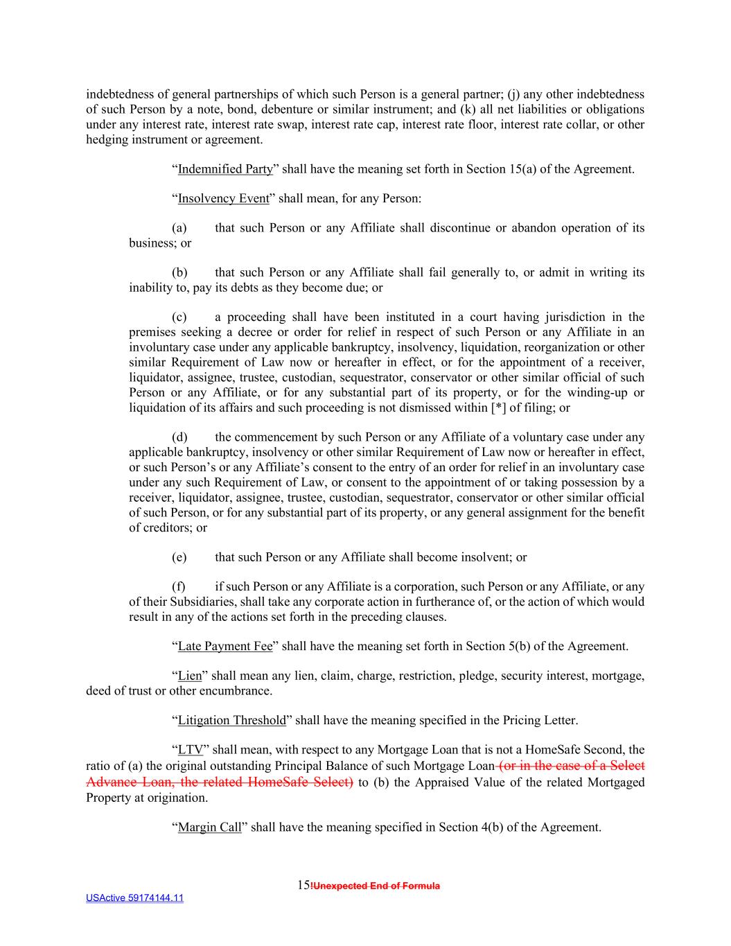 15!Unexpected End of Formula USActive 59174144.11 indebtedness of general partnerships of which such Person is a general partner; (j) any other indebtedness of such Person by a note, bond, debenture or similar instrument; and (k) all net liabilities or obligations under any interest rate, interest rate swap, interest rate cap, interest rate floor, interest rate collar, or other hedging instrument or agreement. “Indemnified Party” shall have the meaning set forth in Section 15(a) of the Agreement. “Insolvency Event” shall mean, for any Person: (a) that such Person or any Affiliate shall discontinue or abandon operation of its business; or (b) that such Person or any Affiliate shall fail generally to, or admit in writing its inability to, pay its debts as they become due; or (c) a proceeding shall have been instituted in a court having jurisdiction in the premises seeking a decree or order for relief in respect of such Person or any Affiliate in an involuntary case under any applicable bankruptcy, insolvency, liquidation, reorganization or other similar Requirement of Law now or hereafter in effect, or for the appointment of a receiver, liquidator, assignee, trustee, custodian, sequestrator, conservator or other similar official of such Person or any Affiliate, or for any substantial part of its property, or for the winding-up or liquidation of its affairs and such proceeding is not dismissed within [*] of filing; or (d) the commencement by such Person or any Affiliate of a voluntary case under any applicable bankruptcy, insolvency or other similar Requirement of Law now or hereafter in effect, or such Person’s or any Affiliate’s consent to the entry of an order for relief in an involuntary case under any such Requirement of Law, or consent to the appointment of or taking possession by a receiver, liquidator, assignee, trustee, custodian, sequestrator, conservator or other similar official of such Person, or for any substantial part of its property, or any general assignment for the benefit of creditors; or (e) that such Person or any Affiliate shall become insolvent; or (f) if such Person or any Affiliate is a corporation, such Person or any Affiliate, or any of their Subsidiaries, shall take any corporate action in furtherance of, or the action of which would result in any of the actions set forth in the preceding clauses. “Late Payment Fee” shall have the meaning set forth in Section 5(b) of the Agreement. “Lien” shall mean any lien, claim, charge, restriction, pledge, security interest, mortgage, deed of trust or other encumbrance. “Litigation Threshold” shall have the meaning specified in the Pricing Letter. “LTV” shall mean, with respect to any Mortgage Loan that is not a HomeSafe Second, the ratio of (a) the original outstanding Principal Balance of such Mortgage Loan (or in the case of a Select Advance Loan, the related HomeSafe Select) to (b) the Appraised Value of the related Mortgaged Property at origination. “Margin Call” shall have the meaning specified in Section 4(b) of the Agreement.