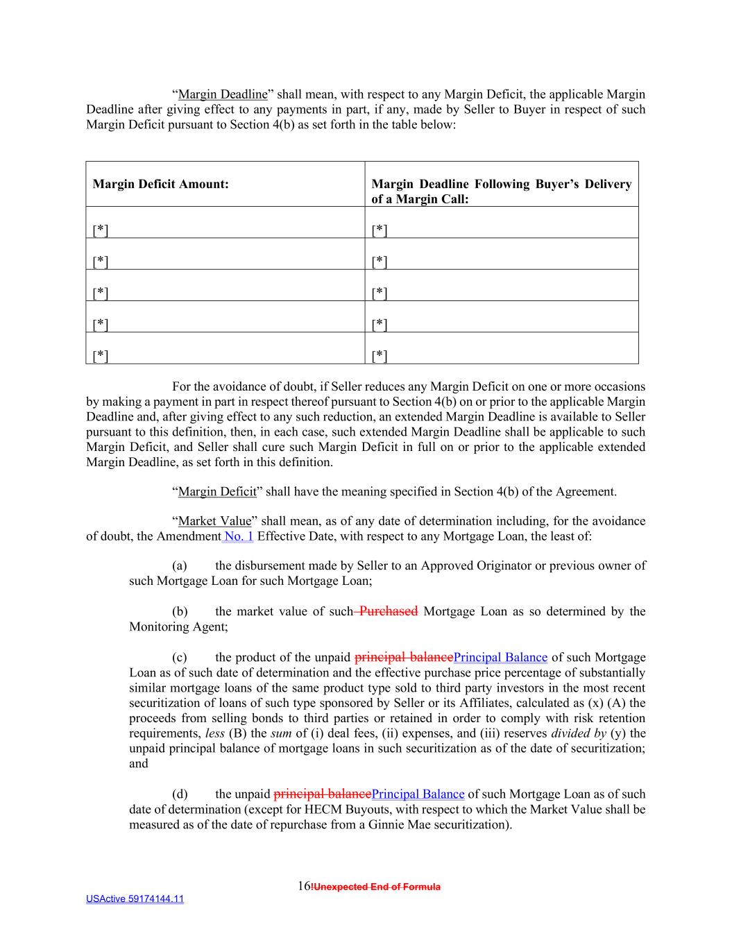 16!Unexpected End of Formula USActive 59174144.11 “Margin Deadline” shall mean, with respect to any Margin Deficit, the applicable Margin Deadline after giving effect to any payments in part, if any, made by Seller to Buyer in respect of such Margin Deficit pursuant to Section 4(b) as set forth in the table below: Margin Deficit Amount: Margin Deadline Following Buyer’s Delivery of a Margin Call: [*] [*] [*] [*] [*] [*] [*] [*] [*] [*] For the avoidance of doubt, if Seller reduces any Margin Deficit on one or more occasions by making a payment in part in respect thereof pursuant to Section 4(b) on or prior to the applicable Margin Deadline and, after giving effect to any such reduction, an extended Margin Deadline is available to Seller pursuant to this definition, then, in each case, such extended Margin Deadline shall be applicable to such Margin Deficit, and Seller shall cure such Margin Deficit in full on or prior to the applicable extended Margin Deadline, as set forth in this definition. “Margin Deficit” shall have the meaning specified in Section 4(b) of the Agreement. “Market Value” shall mean, as of any date of determination including, for the avoidance of doubt, the Amendment No. 1 Effective Date, with respect to any Mortgage Loan, the least of: (a) the disbursement made by Seller to an Approved Originator or previous owner of such Mortgage Loan for such Mortgage Loan; (b) the market value of such Purchased Mortgage Loan as so determined by the Monitoring Agent; (c) the product of the unpaid principal balancePrincipal Balance of such Mortgage Loan as of such date of determination and the effective purchase price percentage of substantially similar mortgage loans of the same product type sold to third party investors in the most recent securitization of loans of such type sponsored by Seller or its Affiliates, calculated as (x) (A) the proceeds from selling bonds to third parties or retained in order to comply with risk retention requirements, less (B) the sum of (i) deal fees, (ii) expenses, and (iii) reserves divided by (y) the unpaid principal balance of mortgage loans in such securitization as of the date of securitization; and (d) the unpaid principal balancePrincipal Balance of such Mortgage Loan as of such date of determination (except for HECM Buyouts, with respect to which the Market Value shall be measured as of the date of repurchase from a Ginnie Mae securitization).