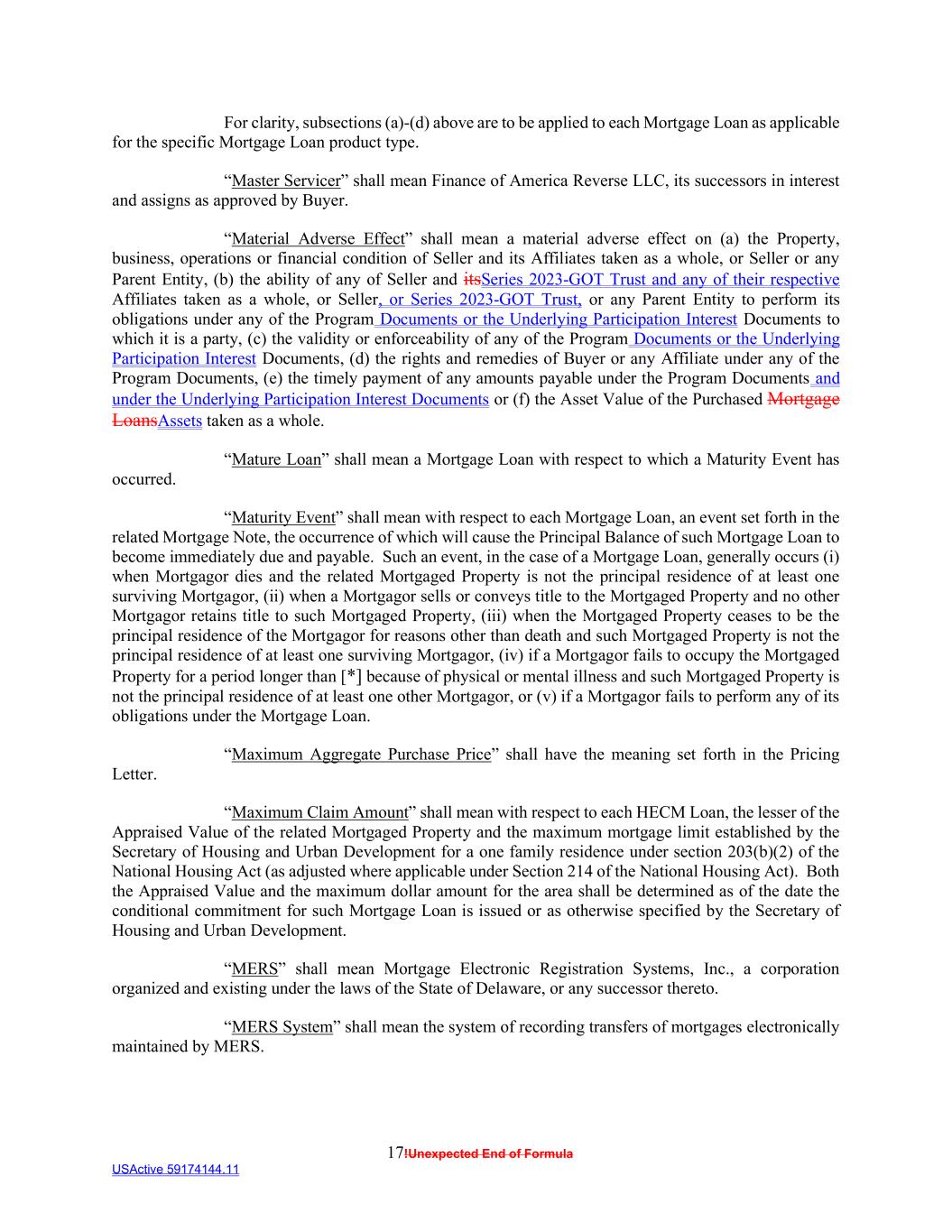 17!Unexpected End of Formula USActive 59174144.11 For clarity, subsections (a)-(d) above are to be applied to each Mortgage Loan as applicable for the specific Mortgage Loan product type. “Master Servicer” shall mean Finance of America Reverse LLC, its successors in interest and assigns as approved by Buyer. “Material Adverse Effect” shall mean a material adverse effect on (a) the Property, business, operations or financial condition of Seller and its Affiliates taken as a whole, or Seller or any Parent Entity, (b) the ability of any of Seller and itsSeries 2023-GOT Trust and any of their respective Affiliates taken as a whole, or Seller, or Series 2023-GOT Trust, or any Parent Entity to perform its obligations under any of the Program Documents or the Underlying Participation Interest Documents to which it is a party, (c) the validity or enforceability of any of the Program Documents or the Underlying Participation Interest Documents, (d) the rights and remedies of Buyer or any Affiliate under any of the Program Documents, (e) the timely payment of any amounts payable under the Program Documents and under the Underlying Participation Interest Documents or (f) the Asset Value of the Purchased Mortgage LoansAssets taken as a whole. “Mature Loan” shall mean a Mortgage Loan with respect to which a Maturity Event has occurred. “Maturity Event” shall mean with respect to each Mortgage Loan, an event set forth in the related Mortgage Note, the occurrence of which will cause the Principal Balance of such Mortgage Loan to become immediately due and payable. Such an event, in the case of a Mortgage Loan, generally occurs (i) when Mortgagor dies and the related Mortgaged Property is not the principal residence of at least one surviving Mortgagor, (ii) when a Mortgagor sells or conveys title to the Mortgaged Property and no other Mortgagor retains title to such Mortgaged Property, (iii) when the Mortgaged Property ceases to be the principal residence of the Mortgagor for reasons other than death and such Mortgaged Property is not the principal residence of at least one surviving Mortgagor, (iv) if a Mortgagor fails to occupy the Mortgaged Property for a period longer than [*] because of physical or mental illness and such Mortgaged Property is not the principal residence of at least one other Mortgagor, or (v) if a Mortgagor fails to perform any of its obligations under the Mortgage Loan. “Maximum Aggregate Purchase Price” shall have the meaning set forth in the Pricing Letter. “Maximum Claim Amount” shall mean with respect to each HECM Loan, the lesser of the Appraised Value of the related Mortgaged Property and the maximum mortgage limit established by the Secretary of Housing and Urban Development for a one family residence under section 203(b)(2) of the National Housing Act (as adjusted where applicable under Section 214 of the National Housing Act). Both the Appraised Value and the maximum dollar amount for the area shall be determined as of the date the conditional commitment for such Mortgage Loan is issued or as otherwise specified by the Secretary of Housing and Urban Development. “MERS” shall mean Mortgage Electronic Registration Systems, Inc., a corporation organized and existing under the laws of the State of Delaware, or any successor thereto. “MERS System” shall mean the system of recording transfers of mortgages electronically maintained by MERS.