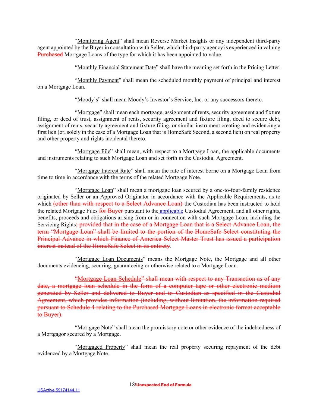 18!Unexpected End of Formula USActive 59174144.11 “Monitoring Agent” shall mean Reverse Market Insights or any independent third-party agent appointed by the Buyer in consultation with Seller, which third-party agency is experienced in valuing Purchased Mortgage Loans of the type for which it has been appointed to value. “Monthly Financial Statement Date” shall have the meaning set forth in the Pricing Letter. “Monthly Payment” shall mean the scheduled monthly payment of principal and interest on a Mortgage Loan. “Moody’s” shall mean Moody’s Investor’s Service, Inc. or any successors thereto. “Mortgage” shall mean each mortgage, assignment of rents, security agreement and fixture filing, or deed of trust, assignment of rents, security agreement and fixture filing, deed to secure debt, assignment of rents, security agreement and fixture filing, or similar instrument creating and evidencing a first lien (or, solely in the case of a Mortgage Loan that is HomeSafe Second, a second lien) on real property and other property and rights incidental thereto. “Mortgage File” shall mean, with respect to a Mortgage Loan, the applicable documents and instruments relating to such Mortgage Loan and set forth in the Custodial Agreement. “Mortgage Interest Rate” shall mean the rate of interest borne on a Mortgage Loan from time to time in accordance with the terms of the related Mortgage Note. “Mortgage Loan” shall mean a mortgage loan secured by a one-to-four-family residence originated by Seller or an Approved Originator in accordance with the Applicable Requirements, as to which (other than with respect to a Select Advance Loan) the Custodian has been instructed to hold the related Mortgage Files for Buyer pursuant to the applicable Custodial Agreement, and all other rights, benefits, proceeds and obligations arising from or in connection with such Mortgage Loan, including the Servicing Rights; provided that in the case of a Mortgage Loan that is a Select Advance Loan, the term “Mortgage Loan” shall be limited to the portion of the HomeSafe Select constituting the Principal Advance in which Finance of America Select Master Trust has issued a participation interest instead of the HomeSafe Select in its entirety. “Mortgage Loan Documents” means the Mortgage Note, the Mortgage and all other documents evidencing, securing, guaranteeing or otherwise related to a Mortgage Loan. “Mortgage Loan Schedule” shall mean with respect to any Transaction as of any date, a mortgage loan schedule in the form of a computer tape or other electronic medium generated by Seller and delivered to Buyer and to Custodian as specified in the Custodial Agreement, which provides information (including, without limitation, the information required pursuant to Schedule 4 relating to the Purchased Mortgage Loans in electronic format acceptable to Buyer). “Mortgage Note” shall mean the promissory note or other evidence of the indebtedness of a Mortgagor secured by a Mortgage. “Mortgaged Property” shall mean the real property securing repayment of the debt evidenced by a Mortgage Note.