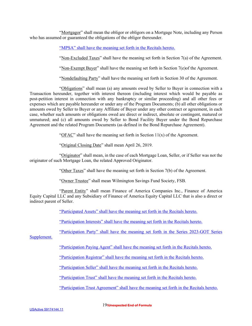19!Unexpected End of Formula USActive 59174144.11 “Mortgagor” shall mean the obligor or obligors on a Mortgage Note, including any Person who has assumed or guaranteed the obligations of the obligor thereunder. “MPSA” shall have the meaning set forth in the Recitals hereto. “Non-Excluded Taxes” shall have the meaning set forth in Section 7(a) of the Agreement. “Non-Exempt Buyer” shall have the meaning set forth in Section 7(e)of the Agreement. “Nondefaulting Party” shall have the meaning set forth in Section 30 of the Agreement. “Obligations” shall mean (a) any amounts owed by Seller to Buyer in connection with a Transaction hereunder, together with interest thereon (including interest which would be payable as post-petition interest in connection with any bankruptcy or similar proceeding) and all other fees or expenses which are payable hereunder or under any of the Program Documents; (b) all other obligations or amounts owed by Seller to Buyer or any Affiliate of Buyer under any other contract or agreement, in each case, whether such amounts or obligations owed are direct or indirect, absolute or contingent, matured or unmatured; and (c) all amounts owed by Seller to Bond Facility Buyer under the Bond Repurchase Agreement and the related Program Documents (as defined in the Bond Repurchase Agreement). “OFAC” shall have the meaning set forth in Section 11(x) of the Agreement. “Original Closing Date” shall mean April 26, 2019. “Originator” shall mean, in the case of each Mortgage Loan, Seller, or if Seller was not the originator of such Mortgage Loan, the related Approved Originator. “Other Taxes” shall have the meaning set forth in Section 7(b) of the Agreement. “Owner Trustee” shall mean Wilmington Savings Fund Society, FSB. “Parent Entity” shall mean Finance of America Companies Inc., Finance of America Equity Capital LLC and any Subsidiary of Finance of America Equity Capital LLC that is also a direct or indirect parent of Seller. “Participated Assets” shall have the meaning set forth in the Recitals hereto. “Participation Interests” shall have the meaning set forth in the Recitals hereto. “Participation Party” shall have the meaning set forth in the Series 2023-GOT Series Supplement. “Participation Paying Agent” shall have the meaning set forth in the Recitals hereto. “Participation Registrar” shall have the meaning set forth in the Recitals hereto. “Participation Seller” shall have the meaning set forth in the Recitals hereto. “Participation Trust” shall have the meaning set forth in the Recitals hereto. “Participation Trust Agreement” shall have the meaning set forth in the Recitals hereto.