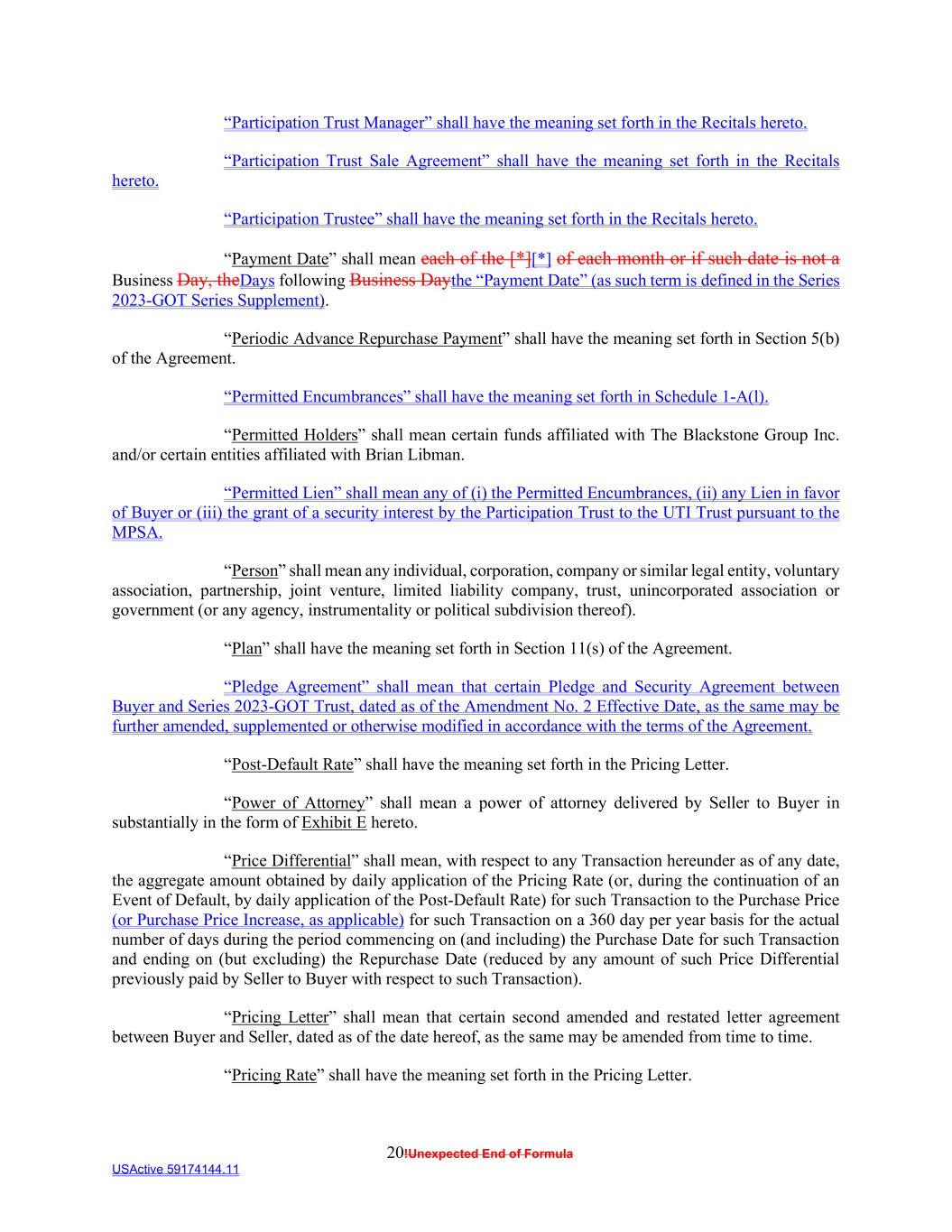 20!Unexpected End of Formula USActive 59174144.11 “Participation Trust Manager” shall have the meaning set forth in the Recitals hereto. “Participation Trust Sale Agreement” shall have the meaning set forth in the Recitals hereto. “Participation Trustee” shall have the meaning set forth in the Recitals hereto. “Payment Date” shall mean each of the [*][*] of each month or if such date is not a Business Day, theDays following Business Daythe “Payment Date” (as such term is defined in the Series 2023-GOT Series Supplement). “Periodic Advance Repurchase Payment” shall have the meaning set forth in Section 5(b) of the Agreement. “Permitted Encumbrances” shall have the meaning set forth in Schedule 1-A(l). “Permitted Holders” shall mean certain funds affiliated with The Blackstone Group Inc. and/or certain entities affiliated with Brian Libman. “Permitted Lien” shall mean any of (i) the Permitted Encumbrances, (ii) any Lien in favor of Buyer or (iii) the grant of a security interest by the Participation Trust to the UTI Trust pursuant to the MPSA. “Person” shall mean any individual, corporation, company or similar legal entity, voluntary association, partnership, joint venture, limited liability company, trust, unincorporated association or government (or any agency, instrumentality or political subdivision thereof). “Plan” shall have the meaning set forth in Section 11(s) of the Agreement. “Pledge Agreement” shall mean that certain Pledge and Security Agreement between Buyer and Series 2023-GOT Trust, dated as of the Amendment No. 2 Effective Date, as the same may be further amended, supplemented or otherwise modified in accordance with the terms of the Agreement. “Post-Default Rate” shall have the meaning set forth in the Pricing Letter. “Power of Attorney” shall mean a power of attorney delivered by Seller to Buyer in substantially in the form of Exhibit E hereto. “Price Differential” shall mean, with respect to any Transaction hereunder as of any date, the aggregate amount obtained by daily application of the Pricing Rate (or, during the continuation of an Event of Default, by daily application of the Post-Default Rate) for such Transaction to the Purchase Price (or Purchase Price Increase, as applicable) for such Transaction on a 360 day per year basis for the actual number of days during the period commencing on (and including) the Purchase Date for such Transaction and ending on (but excluding) the Repurchase Date (reduced by any amount of such Price Differential previously paid by Seller to Buyer with respect to such Transaction). “Pricing Letter” shall mean that certain second amended and restated letter agreement between Buyer and Seller, dated as of the date hereof, as the same may be amended from time to time. “Pricing Rate” shall have the meaning set forth in the Pricing Letter.