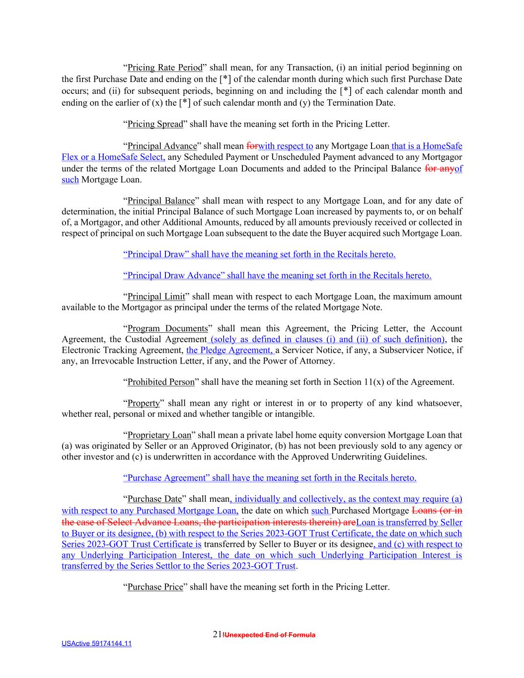 21!Unexpected End of Formula USActive 59174144.11 “Pricing Rate Period” shall mean, for any Transaction, (i) an initial period beginning on the first Purchase Date and ending on the [*] of the calendar month during which such first Purchase Date occurs; and (ii) for subsequent periods, beginning on and including the [*] of each calendar month and ending on the earlier of (x) the [*] of such calendar month and (y) the Termination Date. “Pricing Spread” shall have the meaning set forth in the Pricing Letter. “Principal Advance” shall mean forwith respect to any Mortgage Loan that is a HomeSafe Flex or a HomeSafe Select, any Scheduled Payment or Unscheduled Payment advanced to any Mortgagor under the terms of the related Mortgage Loan Documents and added to the Principal Balance for anyof such Mortgage Loan. “Principal Balance” shall mean with respect to any Mortgage Loan, and for any date of determination, the initial Principal Balance of such Mortgage Loan increased by payments to, or on behalf of, a Mortgagor, and other Additional Amounts, reduced by all amounts previously received or collected in respect of principal on such Mortgage Loan subsequent to the date the Buyer acquired such Mortgage Loan. “Principal Draw” shall have the meaning set forth in the Recitals hereto. “Principal Draw Advance” shall have the meaning set forth in the Recitals hereto. “Principal Limit” shall mean with respect to each Mortgage Loan, the maximum amount available to the Mortgagor as principal under the terms of the related Mortgage Note. “Program Documents” shall mean this Agreement, the Pricing Letter, the Account Agreement, the Custodial Agreement (solely as defined in clauses (i) and (ii) of such definition), the Electronic Tracking Agreement, the Pledge Agreement, a Servicer Notice, if any, a Subservicer Notice, if any, an Irrevocable Instruction Letter, if any, and the Power of Attorney. “Prohibited Person” shall have the meaning set forth in Section 11(x) of the Agreement. “Property” shall mean any right or interest in or to property of any kind whatsoever, whether real, personal or mixed and whether tangible or intangible. “Proprietary Loan” shall mean a private label home equity conversion Mortgage Loan that (a) was originated by Seller or an Approved Originator, (b) has not been previously sold to any agency or other investor and (c) is underwritten in accordance with the Approved Underwriting Guidelines. “Purchase Agreement” shall have the meaning set forth in the Recitals hereto. “Purchase Date” shall mean, individually and collectively, as the context may require (a) with respect to any Purchased Mortgage Loan, the date on which such Purchased Mortgage Loans (or in the case of Select Advance Loans, the participation interests therein) areLoan is transferred by Seller to Buyer or its designee, (b) with respect to the Series 2023-GOT Trust Certificate, the date on which such Series 2023-GOT Trust Certificate is transferred by Seller to Buyer or its designee, and (c) with respect to any Underlying Participation Interest, the date on which such Underlying Participation Interest is transferred by the Series Settlor to the Series 2023-GOT Trust. “Purchase Price” shall have the meaning set forth in the Pricing Letter.