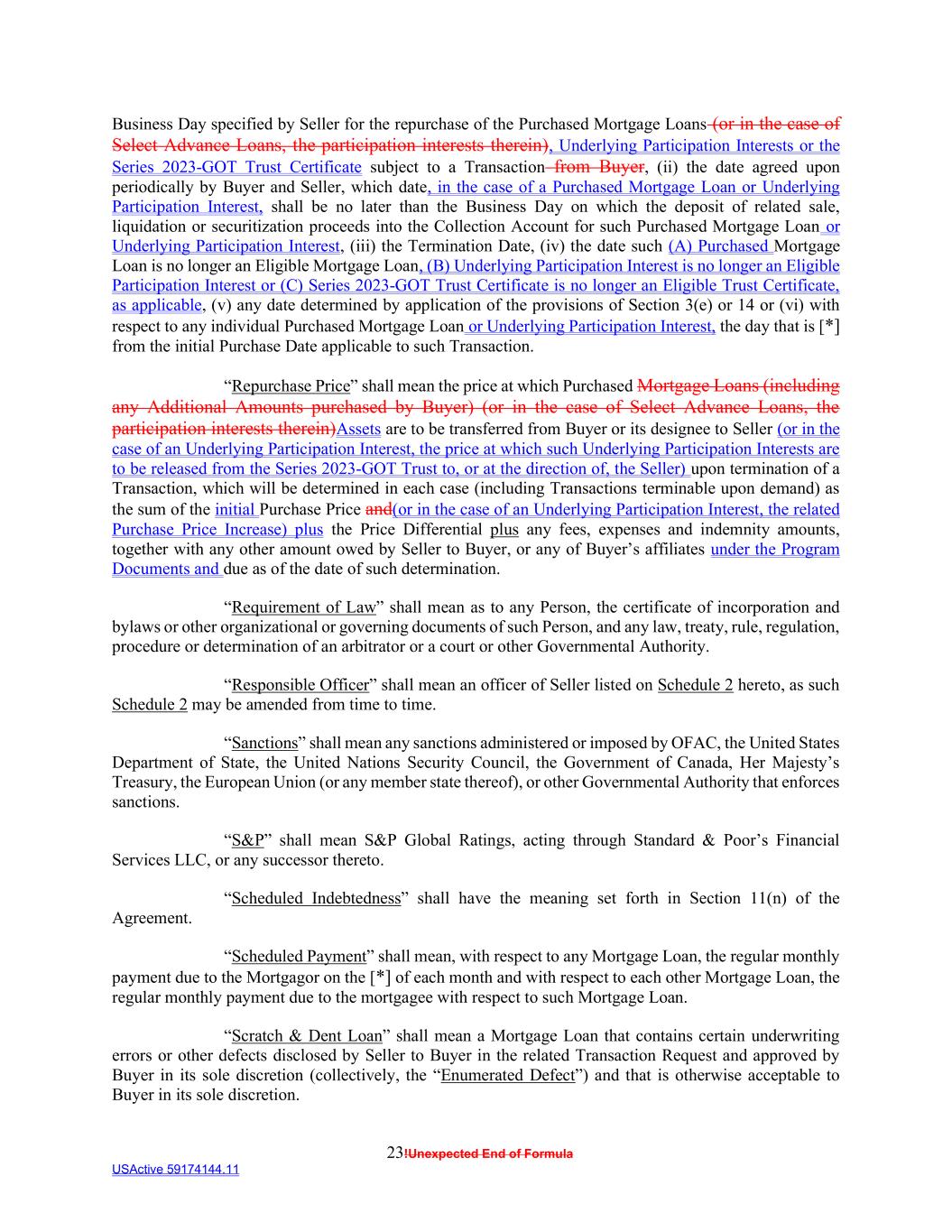 23!Unexpected End of Formula USActive 59174144.11 Business Day specified by Seller for the repurchase of the Purchased Mortgage Loans (or in the case of Select Advance Loans, the participation interests therein), Underlying Participation Interests or the Series 2023-GOT Trust Certificate subject to a Transaction from Buyer, (ii) the date agreed upon periodically by Buyer and Seller, which date, in the case of a Purchased Mortgage Loan or Underlying Participation Interest, shall be no later than the Business Day on which the deposit of related sale, liquidation or securitization proceeds into the Collection Account for such Purchased Mortgage Loan or Underlying Participation Interest, (iii) the Termination Date, (iv) the date such (A) Purchased Mortgage Loan is no longer an Eligible Mortgage Loan, (B) Underlying Participation Interest is no longer an Eligible Participation Interest or (C) Series 2023-GOT Trust Certificate is no longer an Eligible Trust Certificate, as applicable, (v) any date determined by application of the provisions of Section 3(e) or 14 or (vi) with respect to any individual Purchased Mortgage Loan or Underlying Participation Interest, the day that is [*] from the initial Purchase Date applicable to such Transaction. “Repurchase Price” shall mean the price at which Purchased Mortgage Loans (including any Additional Amounts purchased by Buyer) (or in the case of Select Advance Loans, the participation interests therein)Assets are to be transferred from Buyer or its designee to Seller (or in the case of an Underlying Participation Interest, the price at which such Underlying Participation Interests are to be released from the Series 2023-GOT Trust to, or at the direction of, the Seller) upon termination of a Transaction, which will be determined in each case (including Transactions terminable upon demand) as the sum of the initial Purchase Price and(or in the case of an Underlying Participation Interest, the related Purchase Price Increase) plus the Price Differential plus any fees, expenses and indemnity amounts, together with any other amount owed by Seller to Buyer, or any of Buyer’s affiliates under the Program Documents and due as of the date of such determination. “Requirement of Law” shall mean as to any Person, the certificate of incorporation and bylaws or other organizational or governing documents of such Person, and any law, treaty, rule, regulation, procedure or determination of an arbitrator or a court or other Governmental Authority. “Responsible Officer” shall mean an officer of Seller listed on Schedule 2 hereto, as such Schedule 2 may be amended from time to time. “Sanctions” shall mean any sanctions administered or imposed by OFAC, the United States Department of State, the United Nations Security Council, the Government of Canada, Her Majesty’s Treasury, the European Union (or any member state thereof), or other Governmental Authority that enforces sanctions. “S&P” shall mean S&P Global Ratings, acting through Standard & Poor’s Financial Services LLC, or any successor thereto. “Scheduled Indebtedness” shall have the meaning set forth in Section 11(n) of the Agreement. “Scheduled Payment” shall mean, with respect to any Mortgage Loan, the regular monthly payment due to the Mortgagor on the [*] of each month and with respect to each other Mortgage Loan, the regular monthly payment due to the mortgagee with respect to such Mortgage Loan. “Scratch & Dent Loan” shall mean a Mortgage Loan that contains certain underwriting errors or other defects disclosed by Seller to Buyer in the related Transaction Request and approved by Buyer in its sole discretion (collectively, the “Enumerated Defect”) and that is otherwise acceptable to Buyer in its sole discretion.