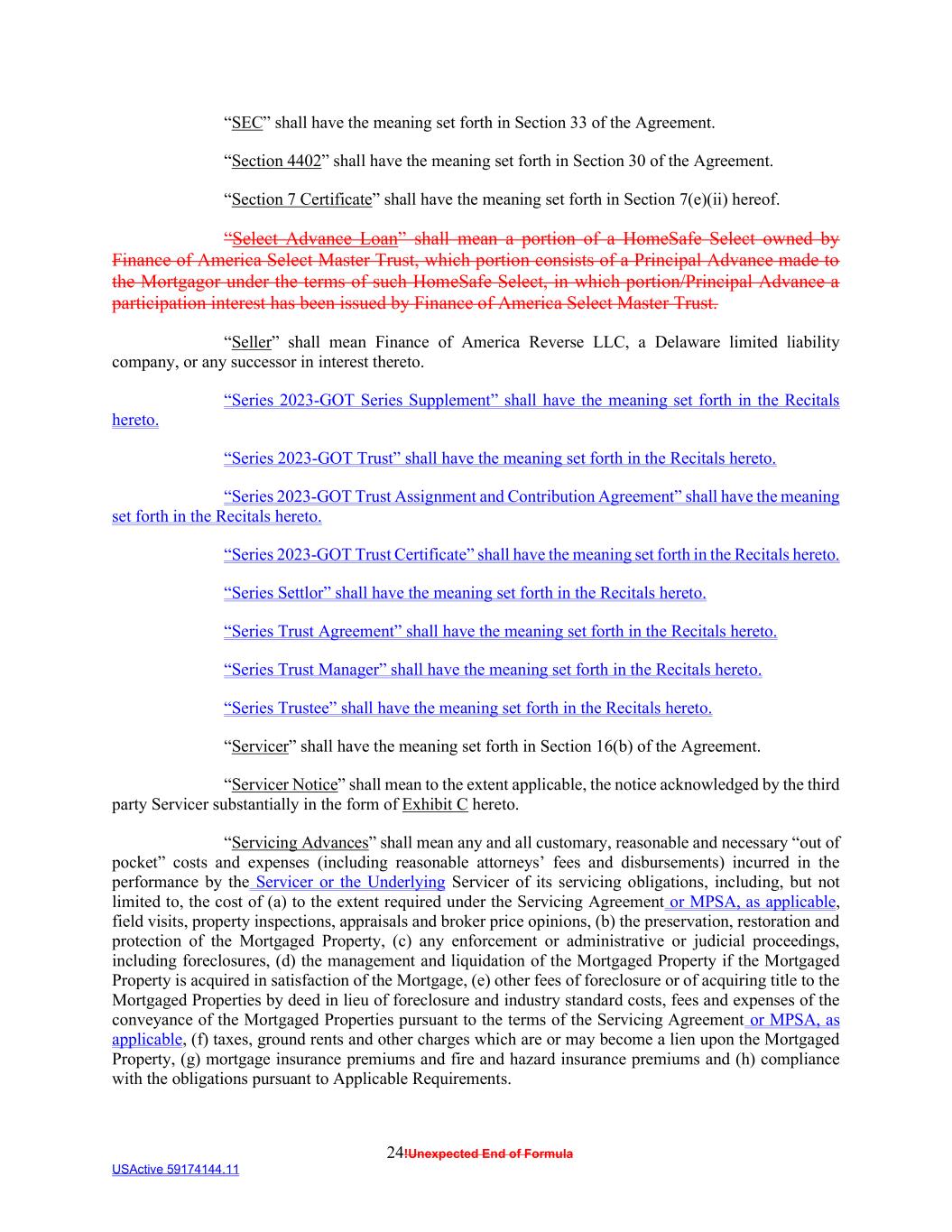 24!Unexpected End of Formula USActive 59174144.11 “SEC” shall have the meaning set forth in Section 33 of the Agreement. “Section 4402” shall have the meaning set forth in Section 30 of the Agreement. “Section 7 Certificate” shall have the meaning set forth in Section 7(e)(ii) hereof. “Select Advance Loan” shall mean a portion of a HomeSafe Select owned by Finance of America Select Master Trust, which portion consists of a Principal Advance made to the Mortgagor under the terms of such HomeSafe Select, in which portion/Principal Advance a participation interest has been issued by Finance of America Select Master Trust. “Seller” shall mean Finance of America Reverse LLC, a Delaware limited liability company, or any successor in interest thereto. “Series 2023-GOT Series Supplement” shall have the meaning set forth in the Recitals hereto. “Series 2023-GOT Trust” shall have the meaning set forth in the Recitals hereto. “Series 2023-GOT Trust Assignment and Contribution Agreement” shall have the meaning set forth in the Recitals hereto. “Series 2023-GOT Trust Certificate” shall have the meaning set forth in the Recitals hereto. “Series Settlor” shall have the meaning set forth in the Recitals hereto. “Series Trust Agreement” shall have the meaning set forth in the Recitals hereto. “Series Trust Manager” shall have the meaning set forth in the Recitals hereto. “Series Trustee” shall have the meaning set forth in the Recitals hereto. “Servicer” shall have the meaning set forth in Section 16(b) of the Agreement. “Servicer Notice” shall mean to the extent applicable, the notice acknowledged by the third party Servicer substantially in the form of Exhibit C hereto. “Servicing Advances” shall mean any and all customary, reasonable and necessary “out of pocket” costs and expenses (including reasonable attorneys’ fees and disbursements) incurred in the performance by the Servicer or the Underlying Servicer of its servicing obligations, including, but not limited to, the cost of (a) to the extent required under the Servicing Agreement or MPSA, as applicable, field visits, property inspections, appraisals and broker price opinions, (b) the preservation, restoration and protection of the Mortgaged Property, (c) any enforcement or administrative or judicial proceedings, including foreclosures, (d) the management and liquidation of the Mortgaged Property if the Mortgaged Property is acquired in satisfaction of the Mortgage, (e) other fees of foreclosure or of acquiring title to the Mortgaged Properties by deed in lieu of foreclosure and industry standard costs, fees and expenses of the conveyance of the Mortgaged Properties pursuant to the terms of the Servicing Agreement or MPSA, as applicable, (f) taxes, ground rents and other charges which are or may become a lien upon the Mortgaged Property, (g) mortgage insurance premiums and fire and hazard insurance premiums and (h) compliance with the obligations pursuant to Applicable Requirements.