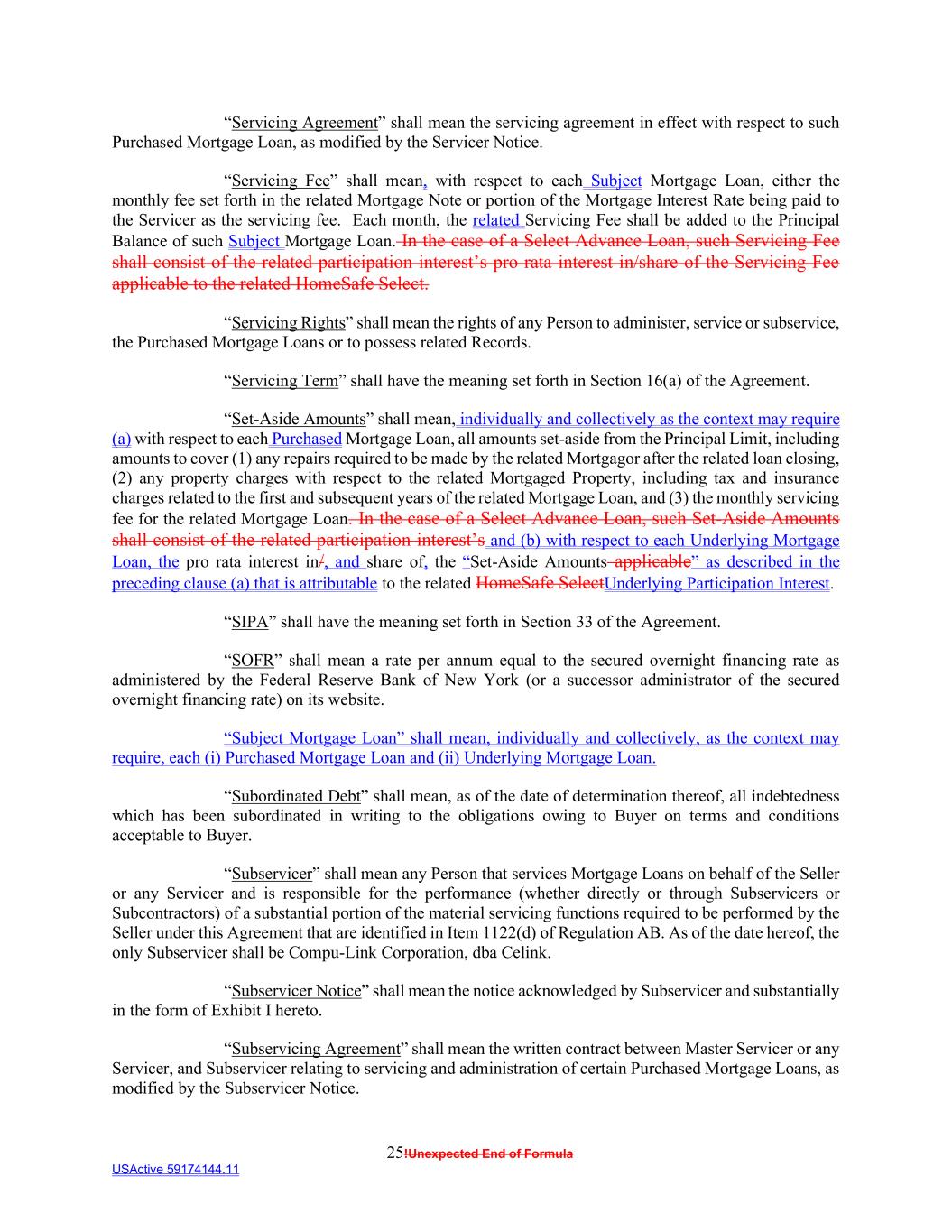 25!Unexpected End of Formula USActive 59174144.11 “Servicing Agreement” shall mean the servicing agreement in effect with respect to such Purchased Mortgage Loan, as modified by the Servicer Notice. “Servicing Fee” shall mean, with respect to each Subject Mortgage Loan, either the monthly fee set forth in the related Mortgage Note or portion of the Mortgage Interest Rate being paid to the Servicer as the servicing fee. Each month, the related Servicing Fee shall be added to the Principal Balance of such Subject Mortgage Loan. In the case of a Select Advance Loan, such Servicing Fee shall consist of the related participation interest’s pro rata interest in/share of the Servicing Fee applicable to the related HomeSafe Select. “Servicing Rights” shall mean the rights of any Person to administer, service or subservice, the Purchased Mortgage Loans or to possess related Records. “Servicing Term” shall have the meaning set forth in Section 16(a) of the Agreement. “Set-Aside Amounts” shall mean, individually and collectively as the context may require (a) with respect to each Purchased Mortgage Loan, all amounts set-aside from the Principal Limit, including amounts to cover (1) any repairs required to be made by the related Mortgagor after the related loan closing, (2) any property charges with respect to the related Mortgaged Property, including tax and insurance charges related to the first and subsequent years of the related Mortgage Loan, and (3) the monthly servicing fee for the related Mortgage Loan. In the case of a Select Advance Loan, such Set-Aside Amounts shall consist of the related participation interest’s and (b) with respect to each Underlying Mortgage Loan, the pro rata interest in/, and share of, the “Set-Aside Amounts applicable” as described in the preceding clause (a) that is attributable to the related HomeSafe SelectUnderlying Participation Interest. “SIPA” shall have the meaning set forth in Section 33 of the Agreement. “SOFR” shall mean a rate per annum equal to the secured overnight financing rate as administered by the Federal Reserve Bank of New York (or a successor administrator of the secured overnight financing rate) on its website. “Subject Mortgage Loan” shall mean, individually and collectively, as the context may require, each (i) Purchased Mortgage Loan and (ii) Underlying Mortgage Loan. “Subordinated Debt” shall mean, as of the date of determination thereof, all indebtedness which has been subordinated in writing to the obligations owing to Buyer on terms and conditions acceptable to Buyer. “Subservicer” shall mean any Person that services Mortgage Loans on behalf of the Seller or any Servicer and is responsible for the performance (whether directly or through Subservicers or Subcontractors) of a substantial portion of the material servicing functions required to be performed by the Seller under this Agreement that are identified in Item 1122(d) of Regulation AB. As of the date hereof, the only Subservicer shall be Compu-Link Corporation, dba Celink. “Subservicer Notice” shall mean the notice acknowledged by Subservicer and substantially in the form of Exhibit I hereto. “Subservicing Agreement” shall mean the written contract between Master Servicer or any Servicer, and Subservicer relating to servicing and administration of certain Purchased Mortgage Loans, as modified by the Subservicer Notice.