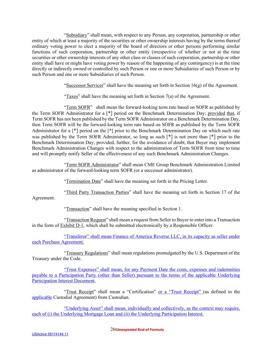 26!Unexpected End of Formula USActive 59174144.11 “Subsidiary” shall mean, with respect to any Person, any corporation, partnership or other entity of which at least a majority of the securities or other ownership interests having by the terms thereof ordinary voting power to elect a majority of the board of directors or other persons performing similar functions of such corporation, partnership or other entity (irrespective of whether or not at the time securities or other ownership interests of any other class or classes of such corporation, partnership or other entity shall have or might have voting power by reason of the happening of any contingency) is at the time directly or indirectly owned or controlled by such Person or one or more Subsidiaries of such Person or by such Person and one or more Subsidiaries of such Person. “Successor Servicer” shall have the meaning set forth in Section 16(g) of the Agreement. “Taxes” shall have the meaning set forth in Section 7(a) of the Agreement. “Term SOFR” shall mean the forward-looking term rate based on SOFR as published by the Term SOFR Administrator for a [*] period on the Benchmark Determination Day; provided that, if Term SOFR has not been published by the Term SOFR Administrator on a Benchmark Determination Day, then Term SOFR will be the forward-looking term rate based on SOFR as published by the Term SOFR Administrator for a [*] period on the [*] prior to the Benchmark Determination Day on which such rate was published by the Term SOFR Administrator, so long as such [*] is not more than [*] prior to the Benchmark Determination Day; provided, further, for the avoidance of doubt, that Buyer may implement Benchmark Administration Changes with respect to the administration of Term SOFR from time to time and will promptly notify Seller of the effectiveness of any such Benchmark Administration Changes. “Term SOFR Administrator” shall mean CME Group Benchmark Administration Limited as administrator of the forward-looking term SOFR (or a successor administrator). “Termination Date” shall have the meaning set forth in the Pricing Letter. “Third Party Transaction Parties” shall have the meaning set forth in Section 17 of the Agreement. “Transaction” shall have the meaning specified in Section 1. “Transaction Request” shall mean a request from Seller to Buyer to enter into a Transaction in the form of Exhibit D-1, which shall be submitted electronically by a Responsible Officer. “Transferor” shall mean Finance of America Reverse LLC, in its capacity as seller under each Purchase Agreement. “Treasury Regulations” shall mean regulations promulgated by the U.S. Department of the Treasury under the Code. “Trust Expenses” shall mean, for any Payment Date the costs, expenses and indemnities payable to a Participation Party (other than Seller) pursuant to the terms of the applicable Underlying Participation Interest Document. “Trust Receipt” shall mean a “Certification” or a “Trust Receipt” (as defined in the applicable Custodial Agreement) from Custodian. “Underlying Asset” shall mean, individually and collectively, as the context may require, each of (i) the Underlying Mortgage Loan and (ii) the Underlying Participation Interest.