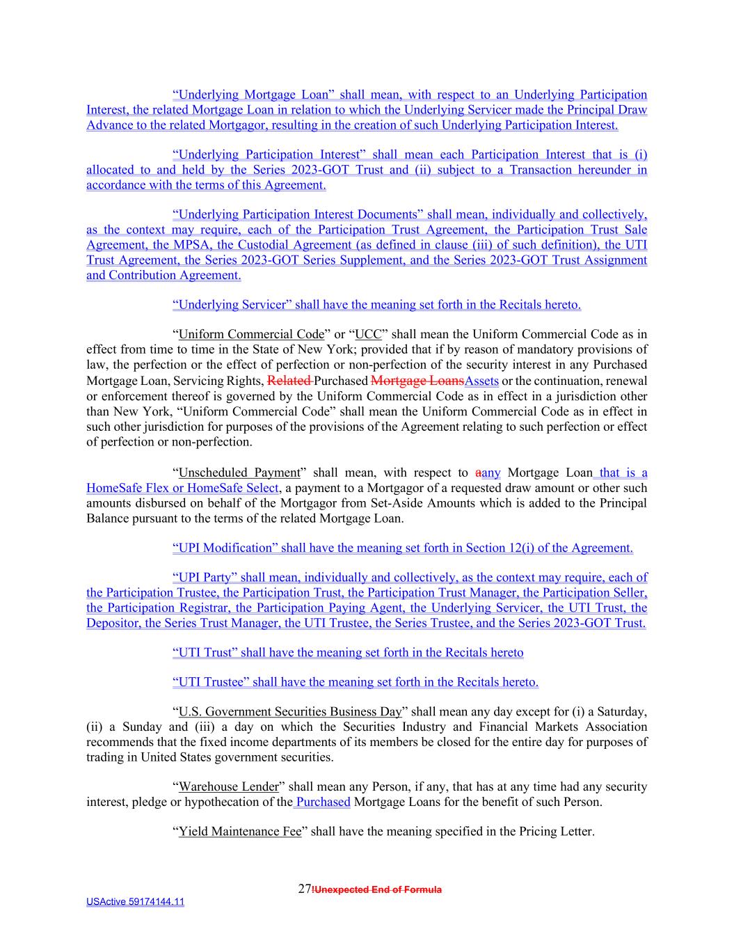 27!Unexpected End of Formula USActive 59174144.11 “Underlying Mortgage Loan” shall mean, with respect to an Underlying Participation Interest, the related Mortgage Loan in relation to which the Underlying Servicer made the Principal Draw Advance to the related Mortgagor, resulting in the creation of such Underlying Participation Interest. “Underlying Participation Interest” shall mean each Participation Interest that is (i) allocated to and held by the Series 2023-GOT Trust and (ii) subject to a Transaction hereunder in accordance with the terms of this Agreement. “Underlying Participation Interest Documents” shall mean, individually and collectively, as the context may require, each of the Participation Trust Agreement, the Participation Trust Sale Agreement, the MPSA, the Custodial Agreement (as defined in clause (iii) of such definition), the UTI Trust Agreement, the Series 2023-GOT Series Supplement, and the Series 2023-GOT Trust Assignment and Contribution Agreement. “Underlying Servicer” shall have the meaning set forth in the Recitals hereto. “Uniform Commercial Code” or “UCC” shall mean the Uniform Commercial Code as in effect from time to time in the State of New York; provided that if by reason of mandatory provisions of law, the perfection or the effect of perfection or non-perfection of the security interest in any Purchased Mortgage Loan, Servicing Rights, Related Purchased Mortgage LoansAssets or the continuation, renewal or enforcement thereof is governed by the Uniform Commercial Code as in effect in a jurisdiction other than New York, “Uniform Commercial Code” shall mean the Uniform Commercial Code as in effect in such other jurisdiction for purposes of the provisions of the Agreement relating to such perfection or effect of perfection or non-perfection. “Unscheduled Payment” shall mean, with respect to aany Mortgage Loan that is a HomeSafe Flex or HomeSafe Select, a payment to a Mortgagor of a requested draw amount or other such amounts disbursed on behalf of the Mortgagor from Set-Aside Amounts which is added to the Principal Balance pursuant to the terms of the related Mortgage Loan. “UPI Modification” shall have the meaning set forth in Section 12(i) of the Agreement. “UPI Party” shall mean, individually and collectively, as the context may require, each of the Participation Trustee, the Participation Trust, the Participation Trust Manager, the Participation Seller, the Participation Registrar, the Participation Paying Agent, the Underlying Servicer, the UTI Trust, the Depositor, the Series Trust Manager, the UTI Trustee, the Series Trustee, and the Series 2023-GOT Trust. “UTI Trust” shall have the meaning set forth in the Recitals hereto “UTI Trustee” shall have the meaning set forth in the Recitals hereto. “U.S. Government Securities Business Day” shall mean any day except for (i) a Saturday, (ii) a Sunday and (iii) a day on which the Securities Industry and Financial Markets Association recommends that the fixed income departments of its members be closed for the entire day for purposes of trading in United States government securities. “Warehouse Lender” shall mean any Person, if any, that has at any time had any security interest, pledge or hypothecation of the Purchased Mortgage Loans for the benefit of such Person. “Yield Maintenance Fee” shall have the meaning specified in the Pricing Letter.
