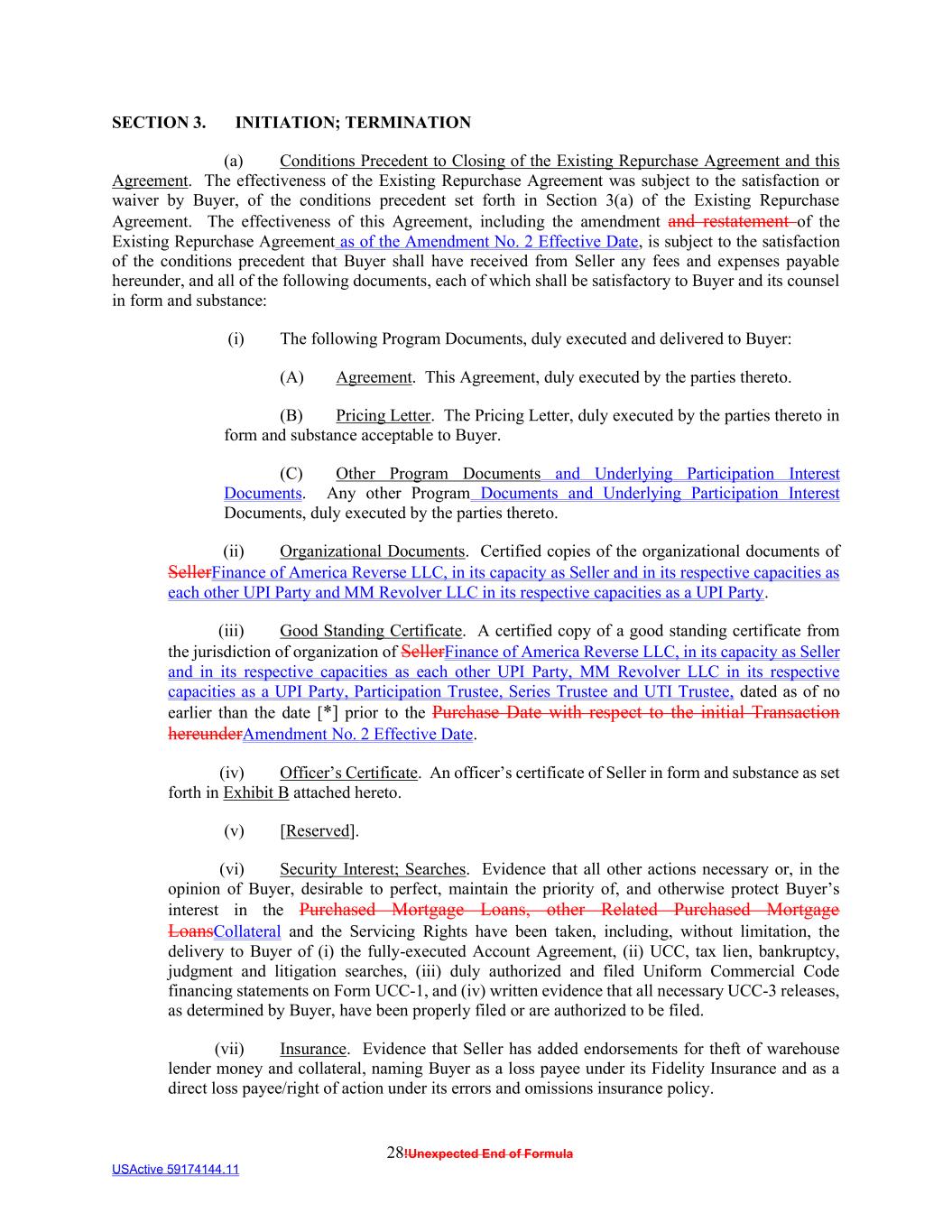 28!Unexpected End of Formula USActive 59174144.11 SECTION 3. INITIATION; TERMINATION (a) Conditions Precedent to Closing of the Existing Repurchase Agreement and this Agreement. The effectiveness of the Existing Repurchase Agreement was subject to the satisfaction or waiver by Buyer, of the conditions precedent set forth in Section 3(a) of the Existing Repurchase Agreement. The effectiveness of this Agreement, including the amendment and restatement of the Existing Repurchase Agreement as of the Amendment No. 2 Effective Date, is subject to the satisfaction of the conditions precedent that Buyer shall have received from Seller any fees and expenses payable hereunder, and all of the following documents, each of which shall be satisfactory to Buyer and its counsel in form and substance: (i) The following Program Documents, duly executed and delivered to Buyer: (A) Agreement. This Agreement, duly executed by the parties thereto. (B) Pricing Letter. The Pricing Letter, duly executed by the parties thereto in form and substance acceptable to Buyer. (C) Other Program Documents and Underlying Participation Interest Documents. Any other Program Documents and Underlying Participation Interest Documents, duly executed by the parties thereto. (ii) Organizational Documents. Certified copies of the organizational documents of SellerFinance of America Reverse LLC, in its capacity as Seller and in its respective capacities as each other UPI Party and MM Revolver LLC in its respective capacities as a UPI Party. (iii) Good Standing Certificate. A certified copy of a good standing certificate from the jurisdiction of organization of SellerFinance of America Reverse LLC, in its capacity as Seller and in its respective capacities as each other UPI Party, MM Revolver LLC in its respective capacities as a UPI Party, Participation Trustee, Series Trustee and UTI Trustee, dated as of no earlier than the date [*] prior to the Purchase Date with respect to the initial Transaction hereunderAmendment No. 2 Effective Date. (iv) Officer’s Certificate. An officer’s certificate of Seller in form and substance as set forth in Exhibit B attached hereto. (v) [Reserved]. (vi) Security Interest; Searches. Evidence that all other actions necessary or, in the opinion of Buyer, desirable to perfect, maintain the priority of, and otherwise protect Buyer’s interest in the Purchased Mortgage Loans, other Related Purchased Mortgage LoansCollateral and the Servicing Rights have been taken, including, without limitation, the delivery to Buyer of (i) the fully-executed Account Agreement, (ii) UCC, tax lien, bankruptcy, judgment and litigation searches, (iii) duly authorized and filed Uniform Commercial Code financing statements on Form UCC-1, and (iv) written evidence that all necessary UCC-3 releases, as determined by Buyer, have been properly filed or are authorized to be filed. (vii) Insurance. Evidence that Seller has added endorsements for theft of warehouse lender money and collateral, naming Buyer as a loss payee under its Fidelity Insurance and as a direct loss payee/right of action under its errors and omissions insurance policy.