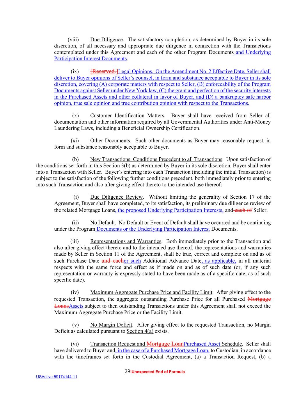 29!Unexpected End of Formula USActive 59174144.11 (viii) Due Diligence. The satisfactory completion, as determined by Buyer in its sole discretion, of all necessary and appropriate due diligence in connection with the Transactions contemplated under this Agreement and each of the other Program Documents and Underlying Participation Interest Documents. (ix) [Reserved.]Legal Opinions. On the Amendment No. 2 Effective Date, Seller shall deliver to Buyer opinions of Seller’s counsel, in form and substance acceptable to Buyer in its sole discretion, covering (A) corporate matters with respect to Seller, (B) enforceability of the Program Documents against Seller under New York law, (C) the grant and perfection of the security interests in the Purchased Assets and other collateral in favor of Buyer, and (D) a bankruptcy safe harbor opinion, true sale opinion and true contribution opinion with respect to the Transactions. (x) Customer Identification Matters. Buyer shall have received from Seller all documentation and other information required by all Governmental Authorities under Anti-Money Laundering Laws, including a Beneficial Ownership Certification. (xi) Other Documents. Such other documents as Buyer may reasonably request, in form and substance reasonably acceptable to Buyer. (b) New Transactions; Conditions Precedent to all Transactions. Upon satisfaction of the conditions set forth in this Section 3(b) as determined by Buyer in its sole discretion, Buyer shall enter into a Transaction with Seller. Buyer’s entering into each Transaction (including the initial Transaction) is subject to the satisfaction of the following further conditions precedent, both immediately prior to entering into such Transaction and also after giving effect thereto to the intended use thereof: (i) Due Diligence Review. Without limiting the generality of Section 17 of the Agreement, Buyer shall have completed, to its satisfaction, its preliminary due diligence review of the related Mortgage Loans, the proposed Underlying Participation Interests, and each of Seller. (ii) No Default. No Default or Event of Default shall have occurred and be continuing under the Program Documents or the Underlying Participation Interest Documents. (iii) Representations and Warranties. Both immediately prior to the Transaction and also after giving effect thereto and to the intended use thereof, the representations and warranties made by Seller in Section 11 of the Agreement, shall be true, correct and complete on and as of such Purchase Date and eachor such Additional Advance Date, as applicable, in all material respects with the same force and effect as if made on and as of such date (or, if any such representation or warranty is expressly stated to have been made as of a specific date, as of such specific date). (iv) Maximum Aggregate Purchase Price and Facility Limit. After giving effect to the requested Transaction, the aggregate outstanding Purchase Price for all Purchased Mortgage LoansAssets subject to then outstanding Transactions under this Agreement shall not exceed the Maximum Aggregate Purchase Price or the Facility Limit. (v) No Margin Deficit. After giving effect to the requested Transaction, no Margin Deficit as calculated pursuant to Section 4(a) exists. (vi) Transaction Request and Mortgage LoanPurchased Asset Schedule. Seller shall have delivered to Buyer and, in the case of a Purchased Mortgage Loan, to Custodian, in accordance with the timeframes set forth in the Custodial Agreement, (a) a Transaction Request, (b) a