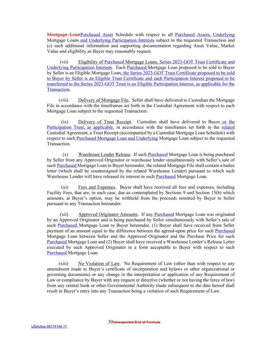 30!Unexpected End of Formula USActive 59174144.11 Mortgage LoanPurchased Asset Schedule with respect to all Purchased Assets, Underlying Mortgage Loans and Underlying Participation Interests subject to the requested Transaction and (c) such additional information and supporting documentation regarding Asset Value, Market Value and eligibility as Buyer may reasonably request. (vii) Eligibility of Purchased Mortgage Loans, Series 2023-GOT Trust Certificate and Underlying Participation Interests. Each Purchased Mortgage Loan proposed to be sold to Buyer by Seller is an Eligible Mortgage Loan, the Series 2023-GOT Trust Certificate proposed to be sold to Buyer by Seller is an Eligible Trust Certificate and each Participation Interest proposed to be transferred to the Series 2023-GOT Trust is an Eligible Participation Interest, as applicable for the Transaction. (viii) Delivery of Mortgage File. Seller shall have delivered to Custodian the Mortgage File in accordance with the timeframes set forth in the Custodial Agreement with respect to each Mortgage Loan subject to the requested Transaction. (ix) Delivery of Trust Receipt. Custodian shall have delivered to Buyer or the Participation Trust, as applicable, in accordance with the timeframes set forth in the related Custodial Agreement, a Trust Receipt (accompanied by a Custodial Mortgage Loan Schedule) with respect to each Purchased Mortgage Loan and Underlying Mortgage Loan subject to the requested Transaction. (x) Warehouse Lender Release. If such Purchased Mortgage Loan is being purchased by Seller from any Approved Originator or warehouse lender simultaneously with Seller’s sale of such Purchased Mortgage Loan to Buyer hereunder, the related Mortgage File shall contain a bailee letter (which shall be countersigned by the related Warehouse Lender) pursuant to which such Warehouse Lender will have released its interest in such Purchased Mortgage Loan. (xi) Fees and Expenses. Buyer shall have received all fees and expenses, including Facility Fees, that are, in each case, due as contemplated by Sections 9 and Section 15(b) which amounts, at Buyer’s option, may be withheld from the proceeds remitted by Buyer to Seller pursuant to any Transaction hereunder. (xii) Approved Originator Amounts. If any Purchased Mortgage Loan was originated by an Approved Originator and is being purchased by Seller simultaneously with Seller’s sale of such Purchased Mortgage Loan to Buyer hereunder, (1) Buyer shall have received from Seller payment of an amount equal to the difference between the agreed-upon price for such Purchased Mortgage Loan between Seller and the Approved Originator and the Purchase Price for such Purchased Mortgage Loan and (2) Buyer shall have received a Warehouse Lender’s Release Letter executed by such Approved Originator in a form acceptable to Buyer with respect to such Purchased Mortgage Loan. (xiii) No Violation of Law. No Requirement of Law (other than with respect to any amendment made to Buyer’s certificate of incorporation and bylaws or other organizational or governing documents) or any change in the interpretation or application of any Requirement of Law or compliance by Buyer with any request or directive (whether or not having the force of law) from any central bank or other Governmental Authority made subsequent to the date hereof shall result in Buyer’s entry into any Transaction being a violation of such Requirement of Law.