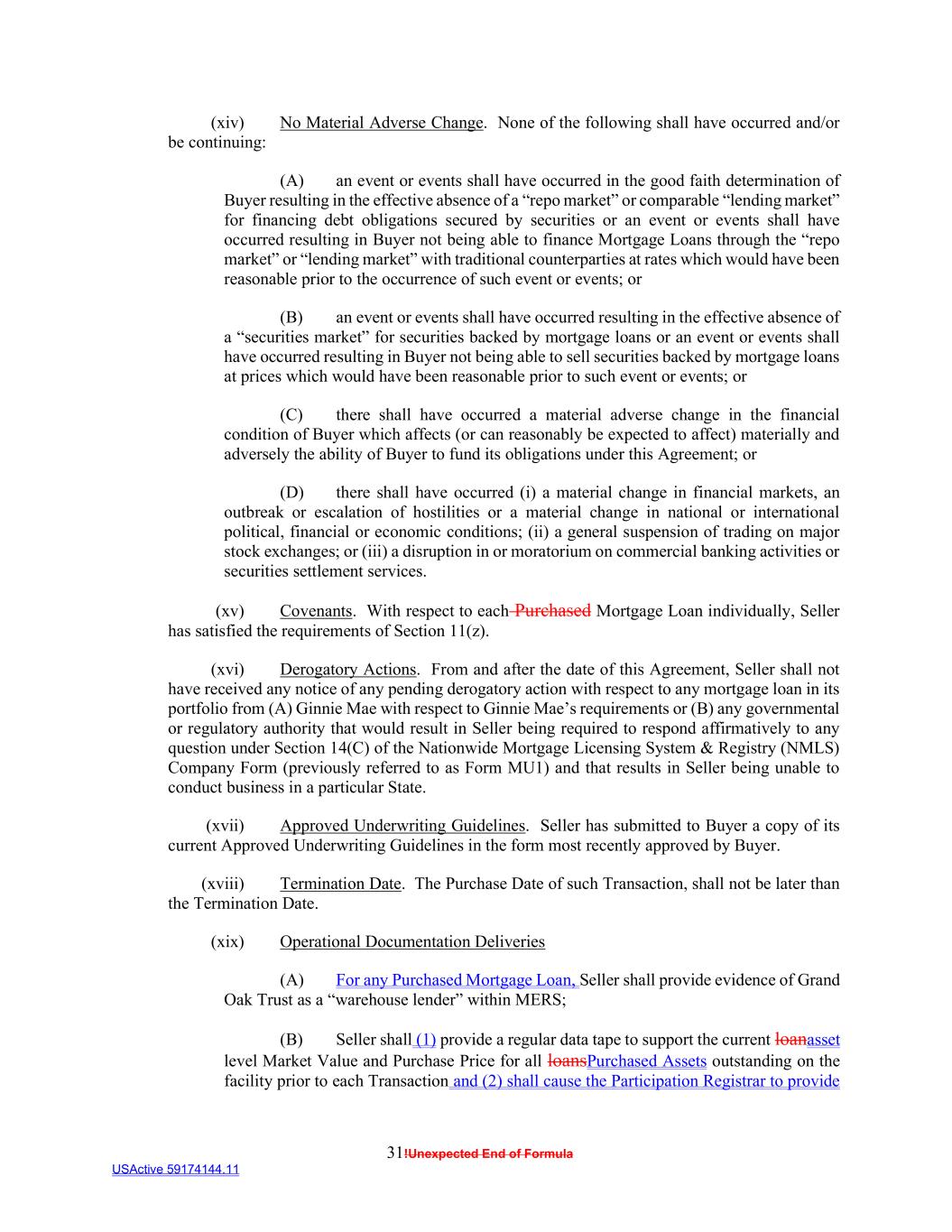 31!Unexpected End of Formula USActive 59174144.11 (xiv) No Material Adverse Change. None of the following shall have occurred and/or be continuing: (A) an event or events shall have occurred in the good faith determination of Buyer resulting in the effective absence of a “repo market” or comparable “lending market” for financing debt obligations secured by securities or an event or events shall have occurred resulting in Buyer not being able to finance Mortgage Loans through the “repo market” or “lending market” with traditional counterparties at rates which would have been reasonable prior to the occurrence of such event or events; or (B) an event or events shall have occurred resulting in the effective absence of a “securities market” for securities backed by mortgage loans or an event or events shall have occurred resulting in Buyer not being able to sell securities backed by mortgage loans at prices which would have been reasonable prior to such event or events; or (C) there shall have occurred a material adverse change in the financial condition of Buyer which affects (or can reasonably be expected to affect) materially and adversely the ability of Buyer to fund its obligations under this Agreement; or (D) there shall have occurred (i) a material change in financial markets, an outbreak or escalation of hostilities or a material change in national or international political, financial or economic conditions; (ii) a general suspension of trading on major stock exchanges; or (iii) a disruption in or moratorium on commercial banking activities or securities settlement services. (xv) Covenants. With respect to each Purchased Mortgage Loan individually, Seller has satisfied the requirements of Section 11(z). (xvi) Derogatory Actions. From and after the date of this Agreement, Seller shall not have received any notice of any pending derogatory action with respect to any mortgage loan in its portfolio from (A) Ginnie Mae with respect to Ginnie Mae’s requirements or (B) any governmental or regulatory authority that would result in Seller being required to respond affirmatively to any question under Section 14(C) of the Nationwide Mortgage Licensing System & Registry (NMLS) Company Form (previously referred to as Form MU1) and that results in Seller being unable to conduct business in a particular State. (xvii) Approved Underwriting Guidelines. Seller has submitted to Buyer a copy of its current Approved Underwriting Guidelines in the form most recently approved by Buyer. (xviii) Termination Date. The Purchase Date of such Transaction, shall not be later than the Termination Date. (xix) Operational Documentation Deliveries (A) For any Purchased Mortgage Loan, Seller shall provide evidence of Grand Oak Trust as a “warehouse lender” within MERS; (B) Seller shall (1) provide a regular data tape to support the current loanasset level Market Value and Purchase Price for all loansPurchased Assets outstanding on the facility prior to each Transaction and (2) shall cause the Participation Registrar to provide