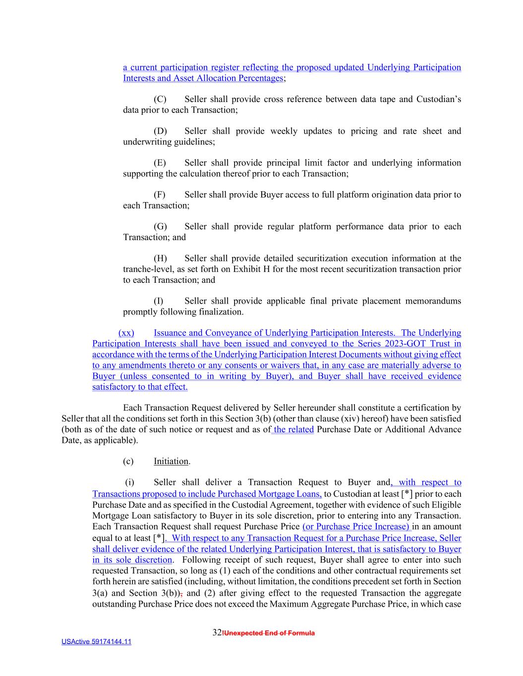 32!Unexpected End of Formula USActive 59174144.11 a current participation register reflecting the proposed updated Underlying Participation Interests and Asset Allocation Percentages; (C) Seller shall provide cross reference between data tape and Custodian’s data prior to each Transaction; (D) Seller shall provide weekly updates to pricing and rate sheet and underwriting guidelines; (E) Seller shall provide principal limit factor and underlying information supporting the calculation thereof prior to each Transaction; (F) Seller shall provide Buyer access to full platform origination data prior to each Transaction; (G) Seller shall provide regular platform performance data prior to each Transaction; and (H) Seller shall provide detailed securitization execution information at the tranche-level, as set forth on Exhibit H for the most recent securitization transaction prior to each Transaction; and (I) Seller shall provide applicable final private placement memorandums promptly following finalization. (xx) Issuance and Conveyance of Underlying Participation Interests. The Underlying Participation Interests shall have been issued and conveyed to the Series 2023-GOT Trust in accordance with the terms of the Underlying Participation Interest Documents without giving effect to any amendments thereto or any consents or waivers that, in any case are materially adverse to Buyer (unless consented to in writing by Buyer), and Buyer shall have received evidence satisfactory to that effect. Each Transaction Request delivered by Seller hereunder shall constitute a certification by Seller that all the conditions set forth in this Section 3(b) (other than clause (xiv) hereof) have been satisfied (both as of the date of such notice or request and as of the related Purchase Date or Additional Advance Date, as applicable). (c) Initiation. (i) Seller shall deliver a Transaction Request to Buyer and, with respect to Transactions proposed to include Purchased Mortgage Loans, to Custodian at least [*] prior to each Purchase Date and as specified in the Custodial Agreement, together with evidence of such Eligible Mortgage Loan satisfactory to Buyer in its sole discretion, prior to entering into any Transaction. Each Transaction Request shall request Purchase Price (or Purchase Price Increase) in an amount equal to at least [*]. With respect to any Transaction Request for a Purchase Price Increase, Seller shall deliver evidence of the related Underlying Participation Interest, that is satisfactory to Buyer in its sole discretion. Following receipt of such request, Buyer shall agree to enter into such requested Transaction, so long as (1) each of the conditions and other contractual requirements set forth herein are satisfied (including, without limitation, the conditions precedent set forth in Section 3(a) and Section 3(b)), and (2) after giving effect to the requested Transaction the aggregate outstanding Purchase Price does not exceed the Maximum Aggregate Purchase Price, in which case