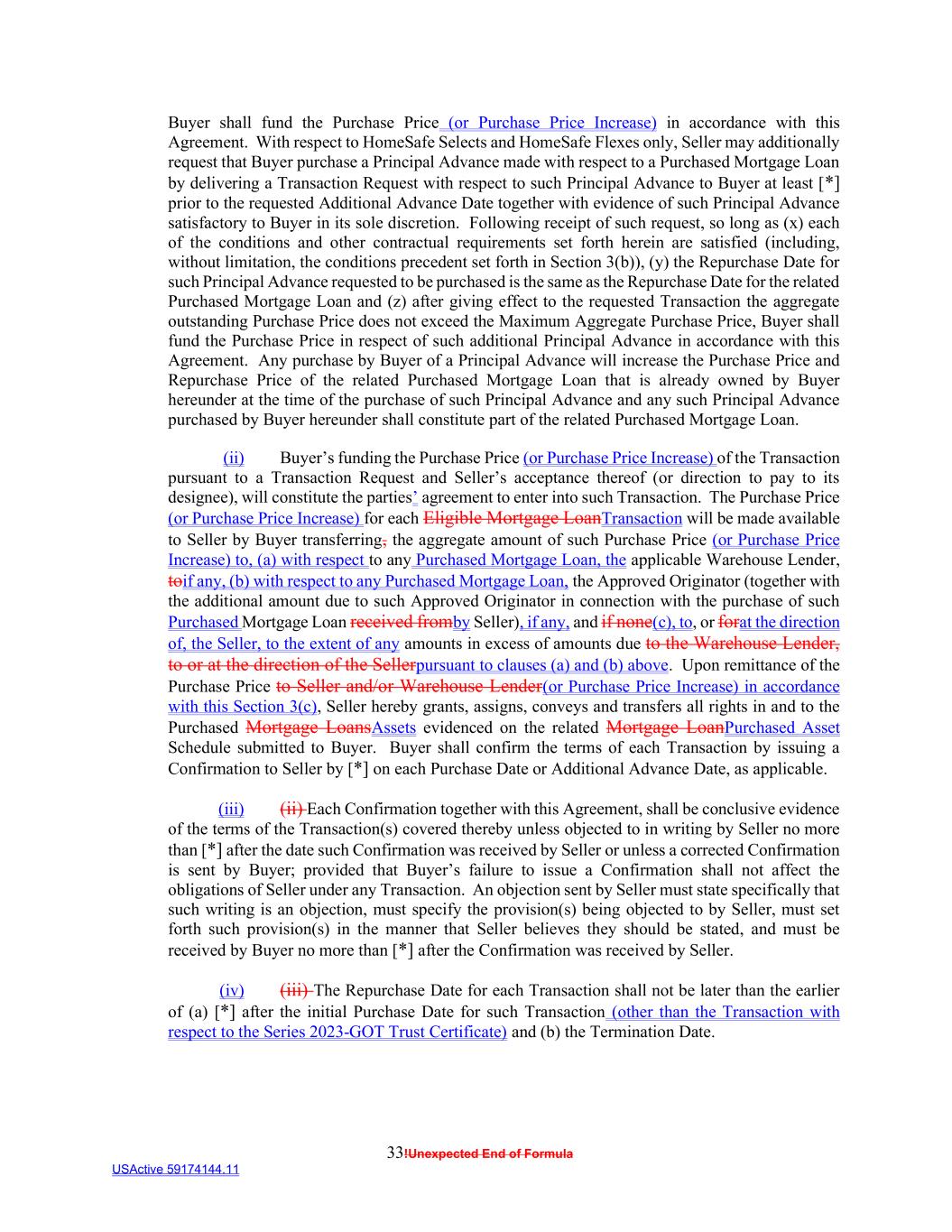 33!Unexpected End of Formula USActive 59174144.11 Buyer shall fund the Purchase Price (or Purchase Price Increase) in accordance with this Agreement. With respect to HomeSafe Selects and HomeSafe Flexes only, Seller may additionally request that Buyer purchase a Principal Advance made with respect to a Purchased Mortgage Loan by delivering a Transaction Request with respect to such Principal Advance to Buyer at least [*] prior to the requested Additional Advance Date together with evidence of such Principal Advance satisfactory to Buyer in its sole discretion. Following receipt of such request, so long as (x) each of the conditions and other contractual requirements set forth herein are satisfied (including, without limitation, the conditions precedent set forth in Section 3(b)), (y) the Repurchase Date for such Principal Advance requested to be purchased is the same as the Repurchase Date for the related Purchased Mortgage Loan and (z) after giving effect to the requested Transaction the aggregate outstanding Purchase Price does not exceed the Maximum Aggregate Purchase Price, Buyer shall fund the Purchase Price in respect of such additional Principal Advance in accordance with this Agreement. Any purchase by Buyer of a Principal Advance will increase the Purchase Price and Repurchase Price of the related Purchased Mortgage Loan that is already owned by Buyer hereunder at the time of the purchase of such Principal Advance and any such Principal Advance purchased by Buyer hereunder shall constitute part of the related Purchased Mortgage Loan. (ii) Buyer’s funding the Purchase Price (or Purchase Price Increase) of the Transaction pursuant to a Transaction Request and Seller’s acceptance thereof (or direction to pay to its designee), will constitute the parties’ agreement to enter into such Transaction. The Purchase Price (or Purchase Price Increase) for each Eligible Mortgage LoanTransaction will be made available to Seller by Buyer transferring, the aggregate amount of such Purchase Price (or Purchase Price Increase) to, (a) with respect to any Purchased Mortgage Loan, the applicable Warehouse Lender, toif any, (b) with respect to any Purchased Mortgage Loan, the Approved Originator (together with the additional amount due to such Approved Originator in connection with the purchase of such Purchased Mortgage Loan received fromby Seller), if any, and if none(c), to, or forat the direction of, the Seller, to the extent of any amounts in excess of amounts due to the Warehouse Lender, to or at the direction of the Sellerpursuant to clauses (a) and (b) above. Upon remittance of the Purchase Price to Seller and/or Warehouse Lender(or Purchase Price Increase) in accordance with this Section 3(c), Seller hereby grants, assigns, conveys and transfers all rights in and to the Purchased Mortgage LoansAssets evidenced on the related Mortgage LoanPurchased Asset Schedule submitted to Buyer. Buyer shall confirm the terms of each Transaction by issuing a Confirmation to Seller by [*] on each Purchase Date or Additional Advance Date, as applicable. (iii) (ii) Each Confirmation together with this Agreement, shall be conclusive evidence of the terms of the Transaction(s) covered thereby unless objected to in writing by Seller no more than [*] after the date such Confirmation was received by Seller or unless a corrected Confirmation is sent by Buyer; provided that Buyer’s failure to issue a Confirmation shall not affect the obligations of Seller under any Transaction. An objection sent by Seller must state specifically that such writing is an objection, must specify the provision(s) being objected to by Seller, must set forth such provision(s) in the manner that Seller believes they should be stated, and must be received by Buyer no more than [*] after the Confirmation was received by Seller. (iv) (iii) The Repurchase Date for each Transaction shall not be later than the earlier of (a) [*] after the initial Purchase Date for such Transaction (other than the Transaction with respect to the Series 2023-GOT Trust Certificate) and (b) the Termination Date.