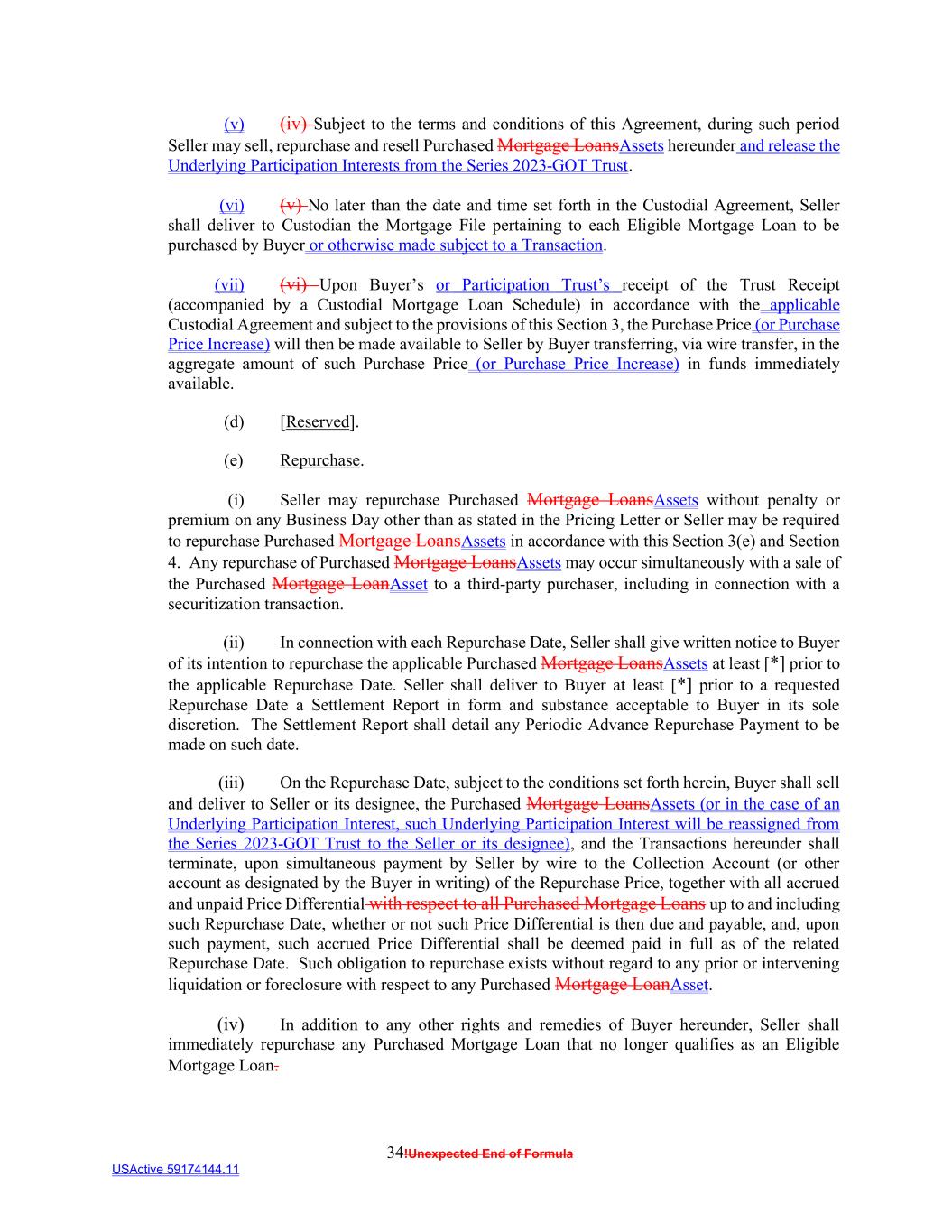 34!Unexpected End of Formula USActive 59174144.11 (v) (iv) Subject to the terms and conditions of this Agreement, during such period Seller may sell, repurchase and resell Purchased Mortgage LoansAssets hereunder and release the Underlying Participation Interests from the Series 2023-GOT Trust. (vi) (v) No later than the date and time set forth in the Custodial Agreement, Seller shall deliver to Custodian the Mortgage File pertaining to each Eligible Mortgage Loan to be purchased by Buyer or otherwise made subject to a Transaction. (vii) (vi) Upon Buyer’s or Participation Trust’s receipt of the Trust Receipt (accompanied by a Custodial Mortgage Loan Schedule) in accordance with the applicable Custodial Agreement and subject to the provisions of this Section 3, the Purchase Price (or Purchase Price Increase) will then be made available to Seller by Buyer transferring, via wire transfer, in the aggregate amount of such Purchase Price (or Purchase Price Increase) in funds immediately available. (d) [Reserved]. (e) Repurchase. (i) Seller may repurchase Purchased Mortgage LoansAssets without penalty or premium on any Business Day other than as stated in the Pricing Letter or Seller may be required to repurchase Purchased Mortgage LoansAssets in accordance with this Section 3(e) and Section 4. Any repurchase of Purchased Mortgage LoansAssets may occur simultaneously with a sale of the Purchased Mortgage LoanAsset to a third-party purchaser, including in connection with a securitization transaction. (ii) In connection with each Repurchase Date, Seller shall give written notice to Buyer of its intention to repurchase the applicable Purchased Mortgage LoansAssets at least [*] prior to the applicable Repurchase Date. Seller shall deliver to Buyer at least [*] prior to a requested Repurchase Date a Settlement Report in form and substance acceptable to Buyer in its sole discretion. The Settlement Report shall detail any Periodic Advance Repurchase Payment to be made on such date. (iii) On the Repurchase Date, subject to the conditions set forth herein, Buyer shall sell and deliver to Seller or its designee, the Purchased Mortgage LoansAssets (or in the case of an Underlying Participation Interest, such Underlying Participation Interest will be reassigned from the Series 2023-GOT Trust to the Seller or its designee), and the Transactions hereunder shall terminate, upon simultaneous payment by Seller by wire to the Collection Account (or other account as designated by the Buyer in writing) of the Repurchase Price, together with all accrued and unpaid Price Differential with respect to all Purchased Mortgage Loans up to and including such Repurchase Date, whether or not such Price Differential is then due and payable, and, upon such payment, such accrued Price Differential shall be deemed paid in full as of the related Repurchase Date. Such obligation to repurchase exists without regard to any prior or intervening liquidation or foreclosure with respect to any Purchased Mortgage LoanAsset. (iv) In addition to any other rights and remedies of Buyer hereunder, Seller shall immediately repurchase any Purchased Mortgage Loan that no longer qualifies as an Eligible Mortgage Loan.