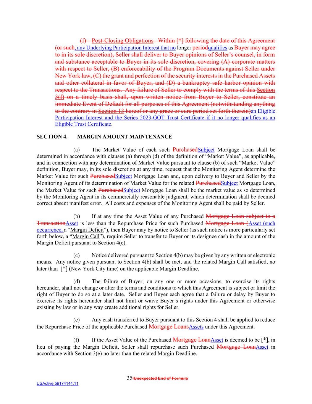 35!Unexpected End of Formula USActive 59174144.11 (f) Post-Closing Obligations. Within [*] following the date of this Agreement (or such, any Underlying Participation Interest that no longer periodqualifies as Buyer may agree to in its sole discretion), Seller shall deliver to Buyer opinions of Seller’s counsel, in form and substance acceptable to Buyer in its sole discretion, covering (A) corporate matters with respect to Seller, (B) enforceability of the Program Documents against Seller under New York law, (C) the grant and perfection of the security interests in the Purchased Assets and other collateral in favor of Buyer, and (D) a bankruptcy safe harbor opinion with respect to the Transactions. Any failure of Seller to comply with the terms of this Section 3(f) on a timely basis shall, upon written notice from Buyer to Seller, constitute an immediate Event of Default for all purposes of this Agreement (notwithstanding anything to the contrary in Section 13 hereof or any grace or cure period set forth therein)an Eligible Participation Interest and the Series 2023-GOT Trust Certificate if it no longer qualifies as an Eligible Trust Certificate. SECTION 4. MARGIN AMOUNT MAINTENANCE (a) The Market Value of each such PurchasedSubject Mortgage Loan shall be determined in accordance with clauses (a) through (d) of the definition of “Market Value”, as applicable, and in connection with any determination of Market Value pursuant to clause (b) of such “Market Value” definition, Buyer may, in its sole discretion at any time, request that the Monitoring Agent determine the Market Value for such PurchasedSubject Mortgage Loan and, upon delivery to Buyer and Seller by the Monitoring Agent of its determination of Market Value for the related PurchasedSubject Mortgage Loan, the Market Value for such PurchasedSubject Mortgage Loan shall be the market value as so determined by the Monitoring Agent in its commercially reasonable judgment, which determination shall be deemed correct absent manifest error. All costs and expenses of the Monitoring Agent shall be paid by Seller. (b) If at any time the Asset Value of any Purchased Mortgage Loan subject to a TransactionAsset is less than the Repurchase Price for such Purchased Mortgage Loan (Asset (such occurrence, a “Margin Deficit”), then Buyer may by notice to Seller (as such notice is more particularly set forth below, a “Margin Call”), require Seller to transfer to Buyer or its designee cash in the amount of the Margin Deficit pursuant to Section 4(c). (c) Notice delivered pursuant to Section 4(b) may be given by any written or electronic means. Any notice given pursuant to Section 4(b) shall be met, and the related Margin Call satisfied, no later than [*] (New York City time) on the applicable Margin Deadline. (d) The failure of Buyer, on any one or more occasions, to exercise its rights hereunder, shall not change or alter the terms and conditions to which this Agreement is subject or limit the right of Buyer to do so at a later date. Seller and Buyer each agree that a failure or delay by Buyer to exercise its rights hereunder shall not limit or waive Buyer’s rights under this Agreement or otherwise existing by law or in any way create additional rights for Seller. (e) Any cash transferred to Buyer pursuant to this Section 4 shall be applied to reduce the Repurchase Price of the applicable Purchased Mortgage LoansAssets under this Agreement. (f) If the Asset Value of the Purchased Mortgage LoanAsset is deemed to be [*], in lieu of paying the Margin Deficit, Seller shall repurchase such Purchased Mortgage LoanAsset in accordance with Section 3(e) no later than the related Margin Deadline.