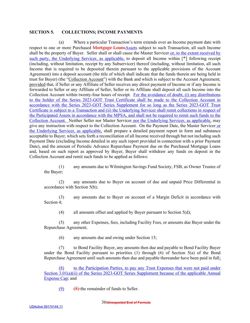36!Unexpected End of Formula USActive 59174144.11 SECTION 5. COLLECTIONS; INCOME PAYMENTS (a) Where a particular Transaction’s term extends over an Income payment date with respect to one or more Purchased Mortgage LoansAssets subject to such Transaction, all such Income shall be the property of Buyer. Seller shall or shall cause the Master Servicer or, to the extent received by such party, the Underlying Servicer, as applicable, to deposit all Income within [*] following receipt (including, without limitation, receipt by any Subservicer) thereof (including, without limitation, all such Income that is required to be deposited therein pursuant to the applicable provisions of the Account Agreement) into a deposit account (the title of which shall indicate that the funds therein are being held in trust for Buyer) (the “Collection Account”) with the Bank and which is subject to the Account Agreement; provided that, if Seller or any Affiliate of Seller receives any direct payment of Income or if any Income is forwarded to Seller or any Affiliate of Seller, Seller or its Affiliate shall deposit all such Income into the Collection Account within twenty-four hours of receipt. For the avoidance of doubt, (i) any distributions to the holder of the Series 2023-GOT Trust Certificate shall be made to the Collection Account in accordance with the Series 2023-GOT Series Supplement for so long as the Series 2023-GOT Trust Certificate is subject to a Transaction and (ii) the Underlying Servicer shall remit collections in respect of the Participated Assets in accordance with the MPSA, and shall not be required to remit such funds to the Collection Account. Neither Seller nor Master Servicer nor the Underlying Servicer, as applicable, may give any instruction with respect to the Collection Account. On the Payment Date, the Master Servicer or the Underlying Servicer, as applicable, shall prepare a detailed payment report in form and substance acceptable to Buyer, which sets forth a reconciliation of all Income received through but not including such Payment Date (excluding Income detailed in any such report provided in connection with a prior Payment Date), and the amount of Periodic Advance Repurchase Payment due on the Purchased Mortgage Loans and, based on such report as approved by Buyer, Buyer shall withdraw any funds on deposit in the Collection Account and remit such funds to be applied as follows: (1) any amounts due to Wilmington Savings Fund Society, FSB, as Owner Trustee of the Buyer; (2) any amounts due to Buyer on account of due and unpaid Price Differential in accordance with Section 5(b); (3) any amounts due to Buyer on account of a Margin Deficit in accordance with Section 4; (4) all amounts offset and applied by Buyer pursuant to Section 5(d); (5) any other Expenses, fees, including Facility Fees, or amounts due Buyer under the Repurchase Agreement; (6) any amounts due and owing under Section 15; (7) to Bond Facility Buyer, any amounts then due and payable to Bond Facility Buyer under the Bond Facility pursuant to priorities (1) through (6) of Section 5(a) of the Bond Repurchase Agreement until such amounts then due and payable thereunder have been paid in full; (8) to the Participation Parties, to pay any Trust Expenses that were not paid under Section 3.01(a)(ii) of the Series 2023-GOT Series Supplement because of the applicable Annual Expense Cap; and (9) (8) the remainder of funds to Seller.