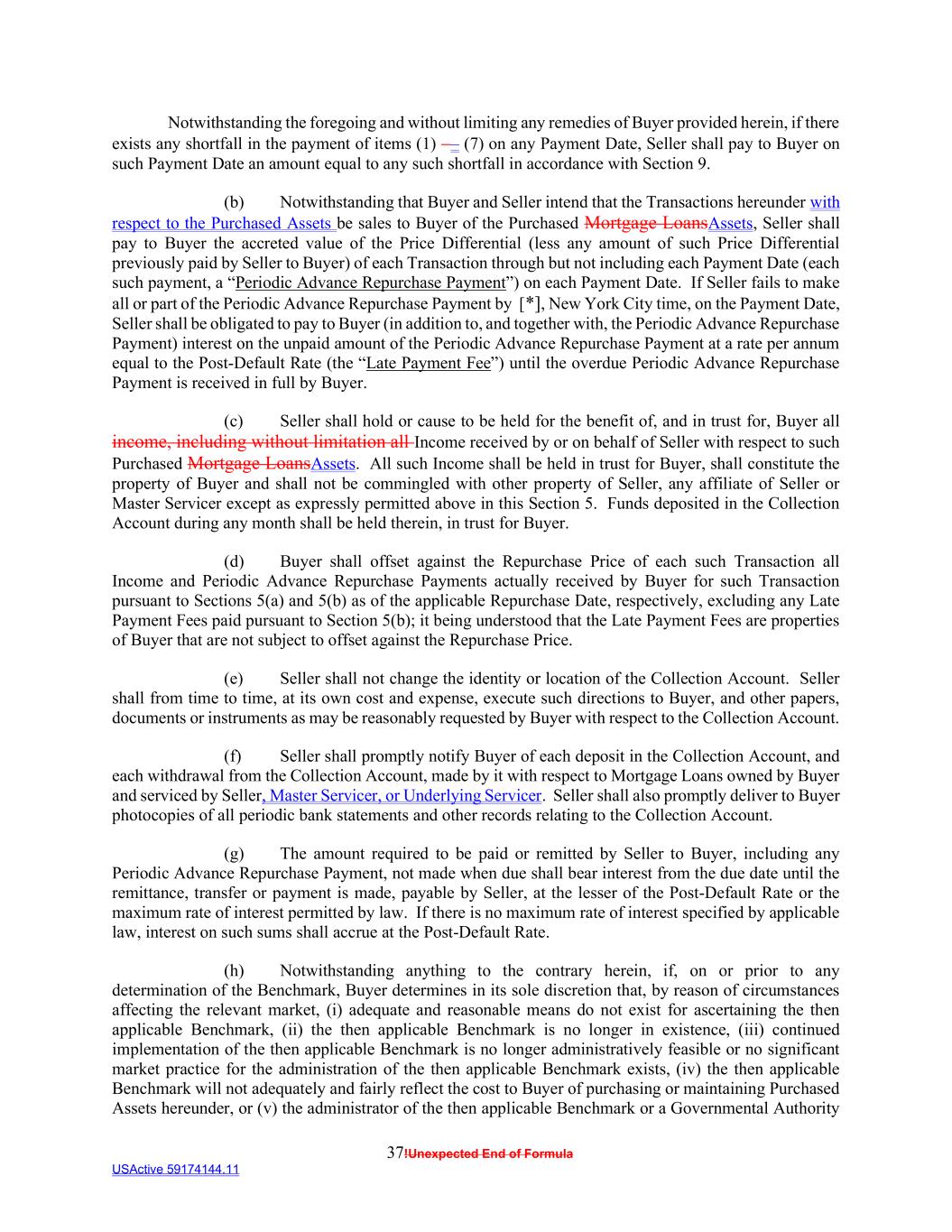 37!Unexpected End of Formula USActive 59174144.11 Notwithstanding the foregoing and without limiting any remedies of Buyer provided herein, if there exists any shortfall in the payment of items (1) –– (7) on any Payment Date, Seller shall pay to Buyer on such Payment Date an amount equal to any such shortfall in accordance with Section 9. (b) Notwithstanding that Buyer and Seller intend that the Transactions hereunder with respect to the Purchased Assets be sales to Buyer of the Purchased Mortgage LoansAssets, Seller shall pay to Buyer the accreted value of the Price Differential (less any amount of such Price Differential previously paid by Seller to Buyer) of each Transaction through but not including each Payment Date (each such payment, a “Periodic Advance Repurchase Payment”) on each Payment Date. If Seller fails to make all or part of the Periodic Advance Repurchase Payment by [*], New York City time, on the Payment Date, Seller shall be obligated to pay to Buyer (in addition to, and together with, the Periodic Advance Repurchase Payment) interest on the unpaid amount of the Periodic Advance Repurchase Payment at a rate per annum equal to the Post-Default Rate (the “Late Payment Fee”) until the overdue Periodic Advance Repurchase Payment is received in full by Buyer. (c) Seller shall hold or cause to be held for the benefit of, and in trust for, Buyer all income, including without limitation all Income received by or on behalf of Seller with respect to such Purchased Mortgage LoansAssets. All such Income shall be held in trust for Buyer, shall constitute the property of Buyer and shall not be commingled with other property of Seller, any affiliate of Seller or Master Servicer except as expressly permitted above in this Section 5. Funds deposited in the Collection Account during any month shall be held therein, in trust for Buyer. (d) Buyer shall offset against the Repurchase Price of each such Transaction all Income and Periodic Advance Repurchase Payments actually received by Buyer for such Transaction pursuant to Sections 5(a) and 5(b) as of the applicable Repurchase Date, respectively, excluding any Late Payment Fees paid pursuant to Section 5(b); it being understood that the Late Payment Fees are properties of Buyer that are not subject to offset against the Repurchase Price. (e) Seller shall not change the identity or location of the Collection Account. Seller shall from time to time, at its own cost and expense, execute such directions to Buyer, and other papers, documents or instruments as may be reasonably requested by Buyer with respect to the Collection Account. (f) Seller shall promptly notify Buyer of each deposit in the Collection Account, and each withdrawal from the Collection Account, made by it with respect to Mortgage Loans owned by Buyer and serviced by Seller, Master Servicer, or Underlying Servicer. Seller shall also promptly deliver to Buyer photocopies of all periodic bank statements and other records relating to the Collection Account. (g) The amount required to be paid or remitted by Seller to Buyer, including any Periodic Advance Repurchase Payment, not made when due shall bear interest from the due date until the remittance, transfer or payment is made, payable by Seller, at the lesser of the Post-Default Rate or the maximum rate of interest permitted by law. If there is no maximum rate of interest specified by applicable law, interest on such sums shall accrue at the Post-Default Rate. (h) Notwithstanding anything to the contrary herein, if, on or prior to any determination of the Benchmark, Buyer determines in its sole discretion that, by reason of circumstances affecting the relevant market, (i) adequate and reasonable means do not exist for ascertaining the then applicable Benchmark, (ii) the then applicable Benchmark is no longer in existence, (iii) continued implementation of the then applicable Benchmark is no longer administratively feasible or no significant market practice for the administration of the then applicable Benchmark exists, (iv) the then applicable Benchmark will not adequately and fairly reflect the cost to Buyer of purchasing or maintaining Purchased Assets hereunder, or (v) the administrator of the then applicable Benchmark or a Governmental Authority