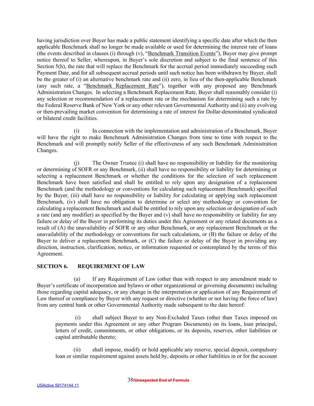 38!Unexpected End of Formula USActive 59174144.11 having jurisdiction over Buyer has made a public statement identifying a specific date after which the then applicable Benchmark shall no longer be made available or used for determining the interest rate of loans (the events described in clauses (i) through (v), “Benchmark Transition Events”), Buyer may give prompt notice thereof to Seller, whereupon, in Buyer’s sole discretion and subject to the final sentence of this Section 5(h), the rate that will replace the Benchmark for the accrual period immediately succeeding such Payment Date, and for all subsequent accrual periods until such notice has been withdrawn by Buyer, shall be the greater of (i) an alternative benchmark rate and (ii) zero, in lieu of the then-applicable Benchmark (any such rate, a “Benchmark Replacement Rate”), together with any proposed any Benchmark Administration Changes. In selecting a Benchmark Replacement Rate, Buyer shall reasonably consider (i) any selection or recommendation of a replacement rate or the mechanism for determining such a rate by the Federal Reserve Bank of New York or any other relevant Governmental Authority and (ii) any evolving or then-prevailing market convention for determining a rate of interest for Dollar-denominated syndicated or bilateral credit facilities. (i) In connection with the implementation and administration of a Benchmark, Buyer will have the right to make Benchmark Administration Changes from time to time with respect to the Benchmark and will promptly notify Seller of the effectiveness of any such Benchmark Administration Changes. (j) The Owner Trustee (i) shall have no responsibility or liability for the monitoring or determining of SOFR or any Benchmark, (ii) shall have no responsibility or liability for determining or selecting a replacement Benchmark or whether the conditions for the selection of such replacement Benchmark have been satisfied and shall be entitled to rely upon any designation of a replacement Benchmark (and the methodology or conventions for calculating such replacement Benchmark) specified by the Buyer, (iii) shall have no responsibility or liability for calculating or applying such replacement Benchmark, (iv) shall have no obligation to determine or select any methodology or convention for calculating a replacement Benchmark and shall be entitled to rely upon any selection or designation of such a rate (and any modifier) as specified by the Buyer and (v) shall have no responsibility or liability for any failure or delay of the Buyer in performing its duties under this Agreement or any related documents as a result of (A) the unavailability of SOFR or any other Benchmark, or any replacement Benchmark or the unavailability of the methodology or conventions for such calculations, or (B) the failure or delay of the Buyer to deliver a replacement Benchmark, or (C) the failure or delay of the Buyer in providing any direction, instruction, clarification, notice, or information requested or contemplated by the terms of this Agreement. SECTION 6. REQUIREMENT OF LAW (a) If any Requirement of Law (other than with respect to any amendment made to Buyer’s certificate of incorporation and bylaws or other organizational or governing documents) including those regarding capital adequacy, or any change in the interpretation or application of any Requirement of Law thereof or compliance by Buyer with any request or directive (whether or not having the force of law) from any central bank or other Governmental Authority made subsequent to the date hereof: (i) shall subject Buyer to any Non-Excluded Taxes (other than Taxes imposed on payments under this Agreement or any other Program Documents) on its loans, loan principal, letters of credit, commitments, or other obligations, or its deposits, reserves, other liabilities or capital attributable thereto; (ii) shall impose, modify or hold applicable any reserve, special deposit, compulsory loan or similar requirement against assets held by, deposits or other liabilities in or for the account