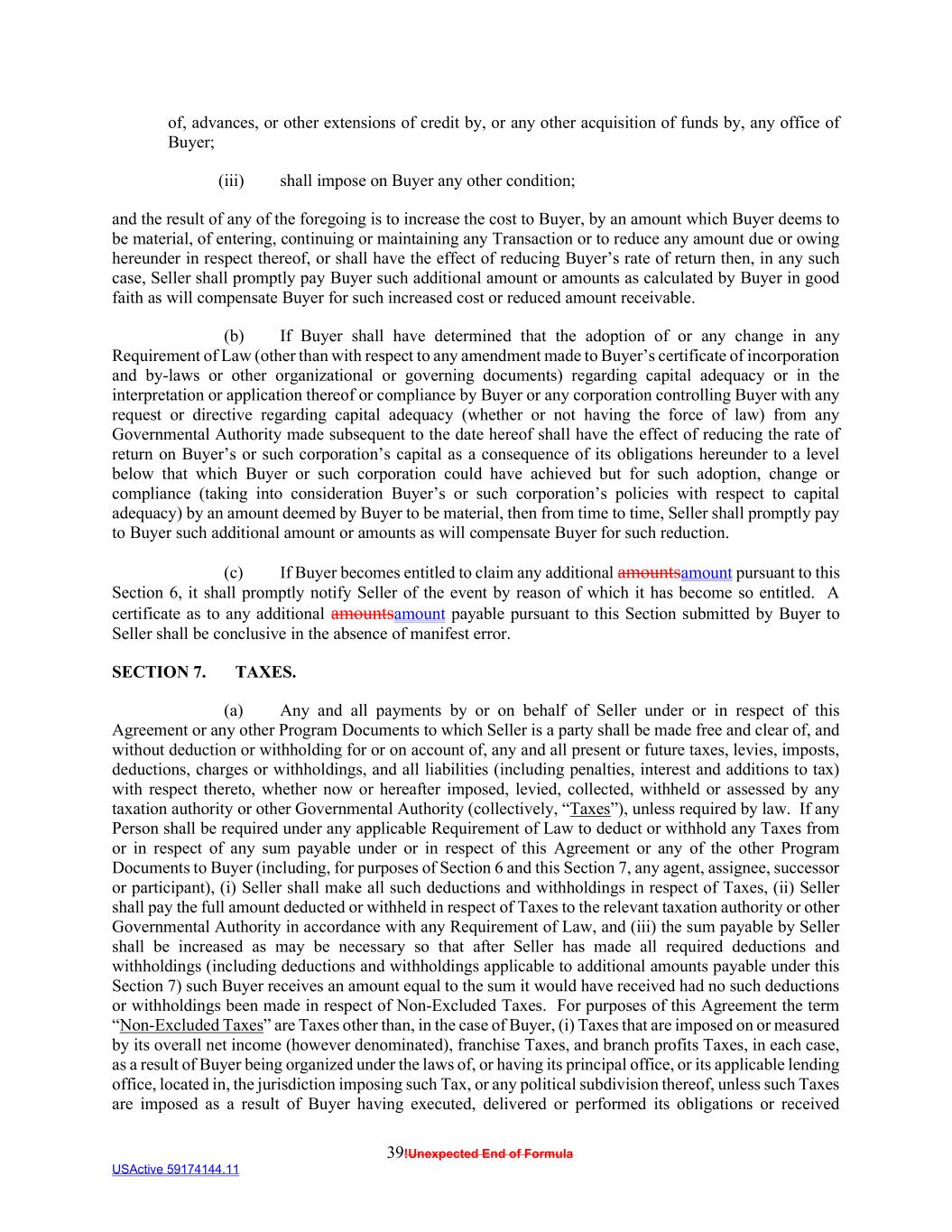 39!Unexpected End of Formula USActive 59174144.11 of, advances, or other extensions of credit by, or any other acquisition of funds by, any office of Buyer; (iii) shall impose on Buyer any other condition; and the result of any of the foregoing is to increase the cost to Buyer, by an amount which Buyer deems to be material, of entering, continuing or maintaining any Transaction or to reduce any amount due or owing hereunder in respect thereof, or shall have the effect of reducing Buyer’s rate of return then, in any such case, Seller shall promptly pay Buyer such additional amount or amounts as calculated by Buyer in good faith as will compensate Buyer for such increased cost or reduced amount receivable. (b) If Buyer shall have determined that the adoption of or any change in any Requirement of Law (other than with respect to any amendment made to Buyer’s certificate of incorporation and by-laws or other organizational or governing documents) regarding capital adequacy or in the interpretation or application thereof or compliance by Buyer or any corporation controlling Buyer with any request or directive regarding capital adequacy (whether or not having the force of law) from any Governmental Authority made subsequent to the date hereof shall have the effect of reducing the rate of return on Buyer’s or such corporation’s capital as a consequence of its obligations hereunder to a level below that which Buyer or such corporation could have achieved but for such adoption, change or compliance (taking into consideration Buyer’s or such corporation’s policies with respect to capital adequacy) by an amount deemed by Buyer to be material, then from time to time, Seller shall promptly pay to Buyer such additional amount or amounts as will compensate Buyer for such reduction. (c) If Buyer becomes entitled to claim any additional amountsamount pursuant to this Section 6, it shall promptly notify Seller of the event by reason of which it has become so entitled. A certificate as to any additional amountsamount payable pursuant to this Section submitted by Buyer to Seller shall be conclusive in the absence of manifest error. SECTION 7. TAXES. (a) Any and all payments by or on behalf of Seller under or in respect of this Agreement or any other Program Documents to which Seller is a party shall be made free and clear of, and without deduction or withholding for or on account of, any and all present or future taxes, levies, imposts, deductions, charges or withholdings, and all liabilities (including penalties, interest and additions to tax) with respect thereto, whether now or hereafter imposed, levied, collected, withheld or assessed by any taxation authority or other Governmental Authority (collectively, “Taxes”), unless required by law. If any Person shall be required under any applicable Requirement of Law to deduct or withhold any Taxes from or in respect of any sum payable under or in respect of this Agreement or any of the other Program Documents to Buyer (including, for purposes of Section 6 and this Section 7, any agent, assignee, successor or participant), (i) Seller shall make all such deductions and withholdings in respect of Taxes, (ii) Seller shall pay the full amount deducted or withheld in respect of Taxes to the relevant taxation authority or other Governmental Authority in accordance with any Requirement of Law, and (iii) the sum payable by Seller shall be increased as may be necessary so that after Seller has made all required deductions and withholdings (including deductions and withholdings applicable to additional amounts payable under this Section 7) such Buyer receives an amount equal to the sum it would have received had no such deductions or withholdings been made in respect of Non-Excluded Taxes. For purposes of this Agreement the term “Non-Excluded Taxes” are Taxes other than, in the case of Buyer, (i) Taxes that are imposed on or measured by its overall net income (however denominated), franchise Taxes, and branch profits Taxes, in each case, as a result of Buyer being organized under the laws of, or having its principal office, or its applicable lending office, located in, the jurisdiction imposing such Tax, or any political subdivision thereof, unless such Taxes are imposed as a result of Buyer having executed, delivered or performed its obligations or received