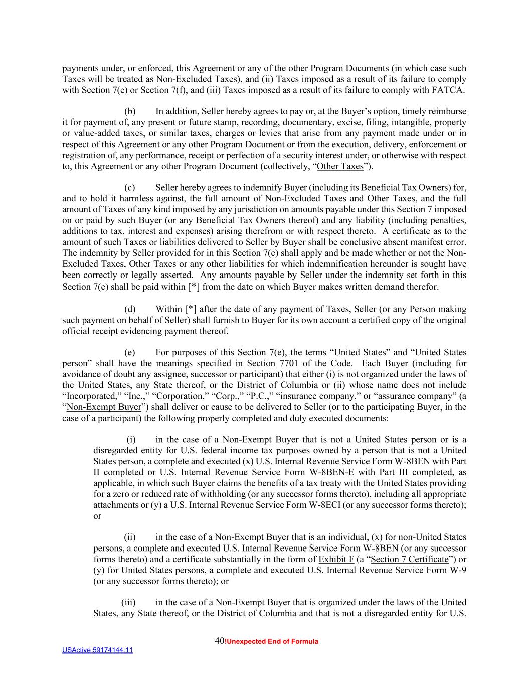 40!Unexpected End of Formula USActive 59174144.11 payments under, or enforced, this Agreement or any of the other Program Documents (in which case such Taxes will be treated as Non-Excluded Taxes), and (ii) Taxes imposed as a result of its failure to comply with Section 7(e) or Section 7(f), and (iii) Taxes imposed as a result of its failure to comply with FATCA. (b) In addition, Seller hereby agrees to pay or, at the Buyer’s option, timely reimburse it for payment of, any present or future stamp, recording, documentary, excise, filing, intangible, property or value-added taxes, or similar taxes, charges or levies that arise from any payment made under or in respect of this Agreement or any other Program Document or from the execution, delivery, enforcement or registration of, any performance, receipt or perfection of a security interest under, or otherwise with respect to, this Agreement or any other Program Document (collectively, “Other Taxes”). (c) Seller hereby agrees to indemnify Buyer (including its Beneficial Tax Owners) for, and to hold it harmless against, the full amount of Non-Excluded Taxes and Other Taxes, and the full amount of Taxes of any kind imposed by any jurisdiction on amounts payable under this Section 7 imposed on or paid by such Buyer (or any Beneficial Tax Owners thereof) and any liability (including penalties, additions to tax, interest and expenses) arising therefrom or with respect thereto. A certificate as to the amount of such Taxes or liabilities delivered to Seller by Buyer shall be conclusive absent manifest error. The indemnity by Seller provided for in this Section 7(c) shall apply and be made whether or not the Non- Excluded Taxes, Other Taxes or any other liabilities for which indemnification hereunder is sought have been correctly or legally asserted. Any amounts payable by Seller under the indemnity set forth in this Section 7(c) shall be paid within [*] from the date on which Buyer makes written demand therefor. (d) Within [*] after the date of any payment of Taxes, Seller (or any Person making such payment on behalf of Seller) shall furnish to Buyer for its own account a certified copy of the original official receipt evidencing payment thereof. (e) For purposes of this Section 7(e), the terms “United States” and “United States person” shall have the meanings specified in Section 7701 of the Code. Each Buyer (including for avoidance of doubt any assignee, successor or participant) that either (i) is not organized under the laws of the United States, any State thereof, or the District of Columbia or (ii) whose name does not include “Incorporated,” “Inc.,” “Corporation,” “Corp.,” “P.C.,” “insurance company,” or “assurance company” (a “Non-Exempt Buyer”) shall deliver or cause to be delivered to Seller (or to the participating Buyer, in the case of a participant) the following properly completed and duly executed documents: (i) in the case of a Non-Exempt Buyer that is not a United States person or is a disregarded entity for U.S. federal income tax purposes owned by a person that is not a United States person, a complete and executed (x) U.S. Internal Revenue Service Form W-8BEN with Part II completed or U.S. Internal Revenue Service Form W-8BEN-E with Part III completed, as applicable, in which such Buyer claims the benefits of a tax treaty with the United States providing for a zero or reduced rate of withholding (or any successor forms thereto), including all appropriate attachments or (y) a U.S. Internal Revenue Service Form W-8ECI (or any successor forms thereto); or (ii) in the case of a Non-Exempt Buyer that is an individual, (x) for non-United States persons, a complete and executed U.S. Internal Revenue Service Form W-8BEN (or any successor forms thereto) and a certificate substantially in the form of Exhibit F (a “Section 7 Certificate”) or (y) for United States persons, a complete and executed U.S. Internal Revenue Service Form W-9 (or any successor forms thereto); or (iii) in the case of a Non-Exempt Buyer that is organized under the laws of the United States, any State thereof, or the District of Columbia and that is not a disregarded entity for U.S.