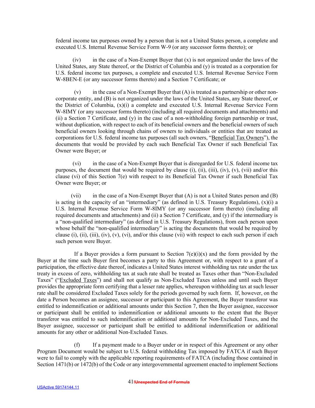 41!Unexpected End of Formula USActive 59174144.11 federal income tax purposes owned by a person that is not a United States person, a complete and executed U.S. Internal Revenue Service Form W-9 (or any successor forms thereto); or (iv) in the case of a Non-Exempt Buyer that (x) is not organized under the laws of the United States, any State thereof, or the District of Columbia and (y) is treated as a corporation for U.S. federal income tax purposes, a complete and executed U.S. Internal Revenue Service Form W-8BEN-E (or any successor forms thereto) and a Section 7 Certificate; or (v) in the case of a Non-Exempt Buyer that (A) is treated as a partnership or other non- corporate entity, and (B) is not organized under the laws of the United States, any State thereof, or the District of Columbia, (x)(i) a complete and executed U.S. Internal Revenue Service Form W-8IMY (or any successor forms thereto) (including all required documents and attachments) and (ii) a Section 7 Certificate, and (y) in the case of a non-withholding foreign partnership or trust, without duplication, with respect to each of its beneficial owners and the beneficial owners of such beneficial owners looking through chains of owners to individuals or entities that are treated as corporations for U.S. federal income tax purposes (all such owners, “Beneficial Tax Owners”), the documents that would be provided by each such Beneficial Tax Owner if such Beneficial Tax Owner were Buyer; or (vi) in the case of a Non-Exempt Buyer that is disregarded for U.S. federal income tax purposes, the document that would be required by clause (i), (ii), (iii), (iv), (v), (vii) and/or this clause (vi) of this Section 7(e) with respect to its Beneficial Tax Owner if such Beneficial Tax Owner were Buyer; or (vii) in the case of a Non-Exempt Buyer that (A) is not a United States person and (B) is acting in the capacity of an “intermediary” (as defined in U.S. Treasury Regulations), (x)(i) a U.S. Internal Revenue Service Form W-8IMY (or any successor form thereto) (including all required documents and attachments) and (ii) a Section 7 Certificate, and (y) if the intermediary is a “non-qualified intermediary” (as defined in U.S. Treasury Regulations), from each person upon whose behalf the “non-qualified intermediary” is acting the documents that would be required by clause (i), (ii), (iii), (iv), (v), (vi), and/or this clause (vii) with respect to each such person if each such person were Buyer. If a Buyer provides a form pursuant to Section 7(e)(i)(x) and the form provided by the Buyer at the time such Buyer first becomes a party to this Agreement or, with respect to a grant of a participation, the effective date thereof, indicates a United States interest withholding tax rate under the tax treaty in excess of zero, withholding tax at such rate shall be treated as Taxes other than “Non-Excluded Taxes” (“Excluded Taxes”) and shall not qualify as Non-Excluded Taxes unless and until such Buyer provides the appropriate form certifying that a lesser rate applies, whereupon withholding tax at such lesser rate shall be considered Excluded Taxes solely for the periods governed by such form. If, however, on the date a Person becomes an assignee, successor or participant to this Agreement, the Buyer transferor was entitled to indemnification or additional amounts under this Section 7, then the Buyer assignee, successor or participant shall be entitled to indemnification or additional amounts to the extent that the Buyer transferor was entitled to such indemnification or additional amounts for Non-Excluded Taxes, and the Buyer assignee, successor or participant shall be entitled to additional indemnification or additional amounts for any other or additional Non-Excluded Taxes. (f) If a payment made to a Buyer under or in respect of this Agreement or any other Program Document would be subject to U.S. federal withholding Tax imposed by FATCA if such Buyer were to fail to comply with the applicable reporting requirements of FATCA (including those contained in Section 1471(b) or 1472(b) of the Code or any intergovernmental agreement enacted to implement Sections