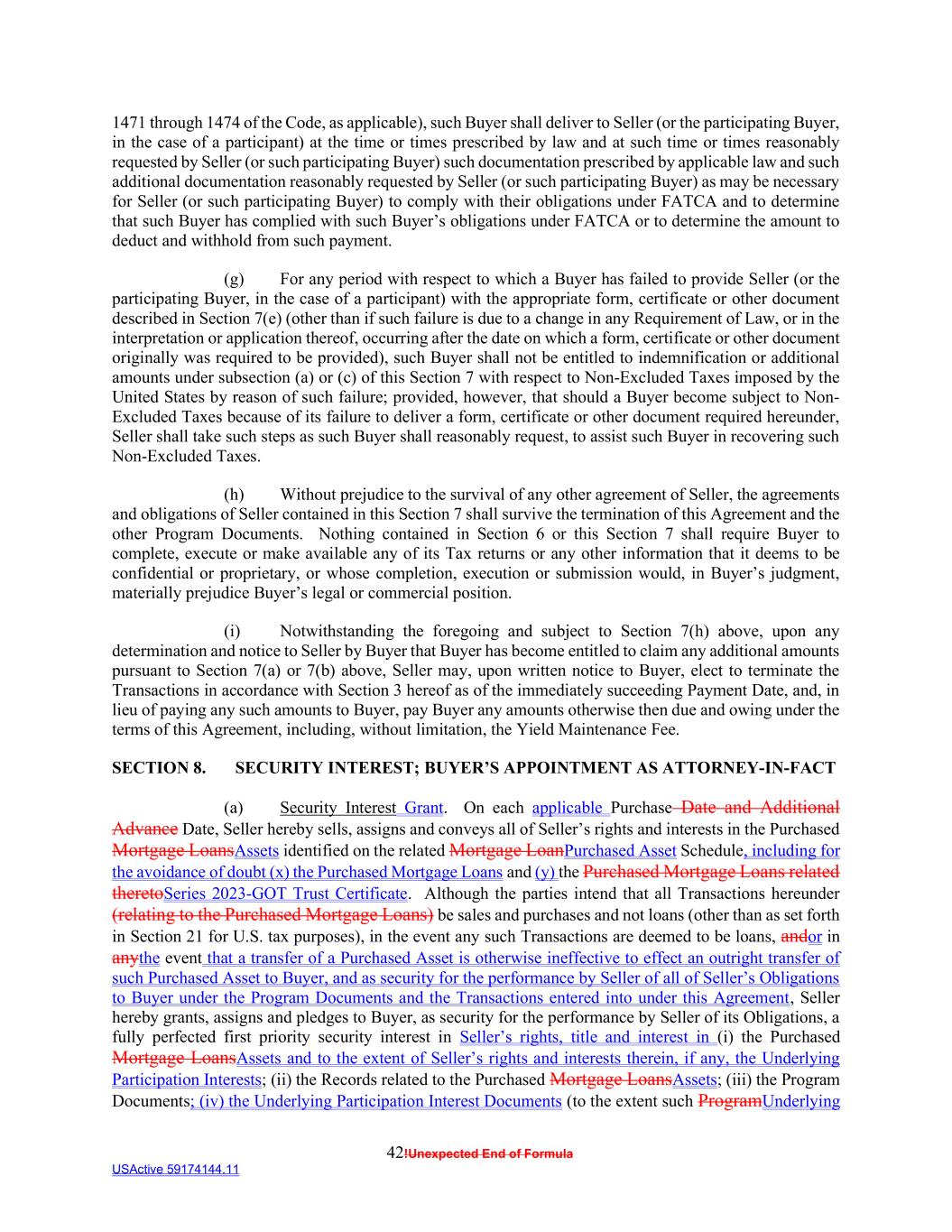 42!Unexpected End of Formula USActive 59174144.11 1471 through 1474 of the Code, as applicable), such Buyer shall deliver to Seller (or the participating Buyer, in the case of a participant) at the time or times prescribed by law and at such time or times reasonably requested by Seller (or such participating Buyer) such documentation prescribed by applicable law and such additional documentation reasonably requested by Seller (or such participating Buyer) as may be necessary for Seller (or such participating Buyer) to comply with their obligations under FATCA and to determine that such Buyer has complied with such Buyer’s obligations under FATCA or to determine the amount to deduct and withhold from such payment. (g) For any period with respect to which a Buyer has failed to provide Seller (or the participating Buyer, in the case of a participant) with the appropriate form, certificate or other document described in Section 7(e) (other than if such failure is due to a change in any Requirement of Law, or in the interpretation or application thereof, occurring after the date on which a form, certificate or other document originally was required to be provided), such Buyer shall not be entitled to indemnification or additional amounts under subsection (a) or (c) of this Section 7 with respect to Non-Excluded Taxes imposed by the United States by reason of such failure; provided, however, that should a Buyer become subject to Non- Excluded Taxes because of its failure to deliver a form, certificate or other document required hereunder, Seller shall take such steps as such Buyer shall reasonably request, to assist such Buyer in recovering such Non-Excluded Taxes. (h) Without prejudice to the survival of any other agreement of Seller, the agreements and obligations of Seller contained in this Section 7 shall survive the termination of this Agreement and the other Program Documents. Nothing contained in Section 6 or this Section 7 shall require Buyer to complete, execute or make available any of its Tax returns or any other information that it deems to be confidential or proprietary, or whose completion, execution or submission would, in Buyer’s judgment, materially prejudice Buyer’s legal or commercial position. (i) Notwithstanding the foregoing and subject to Section 7(h) above, upon any determination and notice to Seller by Buyer that Buyer has become entitled to claim any additional amounts pursuant to Section 7(a) or 7(b) above, Seller may, upon written notice to Buyer, elect to terminate the Transactions in accordance with Section 3 hereof as of the immediately succeeding Payment Date, and, in lieu of paying any such amounts to Buyer, pay Buyer any amounts otherwise then due and owing under the terms of this Agreement, including, without limitation, the Yield Maintenance Fee. SECTION 8. SECURITY INTEREST; BUYER’S APPOINTMENT AS ATTORNEY-IN-FACT (a) Security Interest Grant. On each applicable Purchase Date and Additional Advance Date, Seller hereby sells, assigns and conveys all of Seller’s rights and interests in the Purchased Mortgage LoansAssets identified on the related Mortgage LoanPurchased Asset Schedule, including for the avoidance of doubt (x) the Purchased Mortgage Loans and (y) the Purchased Mortgage Loans related theretoSeries 2023-GOT Trust Certificate. Although the parties intend that all Transactions hereunder (relating to the Purchased Mortgage Loans) be sales and purchases and not loans (other than as set forth in Section 21 for U.S. tax purposes), in the event any such Transactions are deemed to be loans, andor in anythe event that a transfer of a Purchased Asset is otherwise ineffective to effect an outright transfer of such Purchased Asset to Buyer, and as security for the performance by Seller of all of Seller’s Obligations to Buyer under the Program Documents and the Transactions entered into under this Agreement, Seller hereby grants, assigns and pledges to Buyer, as security for the performance by Seller of its Obligations, a fully perfected first priority security interest in Seller’s rights, title and interest in (i) the Purchased Mortgage LoansAssets and to the extent of Seller’s rights and interests therein, if any, the Underlying Participation Interests; (ii) the Records related to the Purchased Mortgage LoansAssets; (iii) the Program Documents; (iv) the Underlying Participation Interest Documents (to the extent such ProgramUnderlying