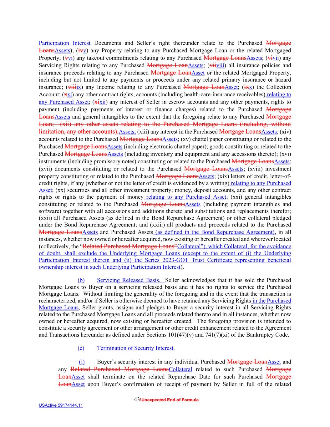43!Unexpected End of Formula USActive 59174144.11 Participation Interest Documents and Seller’s right thereunder relate to the Purchased Mortgage LoansAssets); (ivv) any Property relating to any Purchased Mortgage Loan or the related Mortgaged Property; (vvi) any takeout commitments relating to any Purchased Mortgage LoansAssets; (vivii) any Servicing Rights relating to any Purchased Mortgage LoanAssets; (viiviii) all insurance policies and insurance proceeds relating to any Purchased Mortgage LoanAsset or the related Mortgaged Property, including but not limited to any payments or proceeds under any related primary insurance or hazard insurance; (viiiix) any Income relating to any Purchased Mortgage LoanAsset; (ixx) the Collection Account; (xxi) any other contract rights, accounts (including health-care-insurance receivables) relating to any Purchased Asset; (xixii) any interest of Seller in escrow accounts and any other payments, rights to payment (including payments of interest or finance charges) related to the Purchased Mortgage LoansAssets and general intangibles to the extent that the foregoing relate to any Purchased Mortgage Loan; (xii) any other assets relating to the Purchased Mortgage Loans (including, without limitation, any other accounts),Assets; (xiii) any interest in the Purchased Mortgage LoansAssets; (xiv) accounts related to the Purchased Mortgage LoansAssets; (xv) chattel paper constituting or related to the Purchased Mortgage LoansAssets (including electronic chattel paper); goods constituting or related to the Purchased Mortgage LoansAssets (including inventory and equipment and any accessions thereto); (xvi) instruments (including promissory notes) constituting or related to the Purchased Mortgage LoansAssets; (xvii) documents constituting or related to the Purchased Mortgage LoansAssets; (xviii) investment property constituting or related to the Purchased Mortgage LoansAssets; (xix) letters of credit, letter-of- credit rights, if any (whether or not the letter of credit is evidenced by a writing) relating to any Purchased Asset; (xx) securities and all other investment property; money, deposit accounts, and any other contract rights or rights to the payment of money relating to any Purchased Asset; (xxi) general intangibles constituting or related to the Purchased Mortgage LoansAssets (including payment intangibles and software) together with all accessions and additions thereto and substitutions and replacements therefor; (xxii) all Purchased Assets (as defined in the Bond Repurchase Agreement) or other collateral pledged under the Bond Repurchase Agreement; and (xxiii) all products and proceeds related to the Purchased Mortgage LoansAssets and Purchased Assets (as defined in the Bond Repurchase Agreement), in all instances, whether now owned or hereafter acquired, now existing or hereafter created and wherever located (collectively, the “Related Purchased Mortgage Loans”Collateral”), which Collateral, for the avoidance of doubt, shall exclude the Underlying Mortgage Loans (except to the extent of (i) the Underlying Participation Interest therein and (ii) the Series 2023-GOT Trust Certificate representing beneficial ownership interest in such Underlying Participation Interest). (b) Servicing Released Basis. Seller acknowledges that it has sold the Purchased Mortgage Loans to Buyer on a servicing released basis and it has no rights to service the Purchased Mortgage Loans. Without limiting the generality of the foregoing and in the event that the transaction is recharacterized, and/or if Seller is otherwise deemed to have retained any Servicing Rights in the Purchased Mortgage Loans, Seller grants, assigns and pledges to Buyer a security interest in all Servicing Rights related to the Purchased Mortgage Loans and all proceeds related thereto and in all instances, whether now owned or hereafter acquired, now existing or hereafter created. The foregoing provision is intended to constitute a security agreement or other arrangement or other credit enhancement related to the Agreement and Transactions hereunder as defined under Sections 101(47)(v) and 741(7)(xi) of the Bankruptcy Code. (c) Termination of Security Interest. (i) Buyer’s security interest in any individual Purchased Mortgage LoanAsset and any Related Purchased Mortgage LoansCollateral related to such Purchased Mortgage LoanAsset shall terminate on the related Repurchase Date for such Purchased Mortgage LoanAsset upon Buyer’s confirmation of receipt of payment by Seller in full of the related