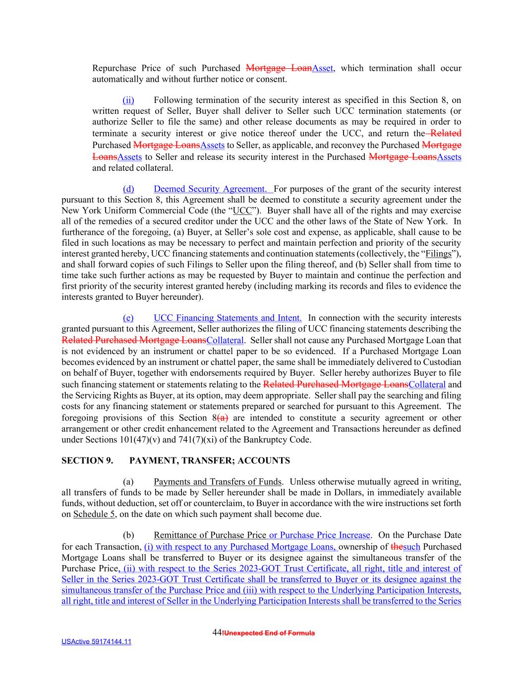 44!Unexpected End of Formula USActive 59174144.11 Repurchase Price of such Purchased Mortgage LoanAsset, which termination shall occur automatically and without further notice or consent. (ii) Following termination of the security interest as specified in this Section 8, on written request of Seller, Buyer shall deliver to Seller such UCC termination statements (or authorize Seller to file the same) and other release documents as may be required in order to terminate a security interest or give notice thereof under the UCC, and return the Related Purchased Mortgage LoansAssets to Seller, as applicable, and reconvey the Purchased Mortgage LoansAssets to Seller and release its security interest in the Purchased Mortgage LoansAssets and related collateral. (d) Deemed Security Agreement. For purposes of the grant of the security interest pursuant to this Section 8, this Agreement shall be deemed to constitute a security agreement under the New York Uniform Commercial Code (the “UCC”). Buyer shall have all of the rights and may exercise all of the remedies of a secured creditor under the UCC and the other laws of the State of New York. In furtherance of the foregoing, (a) Buyer, at Seller’s sole cost and expense, as applicable, shall cause to be filed in such locations as may be necessary to perfect and maintain perfection and priority of the security interest granted hereby, UCC financing statements and continuation statements (collectively, the “Filings”), and shall forward copies of such Filings to Seller upon the filing thereof, and (b) Seller shall from time to time take such further actions as may be requested by Buyer to maintain and continue the perfection and first priority of the security interest granted hereby (including marking its records and files to evidence the interests granted to Buyer hereunder). (e) UCC Financing Statements and Intent. In connection with the security interests granted pursuant to this Agreement, Seller authorizes the filing of UCC financing statements describing the Related Purchased Mortgage LoansCollateral. Seller shall not cause any Purchased Mortgage Loan that is not evidenced by an instrument or chattel paper to be so evidenced. If a Purchased Mortgage Loan becomes evidenced by an instrument or chattel paper, the same shall be immediately delivered to Custodian on behalf of Buyer, together with endorsements required by Buyer. Seller hereby authorizes Buyer to file such financing statement or statements relating to the Related Purchased Mortgage LoansCollateral and the Servicing Rights as Buyer, at its option, may deem appropriate. Seller shall pay the searching and filing costs for any financing statement or statements prepared or searched for pursuant to this Agreement. The foregoing provisions of this Section 8(a) are intended to constitute a security agreement or other arrangement or other credit enhancement related to the Agreement and Transactions hereunder as defined under Sections 101(47)(v) and 741(7)(xi) of the Bankruptcy Code. SECTION 9. PAYMENT, TRANSFER; ACCOUNTS (a) Payments and Transfers of Funds. Unless otherwise mutually agreed in writing, all transfers of funds to be made by Seller hereunder shall be made in Dollars, in immediately available funds, without deduction, set off or counterclaim, to Buyer in accordance with the wire instructions set forth on Schedule 5, on the date on which such payment shall become due. (b) Remittance of Purchase Price or Purchase Price Increase. On the Purchase Date for each Transaction, (i) with respect to any Purchased Mortgage Loans, ownership of thesuch Purchased Mortgage Loans shall be transferred to Buyer or its designee against the simultaneous transfer of the Purchase Price, (ii) with respect to the Series 2023-GOT Trust Certificate, all right, title and interest of Seller in the Series 2023-GOT Trust Certificate shall be transferred to Buyer or its designee against the simultaneous transfer of the Purchase Price and (iii) with respect to the Underlying Participation Interests, all right, title and interest of Seller in the Underlying Participation Interests shall be transferred to the Series