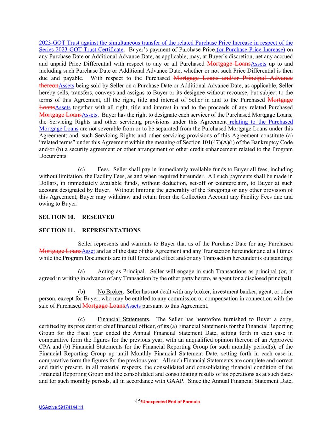 45!Unexpected End of Formula USActive 59174144.11 2023-GOT Trust against the simultaneous transfer of the related Purchase Price Increase in respect of the Series 2023-GOT Trust Certificate. Buyer’s payment of Purchase Price (or Purchase Price Increase) on any Purchase Date or Additional Advance Date, as applicable, may, at Buyer’s discretion, net any accrued and unpaid Price Differential with respect to any or all Purchased Mortgage LoansAssets up to and including such Purchase Date or Additional Advance Date, whether or not such Price Differential is then due and payable. With respect to the Purchased Mortgage Loans and/or Principal Advance thereonAssets being sold by Seller on a Purchase Date or Additional Advance Date, as applicable, Seller hereby sells, transfers, conveys and assigns to Buyer or its designee without recourse, but subject to the terms of this Agreement, all the right, title and interest of Seller in and to the Purchased Mortgage LoansAssets together with all right, title and interest in and to the proceeds of any related Purchased Mortgage LoansAssets. Buyer has the right to designate each servicer of the Purchased Mortgage Loans; the Servicing Rights and other servicing provisions under this Agreement relating to the Purchased Mortgage Loans are not severable from or to be separated from the Purchased Mortgage Loans under this Agreement; and, such Servicing Rights and other servicing provisions of this Agreement constitute (a) “related terms” under this Agreement within the meaning of Section 101(47)(A)(i) of the Bankruptcy Code and/or (b) a security agreement or other arrangement or other credit enhancement related to the Program Documents. (c) Fees. Seller shall pay in immediately available funds to Buyer all fees, including without limitation, the Facility Fees, as and when required hereunder. All such payments shall be made in Dollars, in immediately available funds, without deduction, set-off or counterclaim, to Buyer at such account designated by Buyer. Without limiting the generality of the foregoing or any other provision of this Agreement, Buyer may withdraw and retain from the Collection Account any Facility Fees due and owing to Buyer. SECTION 10. RESERVED SECTION 11. REPRESENTATIONS Seller represents and warrants to Buyer that as of the Purchase Date for any Purchased Mortgage LoansAsset and as of the date of this Agreement and any Transaction hereunder and at all times while the Program Documents are in full force and effect and/or any Transaction hereunder is outstanding: (a) Acting as Principal. Seller will engage in such Transactions as principal (or, if agreed in writing in advance of any Transaction by the other party hereto, as agent for a disclosed principal). (b) No Broker. Seller has not dealt with any broker, investment banker, agent, or other person, except for Buyer, who may be entitled to any commission or compensation in connection with the sale of Purchased Mortgage LoansAssets pursuant to this Agreement. (c) Financial Statements. The Seller has heretofore furnished to Buyer a copy, certified by its president or chief financial officer, of its (a) Financial Statements for the Financial Reporting Group for the fiscal year ended the Annual Financial Statement Date, setting forth in each case in comparative form the figures for the previous year, with an unqualified opinion thereon of an Approved CPA and (b) Financial Statements for the Financial Reporting Group for such monthly period(s), of the Financial Reporting Group up until Monthly Financial Statement Date, setting forth in each case in comparative form the figures for the previous year. All such Financial Statements are complete and correct and fairly present, in all material respects, the consolidated and consolidating financial condition of the Financial Reporting Group and the consolidated and consolidating results of its operations as at such dates and for such monthly periods, all in accordance with GAAP. Since the Annual Financial Statement Date,
