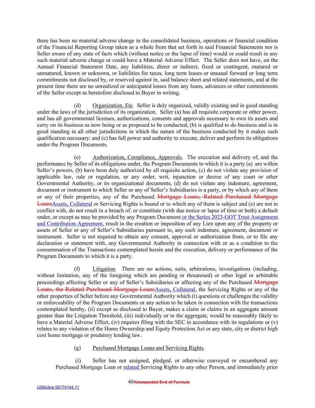 46!Unexpected End of Formula USActive 59174144.11 there has been no material adverse change in the consolidated business, operations or financial condition of the Financial Reporting Group taken as a whole from that set forth in said Financial Statements nor is Seller aware of any state of facts which (without notice or the lapse of time) would or could result in any such material adverse change or could have a Material Adverse Effect. The Seller does not have, on the Annual Financial Statement Date, any liabilities, direct or indirect, fixed or contingent, matured or unmatured, known or unknown, or liabilities for taxes, long term leases or unusual forward or long term commitments not disclosed by, or reserved against in, said balance sheet and related statements, and at the present time there are no unrealized or anticipated losses from any loans, advances or other commitments of the Seller except as heretofore disclosed to Buyer in writing. (d) Organization, Etc. Seller is duly organized, validly existing and in good standing under the laws of the jurisdiction of its organization. Seller (a) has all requisite corporate or other power, and has all governmental licenses, authorizations, consents and approvals necessary to own its assets and carry on its business as now being or as proposed to be conducted; (b) is qualified to do business and is in good standing in all other jurisdictions in which the nature of the business conducted by it makes such qualification necessary; and (c) has full power and authority to execute, deliver and perform its obligations under the Program Documents. (e) Authorization, Compliance, Approvals. The execution and delivery of, and the performance by Seller of its obligations under, the Program Documents to which it is a party (a) are within Seller’s powers, (b) have been duly authorized by all requisite action, (c) do not violate any provision of applicable law, rule or regulation, or any order, writ, injunction or decree of any court or other Governmental Authority, or its organizational documents, (d) do not violate any indenture, agreement, document or instrument to which Seller or any of Seller’s Subsidiaries is a party, or by which any of them or any of their properties, any of the Purchased Mortgage Loans, Related Purchased Mortgage LoansAssets, Collateral or Servicing Rights is bound or to which any of them is subject and (e) are not in conflict with, do not result in a breach of, or constitute (with due notice or lapse of time or both) a default under, or except as may be provided by any Program Document or the Series 2023-GOT Trust Assignment and Contribution Agreement, result in the creation or imposition of any Lien upon any of the property or assets of Seller or any of Seller’s Subsidiaries pursuant to, any such indenture, agreement, document or instrument. Seller is not required to obtain any consent, approval or authorization from, or to file any declaration or statement with, any Governmental Authority in connection with or as a condition to the consummation of the Transactions contemplated herein and the execution, delivery or performance of the Program Documents to which it is a party. (f) Litigation. There are no actions, suits, arbitrations, investigations (including, without limitation, any of the foregoing which are pending or threatened) or other legal or arbitrable proceedings affecting Seller or any of Seller’s Subsidiaries or affecting any of the Purchased Mortgage Loans, the Related Purchased Mortgage LoansAssets, Collateral, the Servicing Rights or any of the other properties of Seller before any Governmental Authority which (i) questions or challenges the validity or enforceability of the Program Documents or any action to be taken in connection with the transactions contemplated hereby, (ii) except as disclosed to Buyer, makes a claim or claims in an aggregate amount greater than the Litigation Threshold, (iii) individually or in the aggregate, would be reasonably likely to have a Material Adverse Effect, (iv) requires filing with the SEC in accordance with its regulations or (v) relates to any violation of the Home Ownership and Equity Protection Act or any state, city or district high cost home mortgage or predatory lending law. (g) Purchased Mortgage Loans and Servicing Rights. (i) Seller has not assigned, pledged, or otherwise conveyed or encumbered any Purchased Mortgage Loan or related Servicing Rights to any other Person, and immediately prior