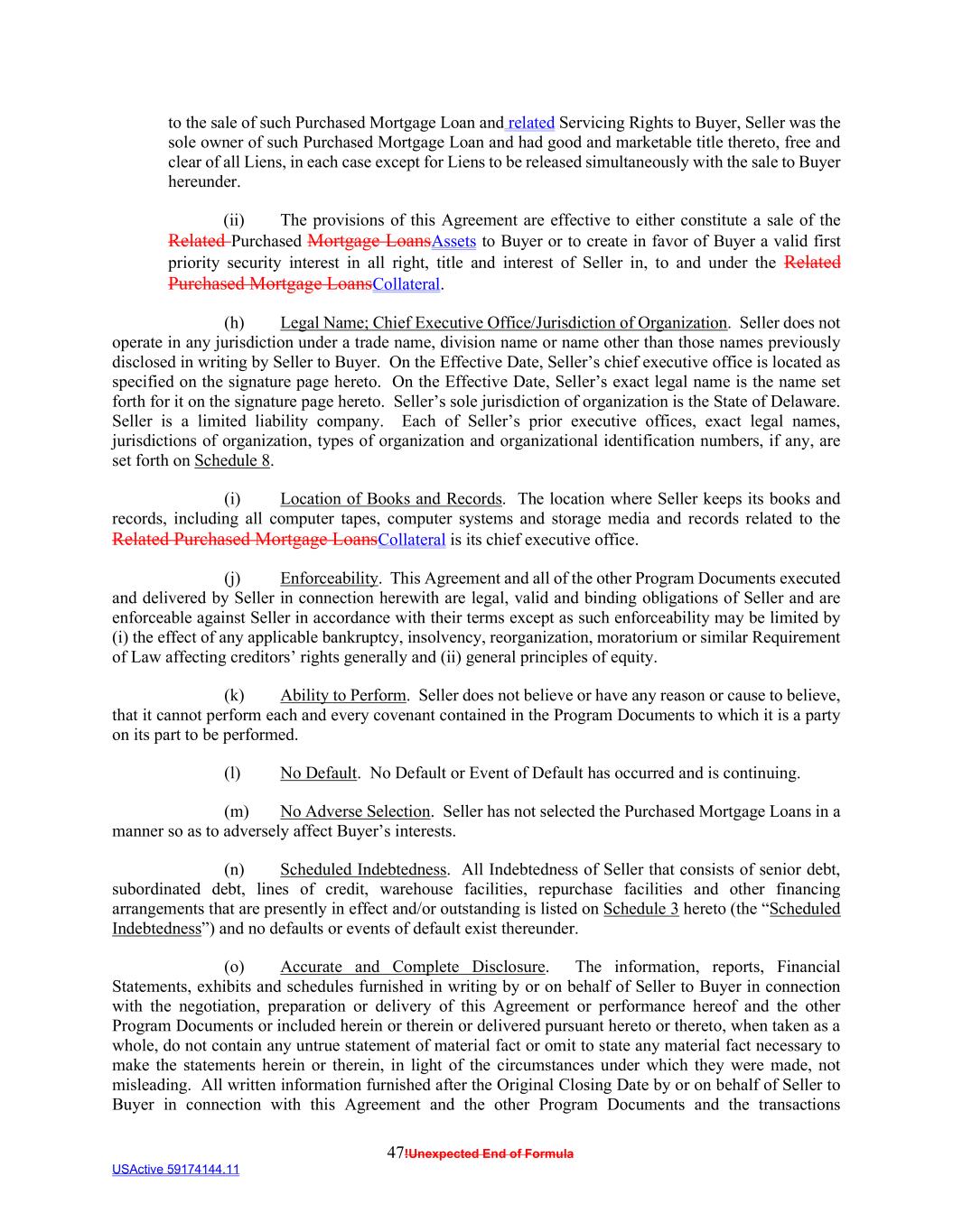 47!Unexpected End of Formula USActive 59174144.11 to the sale of such Purchased Mortgage Loan and related Servicing Rights to Buyer, Seller was the sole owner of such Purchased Mortgage Loan and had good and marketable title thereto, free and clear of all Liens, in each case except for Liens to be released simultaneously with the sale to Buyer hereunder. (ii) The provisions of this Agreement are effective to either constitute a sale of the Related Purchased Mortgage LoansAssets to Buyer or to create in favor of Buyer a valid first priority security interest in all right, title and interest of Seller in, to and under the Related Purchased Mortgage LoansCollateral. (h) Legal Name; Chief Executive Office/Jurisdiction of Organization. Seller does not operate in any jurisdiction under a trade name, division name or name other than those names previously disclosed in writing by Seller to Buyer. On the Effective Date, Seller’s chief executive office is located as specified on the signature page hereto. On the Effective Date, Seller’s exact legal name is the name set forth for it on the signature page hereto. Seller’s sole jurisdiction of organization is the State of Delaware. Seller is a limited liability company. Each of Seller’s prior executive offices, exact legal names, jurisdictions of organization, types of organization and organizational identification numbers, if any, are set forth on Schedule 8. (i) Location of Books and Records. The location where Seller keeps its books and records, including all computer tapes, computer systems and storage media and records related to the Related Purchased Mortgage LoansCollateral is its chief executive office. (j) Enforceability. This Agreement and all of the other Program Documents executed and delivered by Seller in connection herewith are legal, valid and binding obligations of Seller and are enforceable against Seller in accordance with their terms except as such enforceability may be limited by (i) the effect of any applicable bankruptcy, insolvency, reorganization, moratorium or similar Requirement of Law affecting creditors’ rights generally and (ii) general principles of equity. (k) Ability to Perform. Seller does not believe or have any reason or cause to believe, that it cannot perform each and every covenant contained in the Program Documents to which it is a party on its part to be performed. (l) No Default. No Default or Event of Default has occurred and is continuing. (m) No Adverse Selection. Seller has not selected the Purchased Mortgage Loans in a manner so as to adversely affect Buyer’s interests. (n) Scheduled Indebtedness. All Indebtedness of Seller that consists of senior debt, subordinated debt, lines of credit, warehouse facilities, repurchase facilities and other financing arrangements that are presently in effect and/or outstanding is listed on Schedule 3 hereto (the “Scheduled Indebtedness”) and no defaults or events of default exist thereunder. (o) Accurate and Complete Disclosure. The information, reports, Financial Statements, exhibits and schedules furnished in writing by or on behalf of Seller to Buyer in connection with the negotiation, preparation or delivery of this Agreement or performance hereof and the other Program Documents or included herein or therein or delivered pursuant hereto or thereto, when taken as a whole, do not contain any untrue statement of material fact or omit to state any material fact necessary to make the statements herein or therein, in light of the circumstances under which they were made, not misleading. All written information furnished after the Original Closing Date by or on behalf of Seller to Buyer in connection with this Agreement and the other Program Documents and the transactions