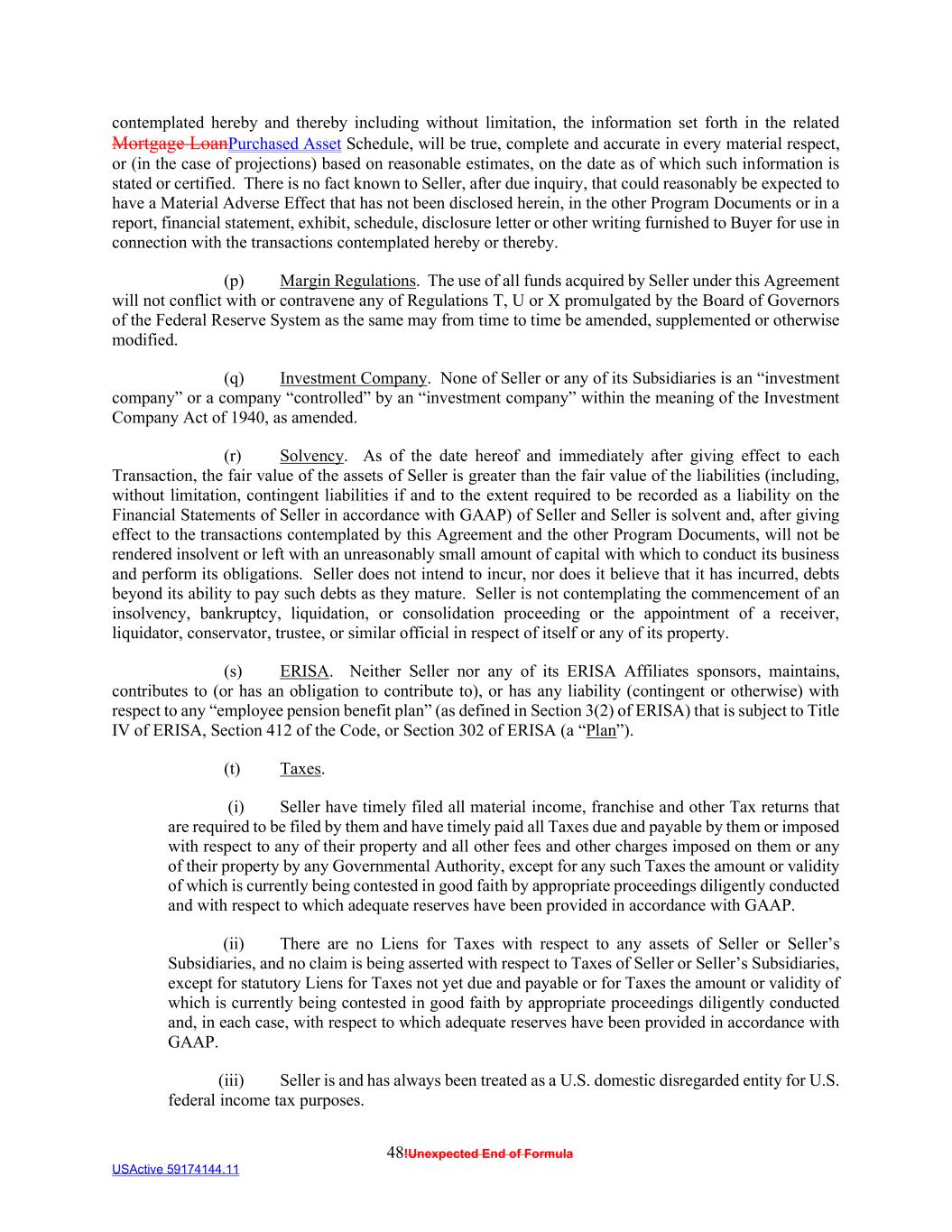 48!Unexpected End of Formula USActive 59174144.11 contemplated hereby and thereby including without limitation, the information set forth in the related Mortgage LoanPurchased Asset Schedule, will be true, complete and accurate in every material respect, or (in the case of projections) based on reasonable estimates, on the date as of which such information is stated or certified. There is no fact known to Seller, after due inquiry, that could reasonably be expected to have a Material Adverse Effect that has not been disclosed herein, in the other Program Documents or in a report, financial statement, exhibit, schedule, disclosure letter or other writing furnished to Buyer for use in connection with the transactions contemplated hereby or thereby. (p) Margin Regulations. The use of all funds acquired by Seller under this Agreement will not conflict with or contravene any of Regulations T, U or X promulgated by the Board of Governors of the Federal Reserve System as the same may from time to time be amended, supplemented or otherwise modified. (q) Investment Company. None of Seller or any of its Subsidiaries is an “investment company” or a company “controlled” by an “investment company” within the meaning of the Investment Company Act of 1940, as amended. (r) Solvency. As of the date hereof and immediately after giving effect to each Transaction, the fair value of the assets of Seller is greater than the fair value of the liabilities (including, without limitation, contingent liabilities if and to the extent required to be recorded as a liability on the Financial Statements of Seller in accordance with GAAP) of Seller and Seller is solvent and, after giving effect to the transactions contemplated by this Agreement and the other Program Documents, will not be rendered insolvent or left with an unreasonably small amount of capital with which to conduct its business and perform its obligations. Seller does not intend to incur, nor does it believe that it has incurred, debts beyond its ability to pay such debts as they mature. Seller is not contemplating the commencement of an insolvency, bankruptcy, liquidation, or consolidation proceeding or the appointment of a receiver, liquidator, conservator, trustee, or similar official in respect of itself or any of its property. (s) ERISA. Neither Seller nor any of its ERISA Affiliates sponsors, maintains, contributes to (or has an obligation to contribute to), or has any liability (contingent or otherwise) with respect to any “employee pension benefit plan” (as defined in Section 3(2) of ERISA) that is subject to Title IV of ERISA, Section 412 of the Code, or Section 302 of ERISA (a “Plan”). (t) Taxes. (i) Seller have timely filed all material income, franchise and other Tax returns that are required to be filed by them and have timely paid all Taxes due and payable by them or imposed with respect to any of their property and all other fees and other charges imposed on them or any of their property by any Governmental Authority, except for any such Taxes the amount or validity of which is currently being contested in good faith by appropriate proceedings diligently conducted and with respect to which adequate reserves have been provided in accordance with GAAP. (ii) There are no Liens for Taxes with respect to any assets of Seller or Seller’s Subsidiaries, and no claim is being asserted with respect to Taxes of Seller or Seller’s Subsidiaries, except for statutory Liens for Taxes not yet due and payable or for Taxes the amount or validity of which is currently being contested in good faith by appropriate proceedings diligently conducted and, in each case, with respect to which adequate reserves have been provided in accordance with GAAP. (iii) Seller is and has always been treated as a U.S. domestic disregarded entity for U.S. federal income tax purposes.