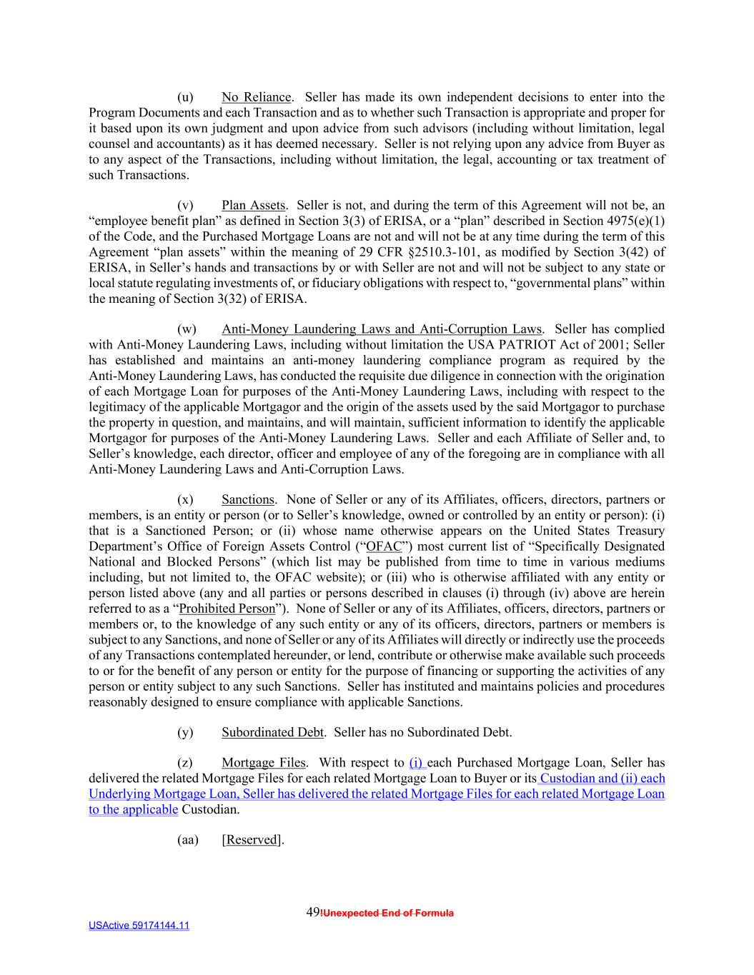 49!Unexpected End of Formula USActive 59174144.11 (u) No Reliance. Seller has made its own independent decisions to enter into the Program Documents and each Transaction and as to whether such Transaction is appropriate and proper for it based upon its own judgment and upon advice from such advisors (including without limitation, legal counsel and accountants) as it has deemed necessary. Seller is not relying upon any advice from Buyer as to any aspect of the Transactions, including without limitation, the legal, accounting or tax treatment of such Transactions. (v) Plan Assets. Seller is not, and during the term of this Agreement will not be, an “employee benefit plan” as defined in Section 3(3) of ERISA, or a “plan” described in Section 4975(e)(1) of the Code, and the Purchased Mortgage Loans are not and will not be at any time during the term of this Agreement “plan assets” within the meaning of 29 CFR §2510.3-101, as modified by Section 3(42) of ERISA, in Seller’s hands and transactions by or with Seller are not and will not be subject to any state or local statute regulating investments of, or fiduciary obligations with respect to, “governmental plans” within the meaning of Section 3(32) of ERISA. (w) Anti-Money Laundering Laws and Anti-Corruption Laws. Seller has complied with Anti-Money Laundering Laws, including without limitation the USA PATRIOT Act of 2001; Seller has established and maintains an anti-money laundering compliance program as required by the Anti-Money Laundering Laws, has conducted the requisite due diligence in connection with the origination of each Mortgage Loan for purposes of the Anti-Money Laundering Laws, including with respect to the legitimacy of the applicable Mortgagor and the origin of the assets used by the said Mortgagor to purchase the property in question, and maintains, and will maintain, sufficient information to identify the applicable Mortgagor for purposes of the Anti-Money Laundering Laws. Seller and each Affiliate of Seller and, to Seller’s knowledge, each director, officer and employee of any of the foregoing are in compliance with all Anti-Money Laundering Laws and Anti-Corruption Laws. (x) Sanctions. None of Seller or any of its Affiliates, officers, directors, partners or members, is an entity or person (or to Seller’s knowledge, owned or controlled by an entity or person): (i) that is a Sanctioned Person; or (ii) whose name otherwise appears on the United States Treasury Department’s Office of Foreign Assets Control (“OFAC”) most current list of “Specifically Designated National and Blocked Persons” (which list may be published from time to time in various mediums including, but not limited to, the OFAC website); or (iii) who is otherwise affiliated with any entity or person listed above (any and all parties or persons described in clauses (i) through (iv) above are herein referred to as a “Prohibited Person”). None of Seller or any of its Affiliates, officers, directors, partners or members or, to the knowledge of any such entity or any of its officers, directors, partners or members is subject to any Sanctions, and none of Seller or any of its Affiliates will directly or indirectly use the proceeds of any Transactions contemplated hereunder, or lend, contribute or otherwise make available such proceeds to or for the benefit of any person or entity for the purpose of financing or supporting the activities of any person or entity subject to any such Sanctions. Seller has instituted and maintains policies and procedures reasonably designed to ensure compliance with applicable Sanctions. (y) Subordinated Debt. Seller has no Subordinated Debt. (z) Mortgage Files. With respect to (i) each Purchased Mortgage Loan, Seller has delivered the related Mortgage Files for each related Mortgage Loan to Buyer or its Custodian and (ii) each Underlying Mortgage Loan, Seller has delivered the related Mortgage Files for each related Mortgage Loan to the applicable Custodian. (aa) [Reserved].