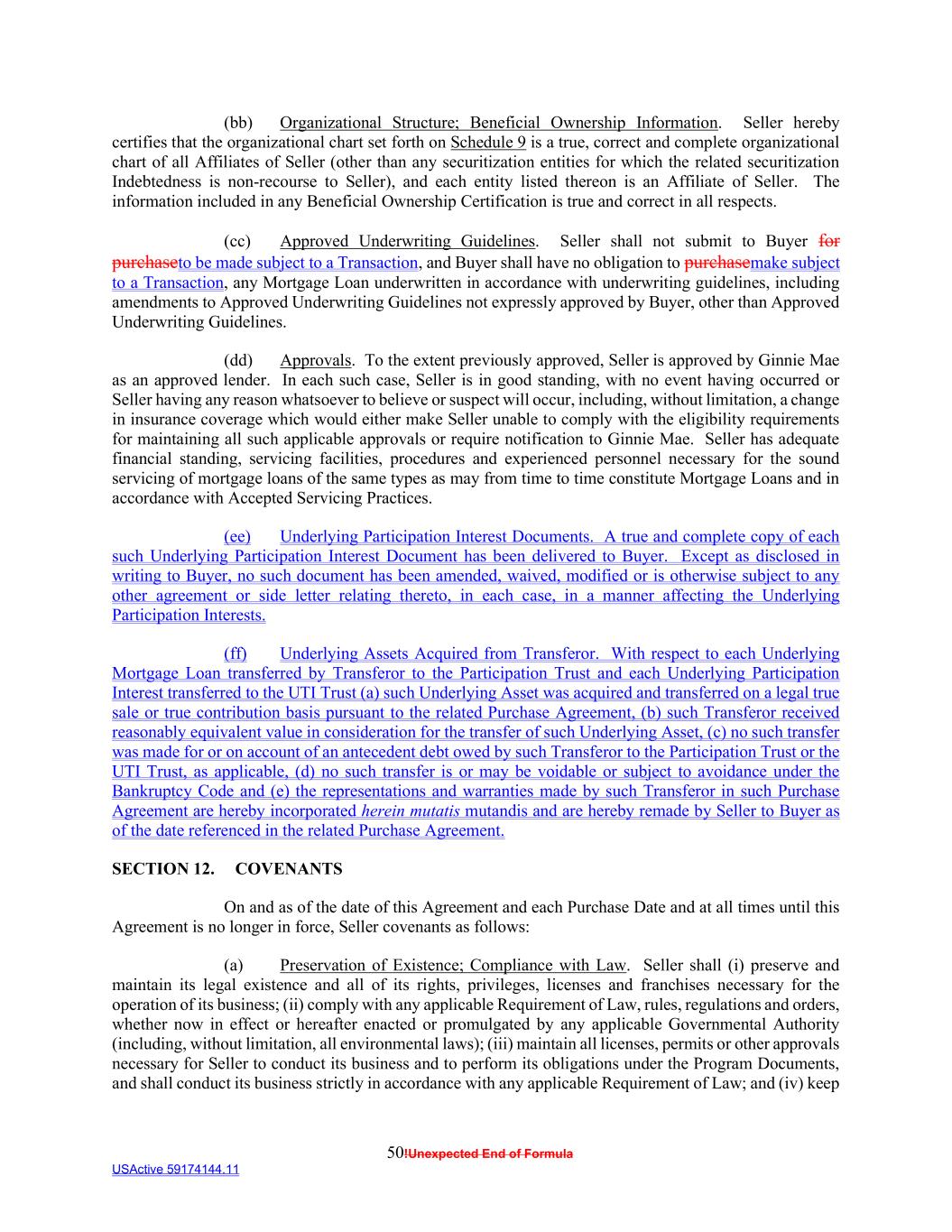 50!Unexpected End of Formula USActive 59174144.11 (bb) Organizational Structure; Beneficial Ownership Information. Seller hereby certifies that the organizational chart set forth on Schedule 9 is a true, correct and complete organizational chart of all Affiliates of Seller (other than any securitization entities for which the related securitization Indebtedness is non-recourse to Seller), and each entity listed thereon is an Affiliate of Seller. The information included in any Beneficial Ownership Certification is true and correct in all respects. (cc) Approved Underwriting Guidelines. Seller shall not submit to Buyer for purchaseto be made subject to a Transaction, and Buyer shall have no obligation to purchasemake subject to a Transaction, any Mortgage Loan underwritten in accordance with underwriting guidelines, including amendments to Approved Underwriting Guidelines not expressly approved by Buyer, other than Approved Underwriting Guidelines. (dd) Approvals. To the extent previously approved, Seller is approved by Ginnie Mae as an approved lender. In each such case, Seller is in good standing, with no event having occurred or Seller having any reason whatsoever to believe or suspect will occur, including, without limitation, a change in insurance coverage which would either make Seller unable to comply with the eligibility requirements for maintaining all such applicable approvals or require notification to Ginnie Mae. Seller has adequate financial standing, servicing facilities, procedures and experienced personnel necessary for the sound servicing of mortgage loans of the same types as may from time to time constitute Mortgage Loans and in accordance with Accepted Servicing Practices. (ee) Underlying Participation Interest Documents. A true and complete copy of each such Underlying Participation Interest Document has been delivered to Buyer. Except as disclosed in writing to Buyer, no such document has been amended, waived, modified or is otherwise subject to any other agreement or side letter relating thereto, in each case, in a manner affecting the Underlying Participation Interests. (ff) Underlying Assets Acquired from Transferor. With respect to each Underlying Mortgage Loan transferred by Transferor to the Participation Trust and each Underlying Participation Interest transferred to the UTI Trust (a) such Underlying Asset was acquired and transferred on a legal true sale or true contribution basis pursuant to the related Purchase Agreement, (b) such Transferor received reasonably equivalent value in consideration for the transfer of such Underlying Asset, (c) no such transfer was made for or on account of an antecedent debt owed by such Transferor to the Participation Trust or the UTI Trust, as applicable, (d) no such transfer is or may be voidable or subject to avoidance under the Bankruptcy Code and (e) the representations and warranties made by such Transferor in such Purchase Agreement are hereby incorporated herein mutatis mutandis and are hereby remade by Seller to Buyer as of the date referenced in the related Purchase Agreement. SECTION 12. COVENANTS On and as of the date of this Agreement and each Purchase Date and at all times until this Agreement is no longer in force, Seller covenants as follows: (a) Preservation of Existence; Compliance with Law. Seller shall (i) preserve and maintain its legal existence and all of its rights, privileges, licenses and franchises necessary for the operation of its business; (ii) comply with any applicable Requirement of Law, rules, regulations and orders, whether now in effect or hereafter enacted or promulgated by any applicable Governmental Authority (including, without limitation, all environmental laws); (iii) maintain all licenses, permits or other approvals necessary for Seller to conduct its business and to perform its obligations under the Program Documents, and shall conduct its business strictly in accordance with any applicable Requirement of Law; and (iv) keep