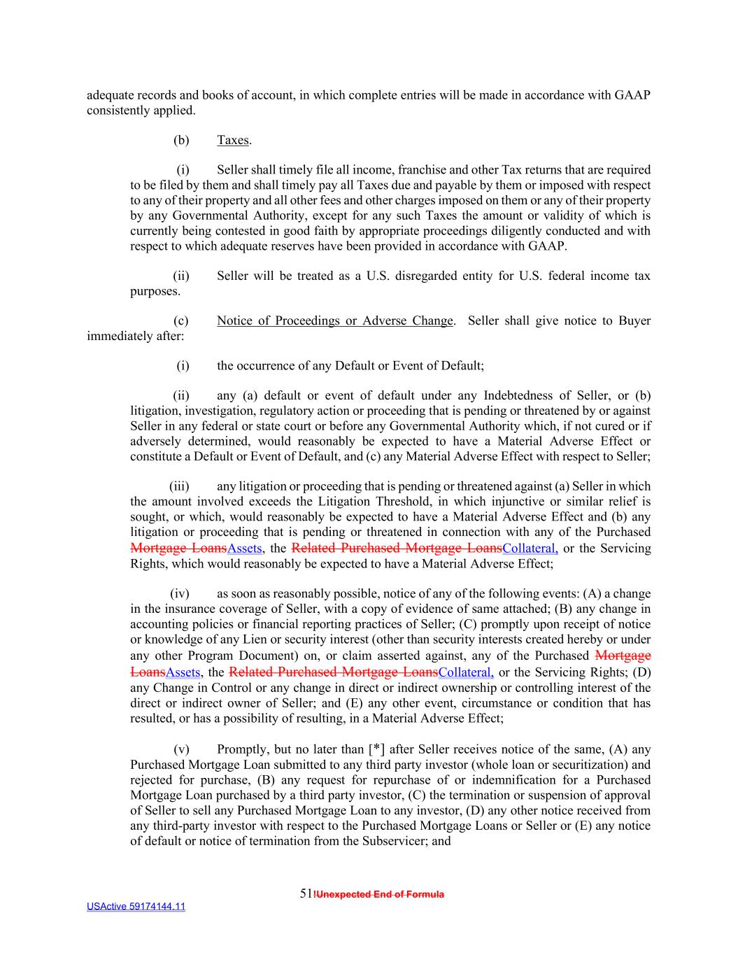 51!Unexpected End of Formula USActive 59174144.11 adequate records and books of account, in which complete entries will be made in accordance with GAAP consistently applied. (b) Taxes. (i) Seller shall timely file all income, franchise and other Tax returns that are required to be filed by them and shall timely pay all Taxes due and payable by them or imposed with respect to any of their property and all other fees and other charges imposed on them or any of their property by any Governmental Authority, except for any such Taxes the amount or validity of which is currently being contested in good faith by appropriate proceedings diligently conducted and with respect to which adequate reserves have been provided in accordance with GAAP. (ii) Seller will be treated as a U.S. disregarded entity for U.S. federal income tax purposes. (c) Notice of Proceedings or Adverse Change. Seller shall give notice to Buyer immediately after: (i) the occurrence of any Default or Event of Default; (ii) any (a) default or event of default under any Indebtedness of Seller, or (b) litigation, investigation, regulatory action or proceeding that is pending or threatened by or against Seller in any federal or state court or before any Governmental Authority which, if not cured or if adversely determined, would reasonably be expected to have a Material Adverse Effect or constitute a Default or Event of Default, and (c) any Material Adverse Effect with respect to Seller; (iii) any litigation or proceeding that is pending or threatened against (a) Seller in which the amount involved exceeds the Litigation Threshold, in which injunctive or similar relief is sought, or which, would reasonably be expected to have a Material Adverse Effect and (b) any litigation or proceeding that is pending or threatened in connection with any of the Purchased Mortgage LoansAssets, the Related Purchased Mortgage LoansCollateral, or the Servicing Rights, which would reasonably be expected to have a Material Adverse Effect; (iv) as soon as reasonably possible, notice of any of the following events: (A) a change in the insurance coverage of Seller, with a copy of evidence of same attached; (B) any change in accounting policies or financial reporting practices of Seller; (C) promptly upon receipt of notice or knowledge of any Lien or security interest (other than security interests created hereby or under any other Program Document) on, or claim asserted against, any of the Purchased Mortgage LoansAssets, the Related Purchased Mortgage LoansCollateral, or the Servicing Rights; (D) any Change in Control or any change in direct or indirect ownership or controlling interest of the direct or indirect owner of Seller; and (E) any other event, circumstance or condition that has resulted, or has a possibility of resulting, in a Material Adverse Effect; (v) Promptly, but no later than [*] after Seller receives notice of the same, (A) any Purchased Mortgage Loan submitted to any third party investor (whole loan or securitization) and rejected for purchase, (B) any request for repurchase of or indemnification for a Purchased Mortgage Loan purchased by a third party investor, (C) the termination or suspension of approval of Seller to sell any Purchased Mortgage Loan to any investor, (D) any other notice received from any third-party investor with respect to the Purchased Mortgage Loans or Seller or (E) any notice of default or notice of termination from the Subservicer; and
